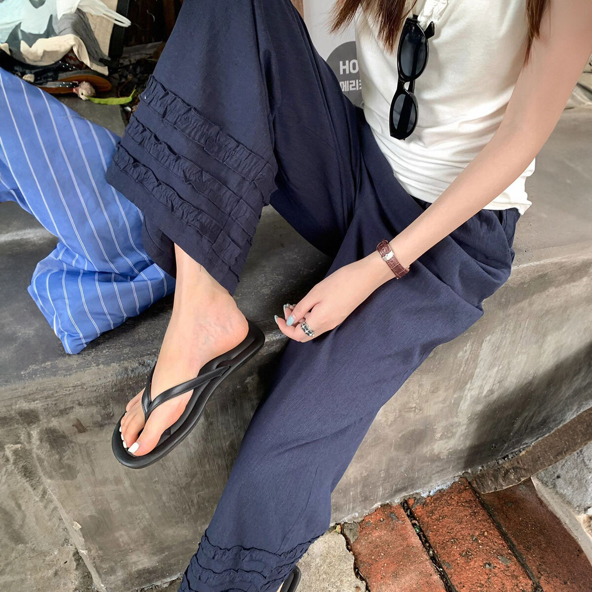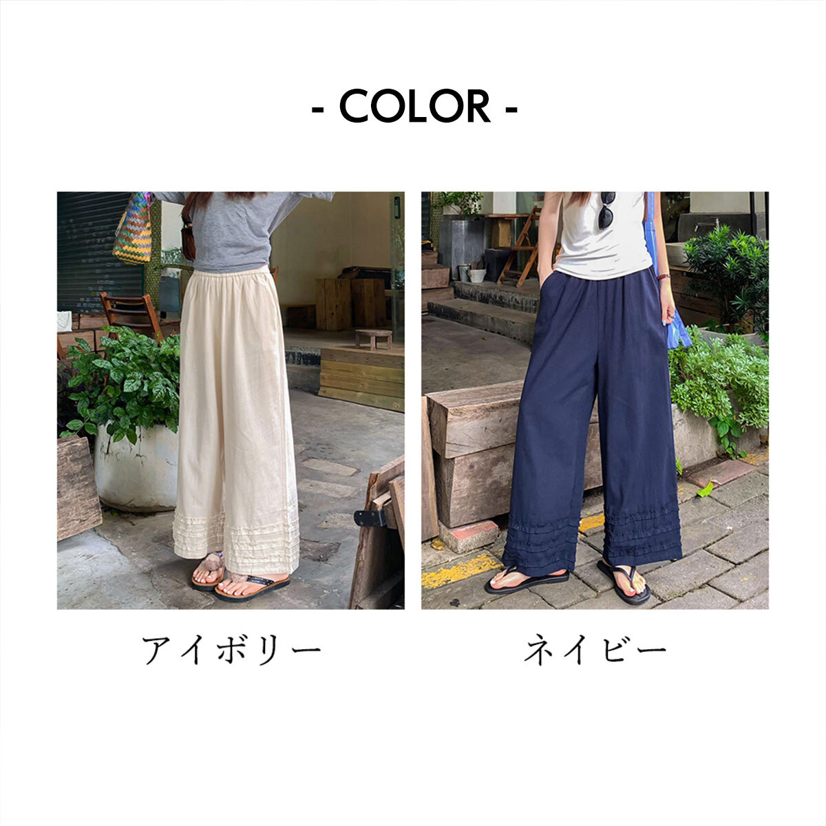 ◇裾フリルと落ち感が魅力的なワイドパンツ。