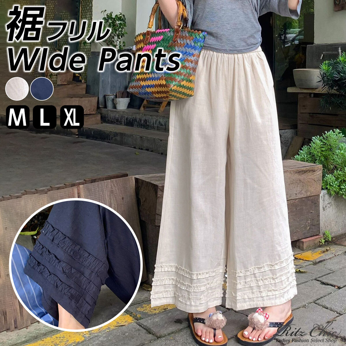 裾フリル ワイドパンツ 韓国 レディース 春秋 きれいめ ゆったり リラックス ウエストゴム 大人 カジュアル アンクルパンツ 9分丈 大人可愛い 大人女子