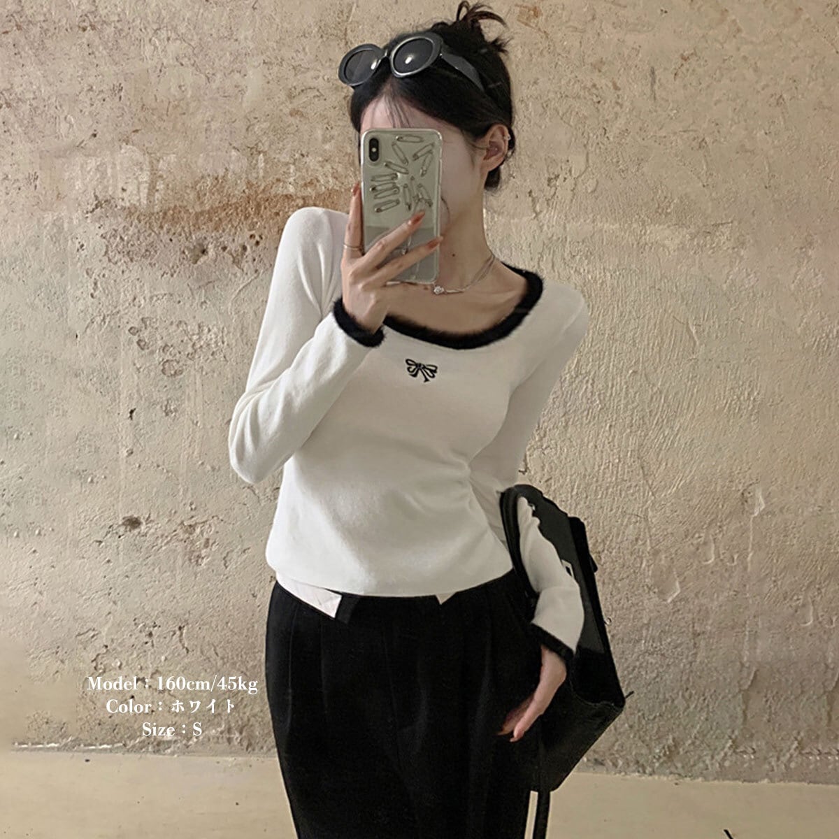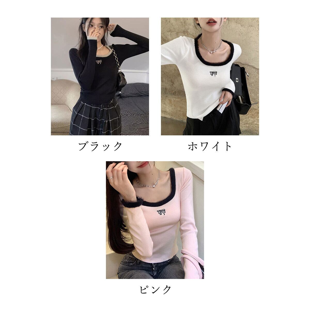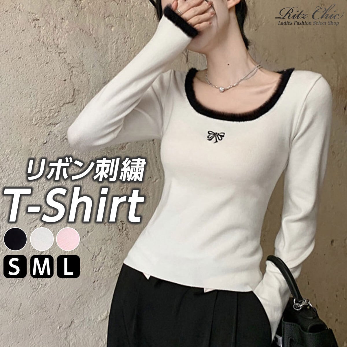 Tシャツ 長袖 リボン 刺繍 ショート丈 レディース 秋冬 韓国 トップス きれいめ シンプル 大人 カジュアル カットソー バイカラー インナー 大人可愛い 大人女子