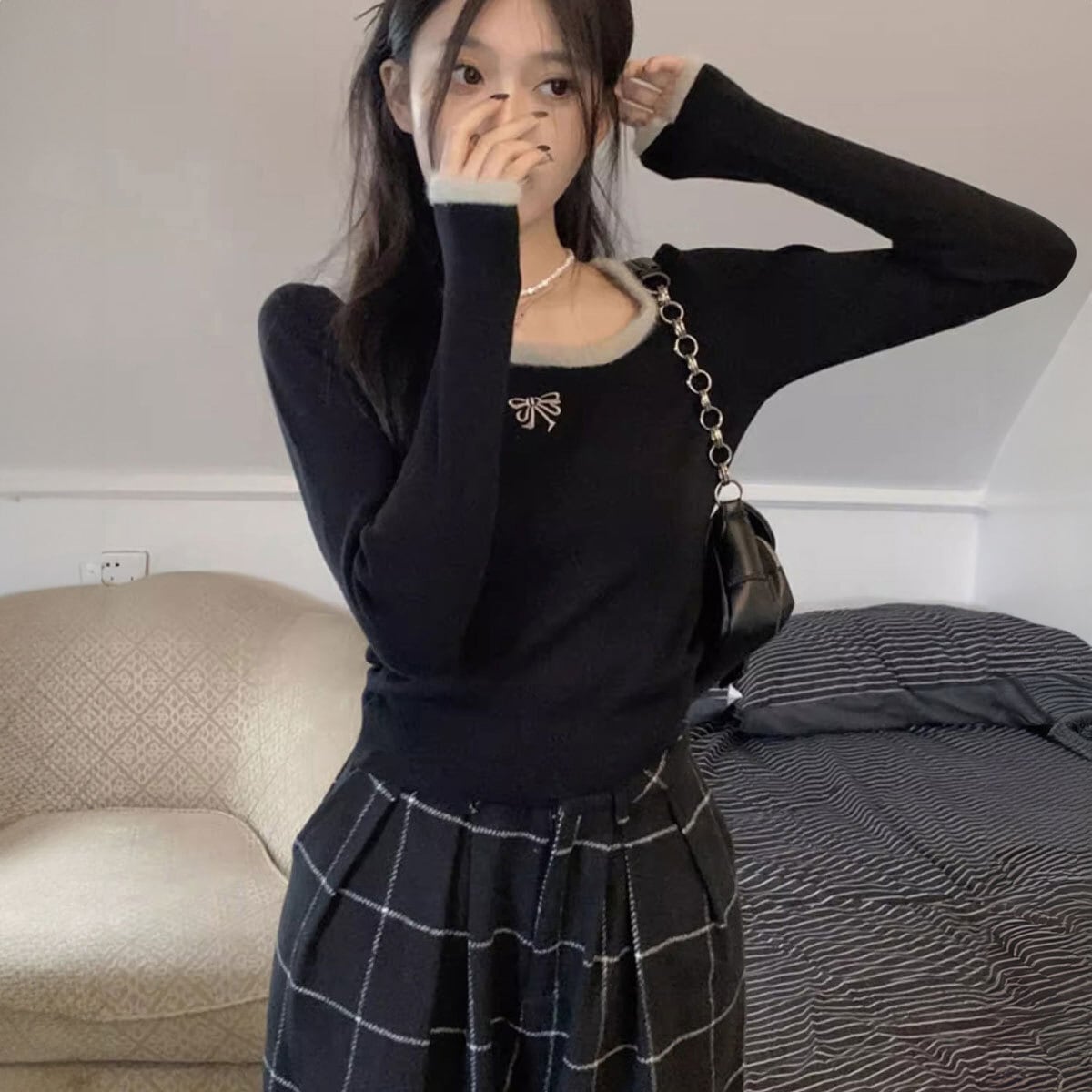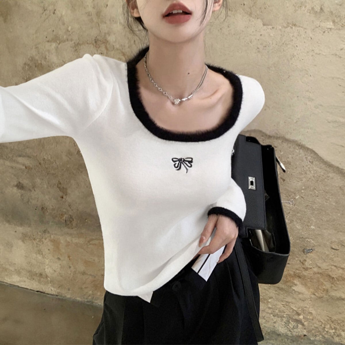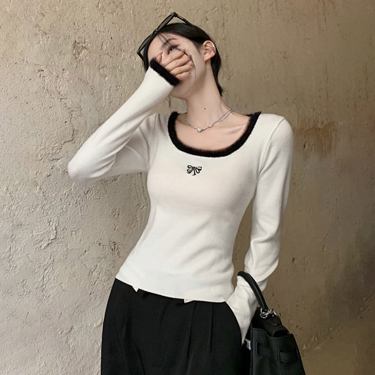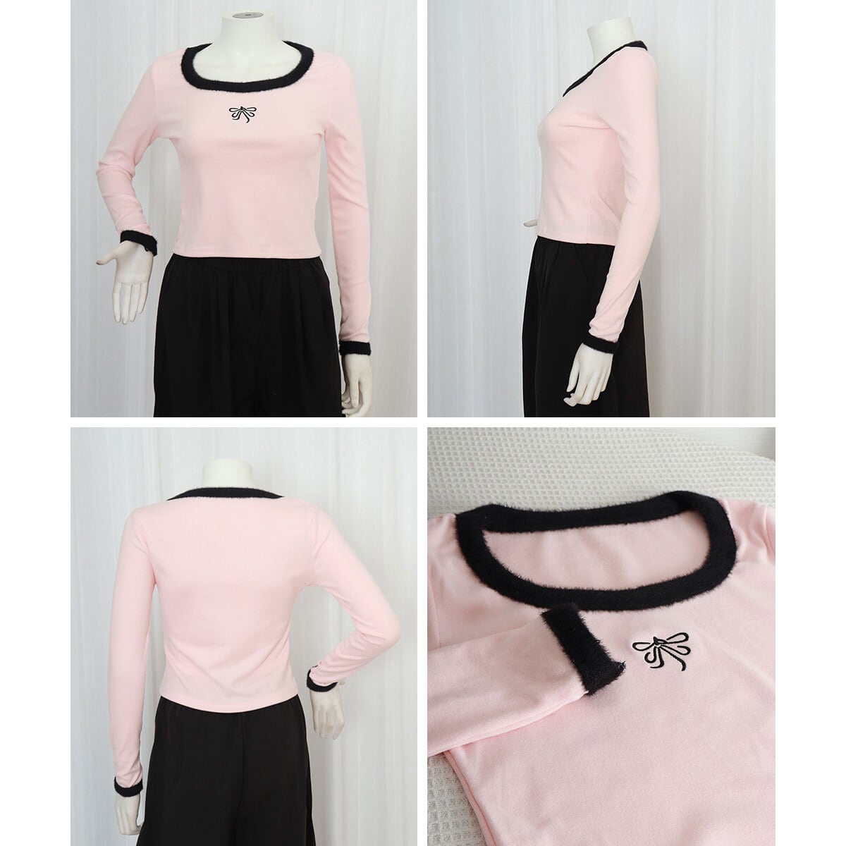 Tシャツ 長袖 リボン 刺繍 ショート丈 レディース 秋冬 韓国 トップス きれいめ シンプル 大人 カジュアル カットソー バイカラー インナー 大人可愛い 大人女子