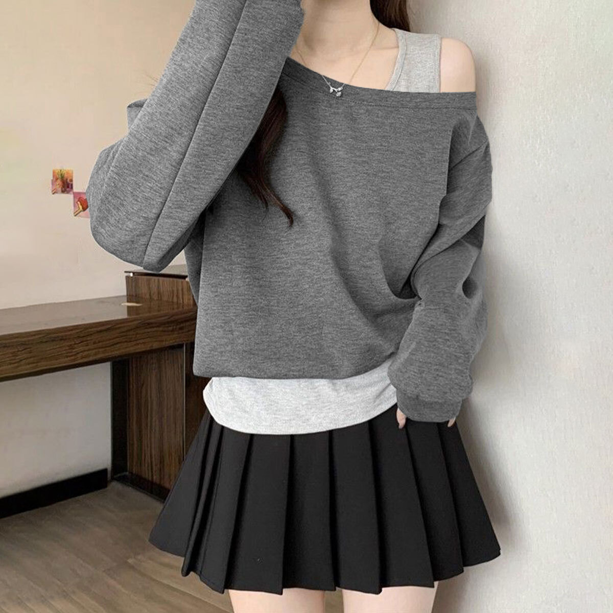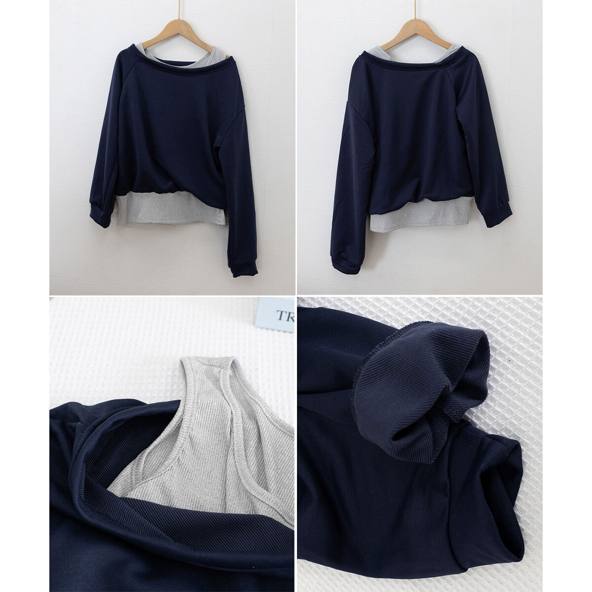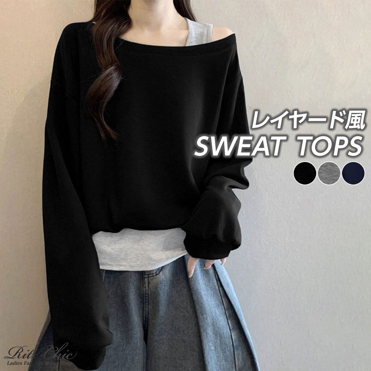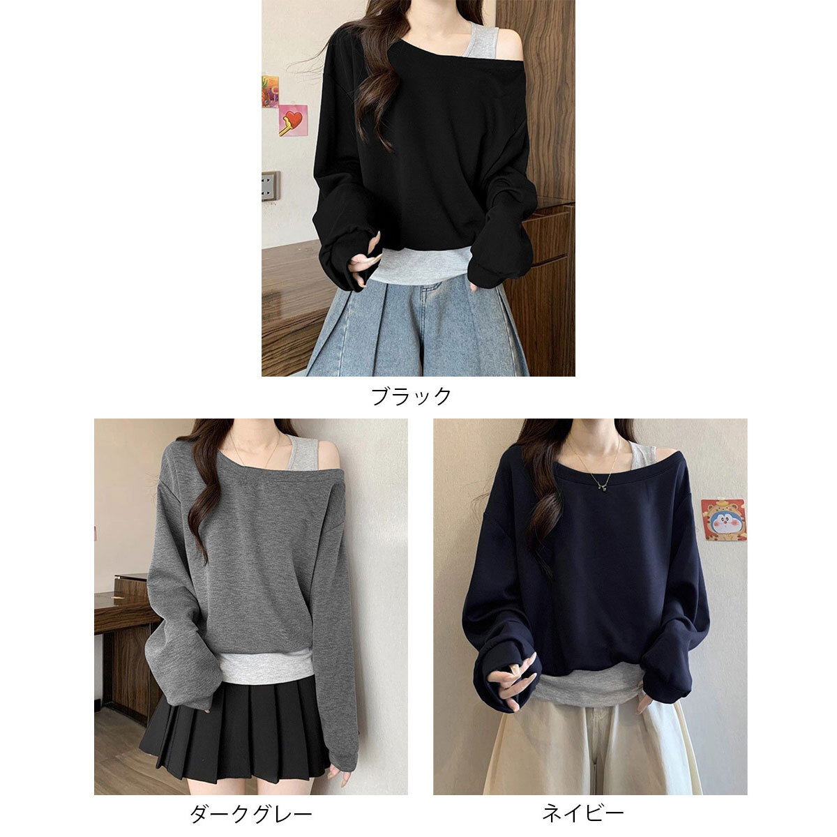 ワンショルダー スウェット トップス レイヤード風 レディース 春秋 韓国 大人 カジュアル ストリート 原宿系 おしゃれ 重ね着風 長袖 ゆったり 体型カバー 大人可愛い 大人女子