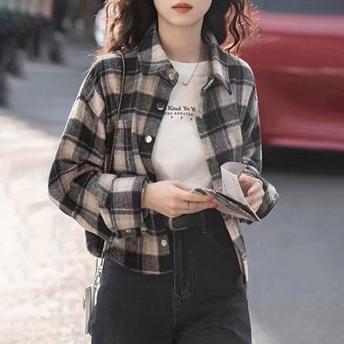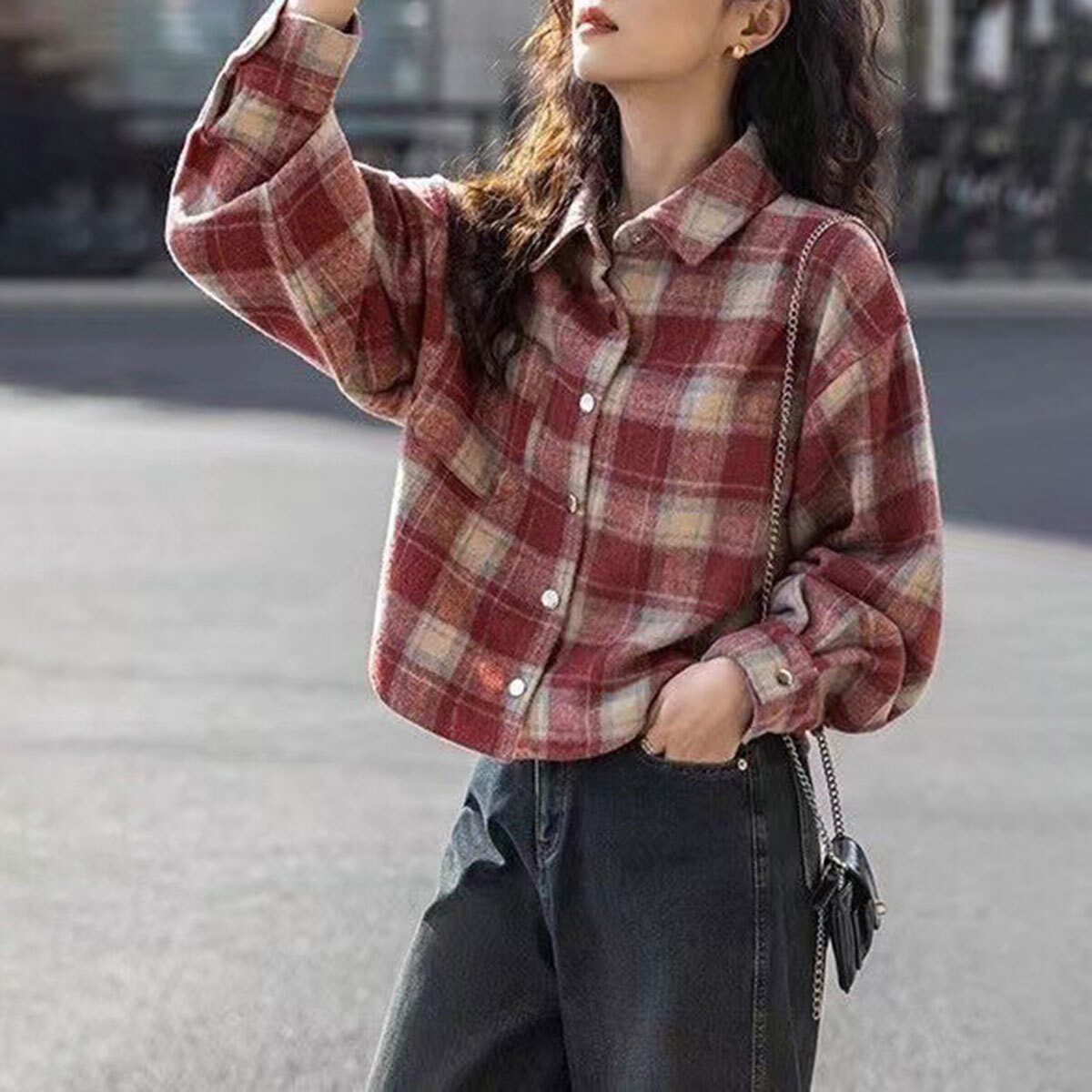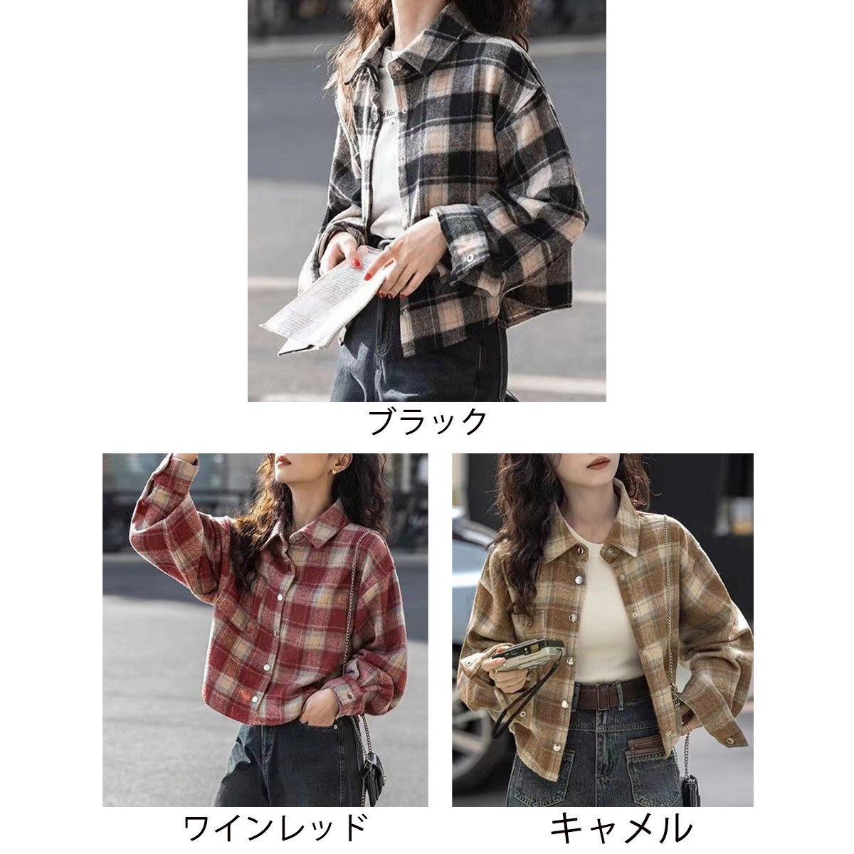 チェック柄 シャツ 長袖 ショート丈 レディース 春秋 韓国 トップス 羽織り おしゃれ 大人 カジュアル ドロップショルダー ゆったり 体型カバー ライトアウター 襟付き 長袖シャツ 大人可愛い 大人女子