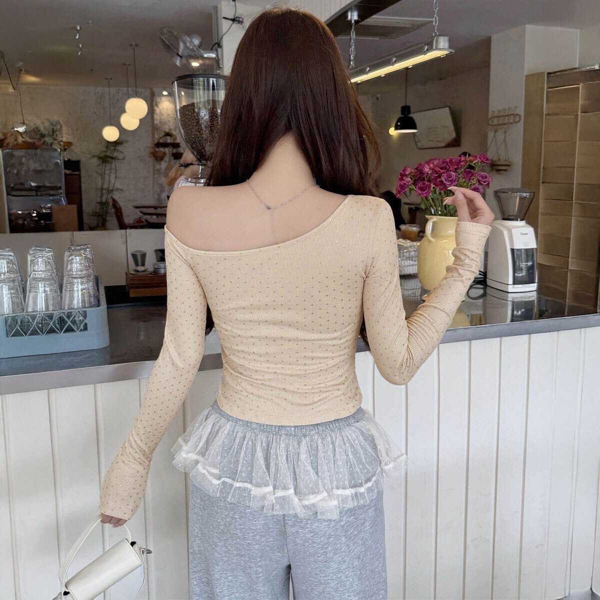 キラキラと煌めくラメをあしらい、アシンメトリーなデザインが韓国風のトレンド感を引き立ててくれるワンショルダーの長袖Tシャツです。