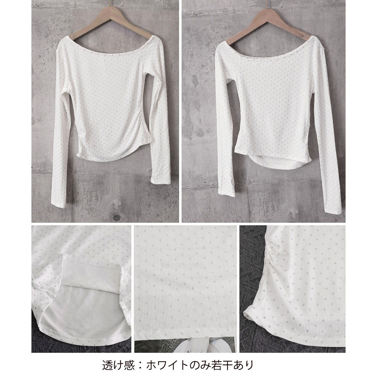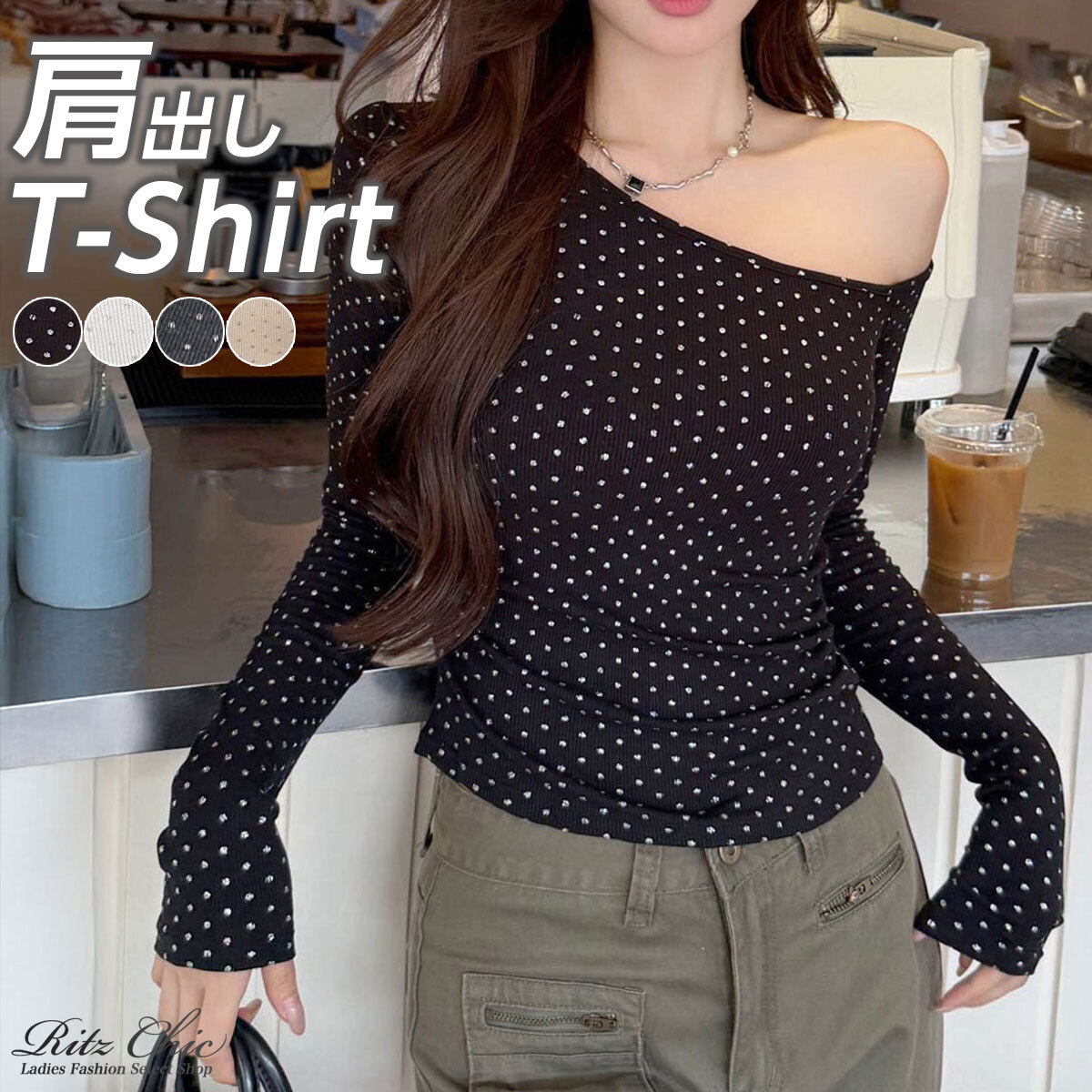 肩出し 長袖 Tシャツ レディース 春秋 韓国 トップス おしゃれ 大人 かわいい きれいめ オフショルダー 水玉 ドット柄 カットソー タイト アシンメトリー 大人可愛い 大人女子