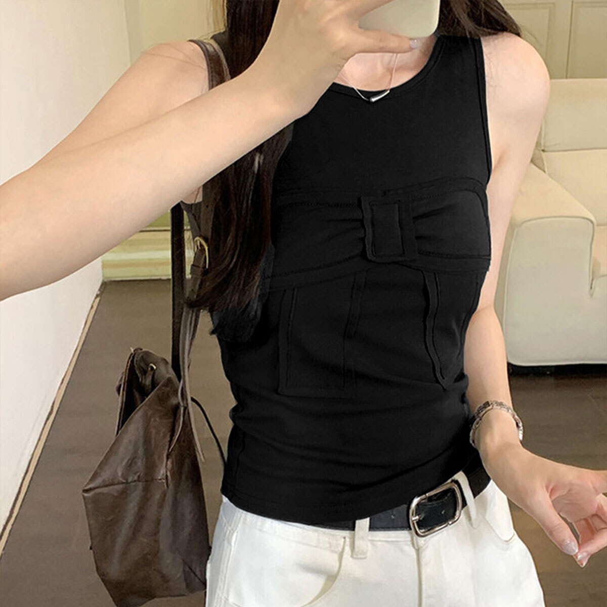フロントの大きなリボンが可愛らしさを演出し、カップ付きのノンワイヤー仕様で、ブラなしでも締め付け感がなく快適に着用できるタンクトップです。