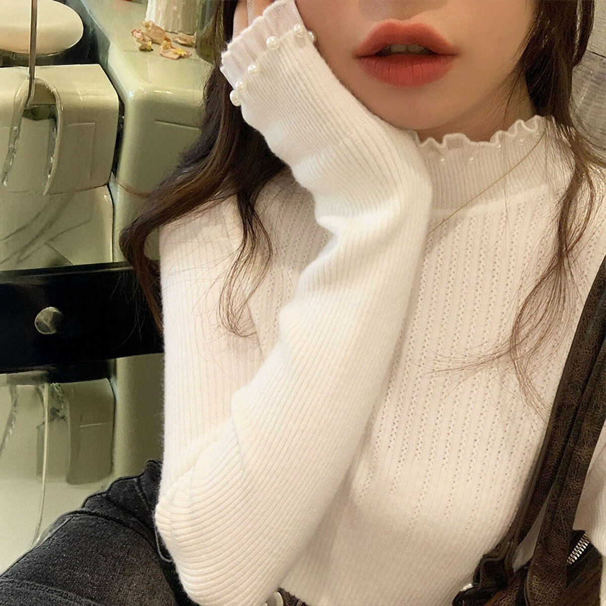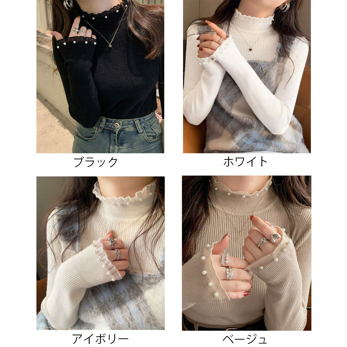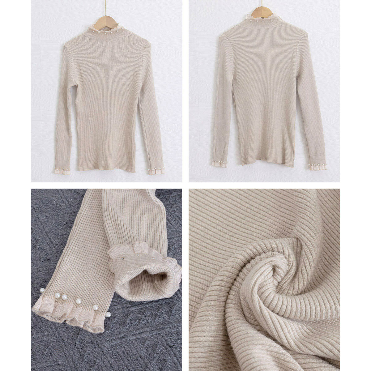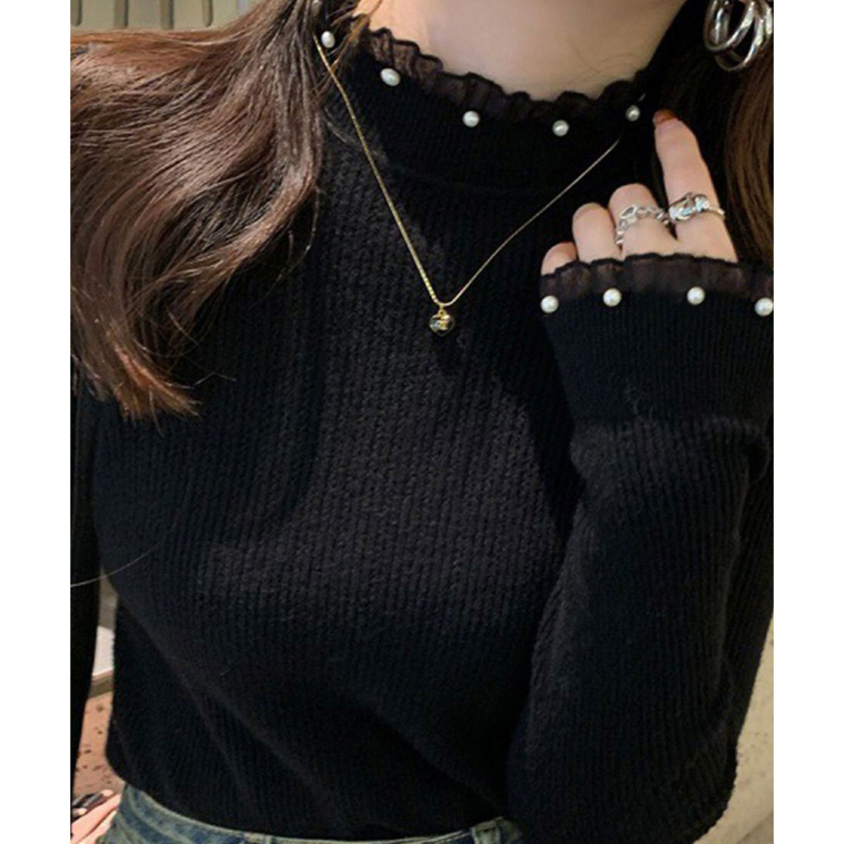 ◇パールをあしらったフェミニンな印象のリブニットトップス。
