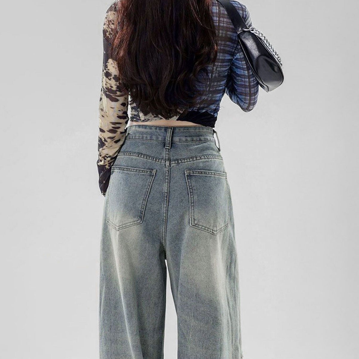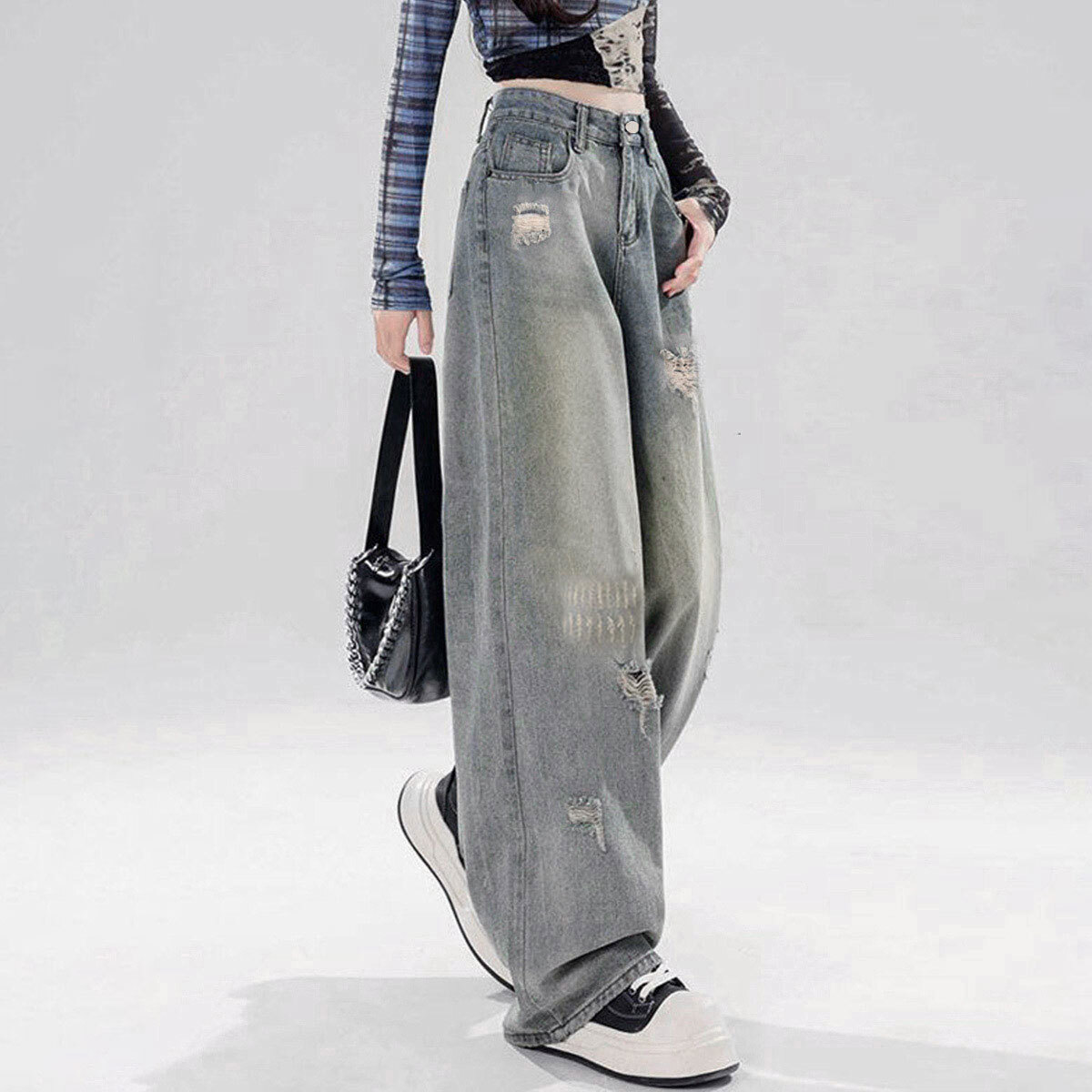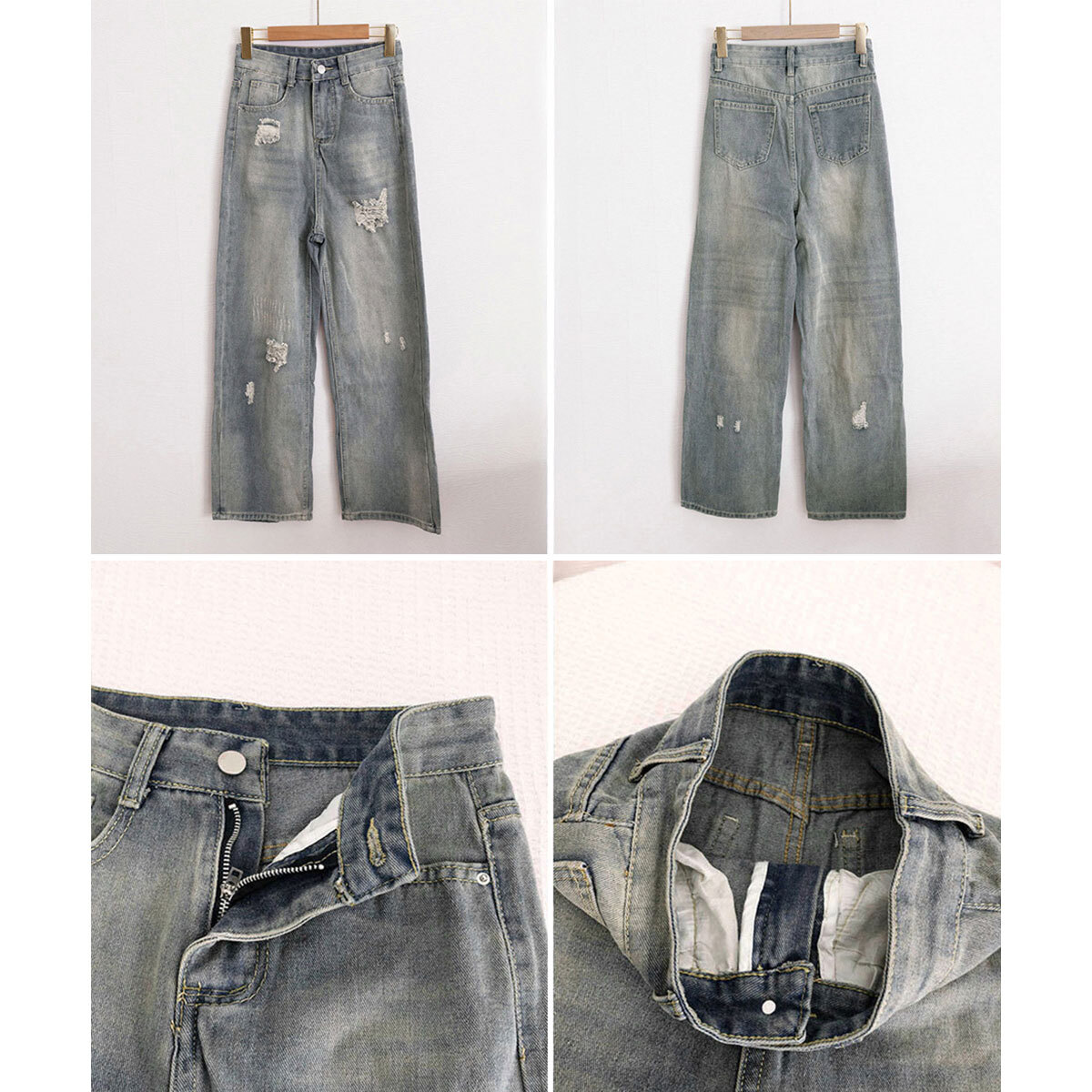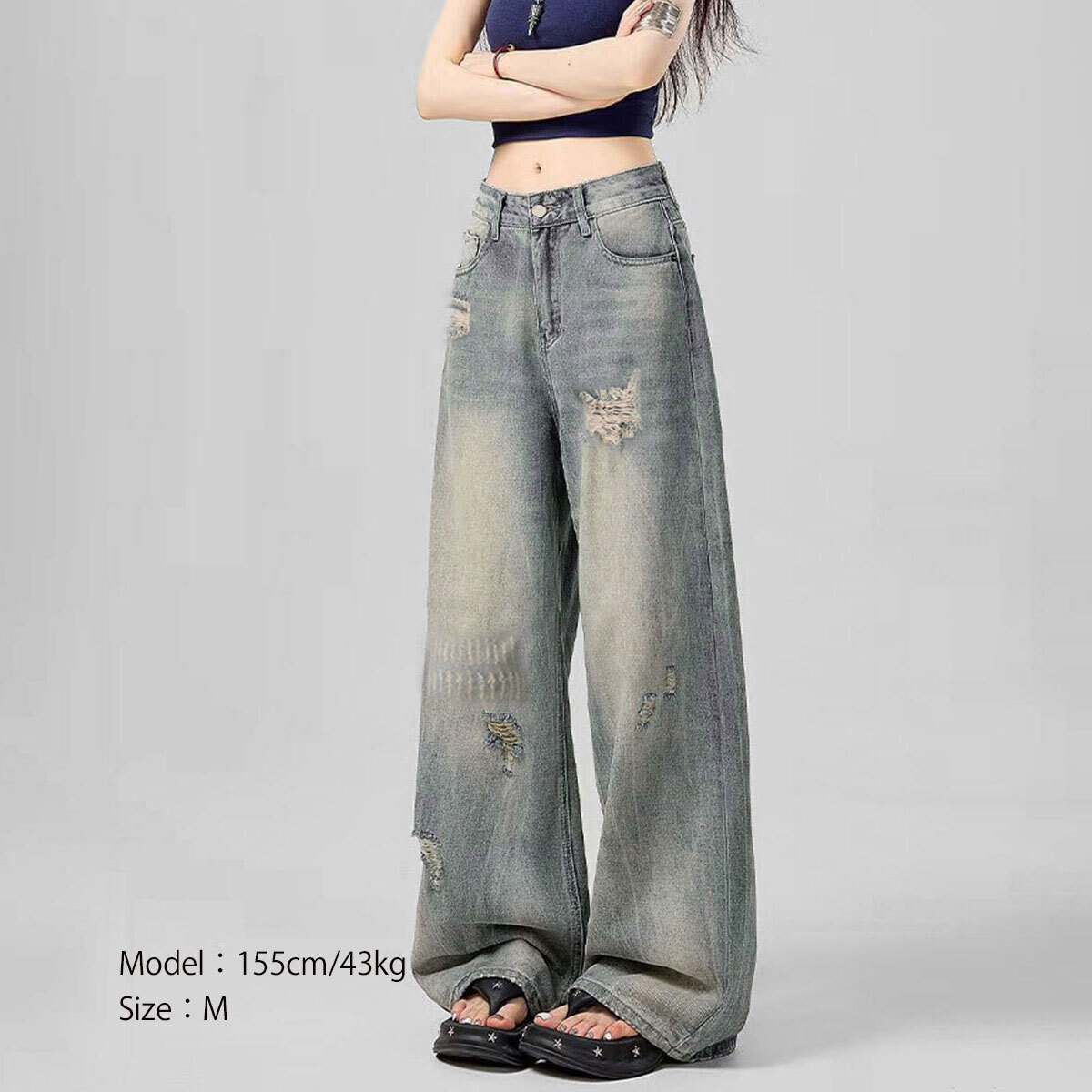 ダメージ デニム レディース ジーンズ 韓国 ウォッシュ加工 大人 カジュアル ストリート 原宿系 アメカジ ハイウエスト ゆったり 体型カバー ヴィンテージ風 おしゃれ デニムパンツ 大人可愛い 大人女子
