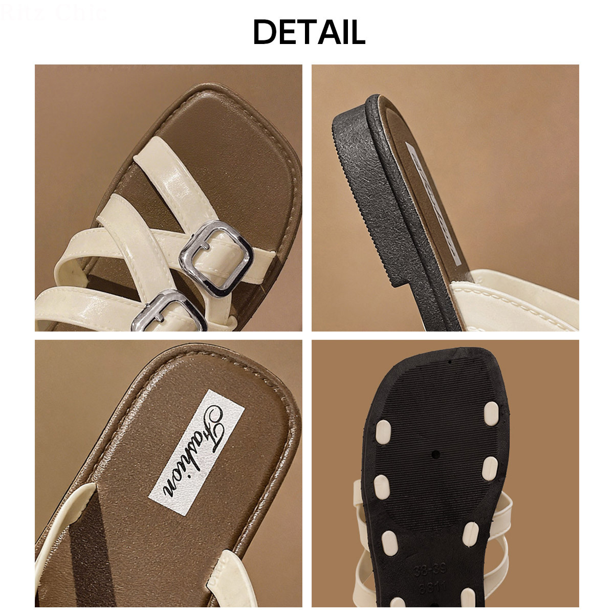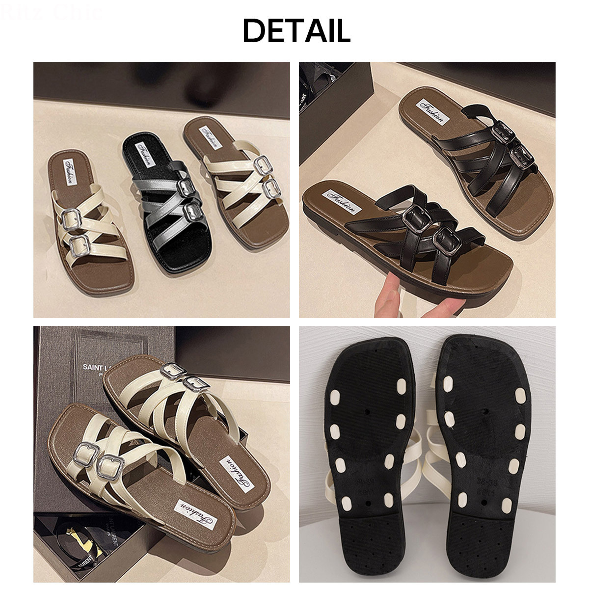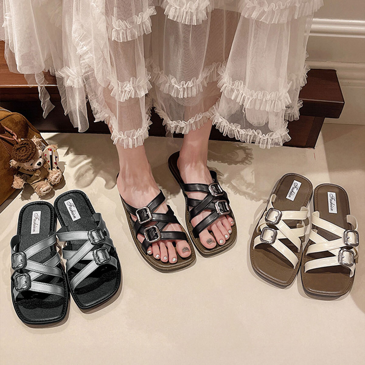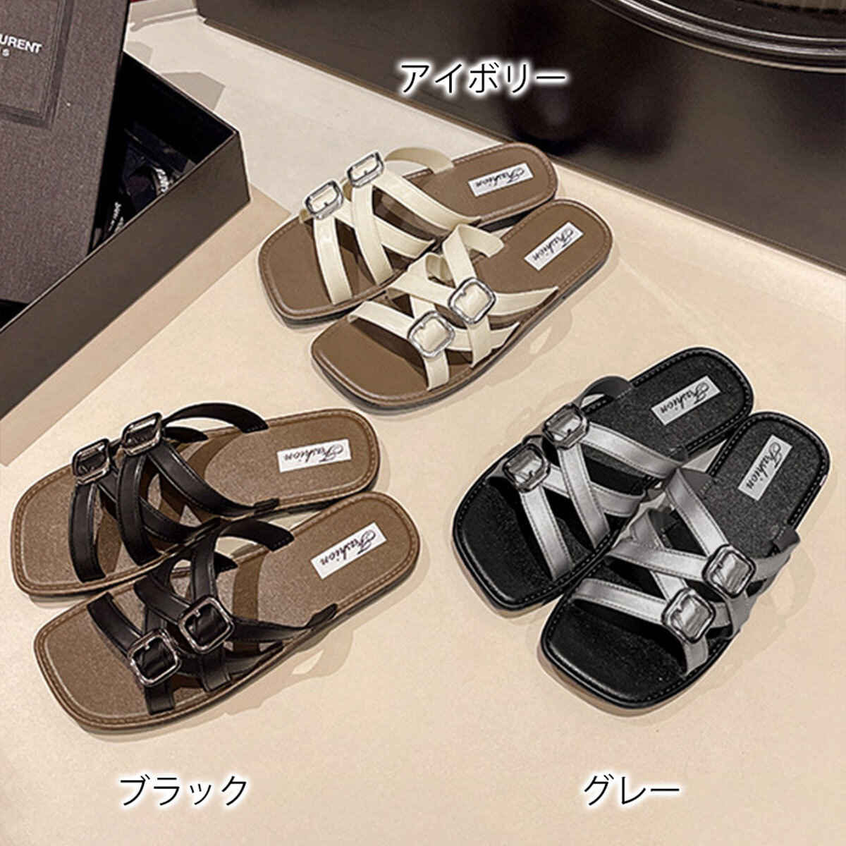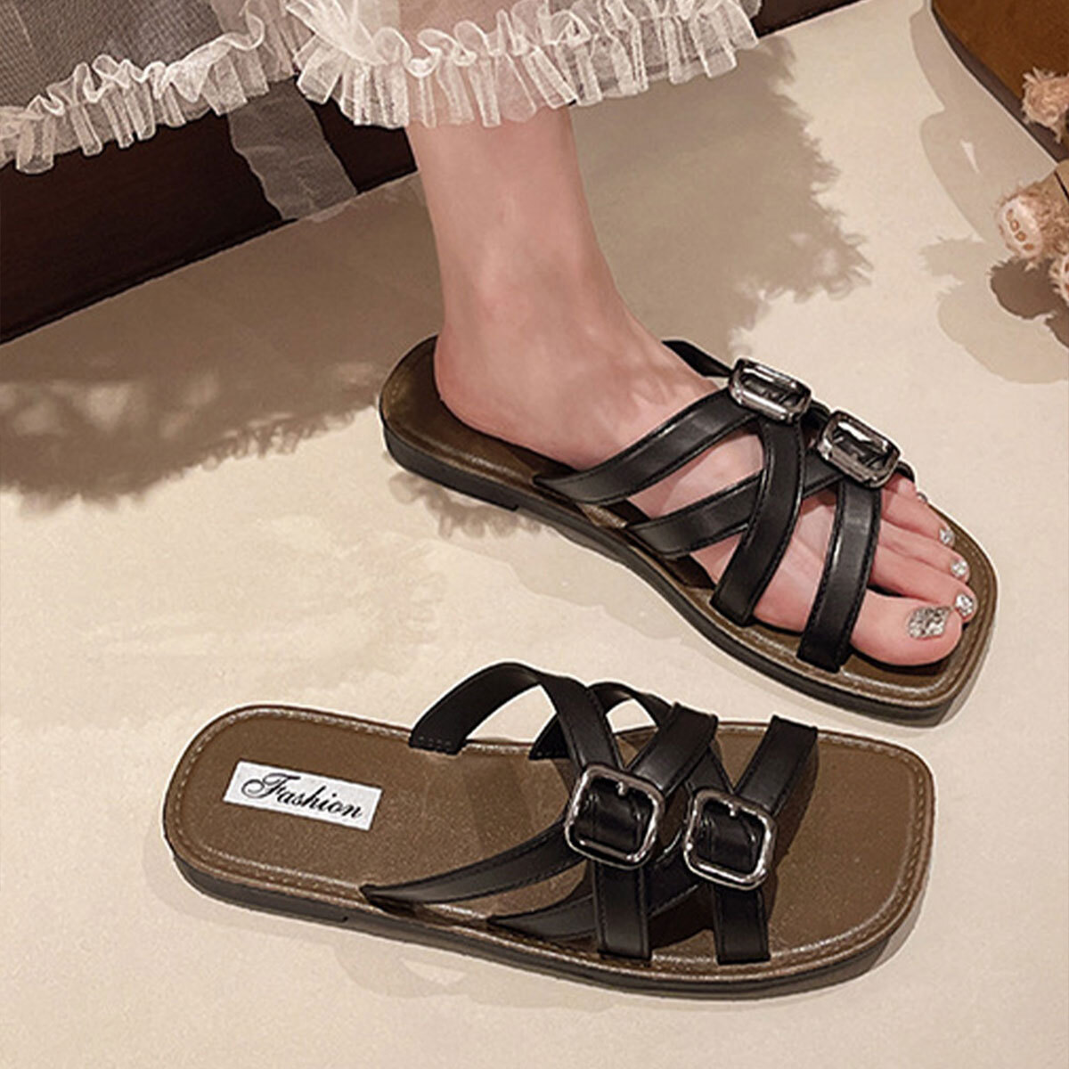 ◇ダブルバックル仕様のフラットサンダル。