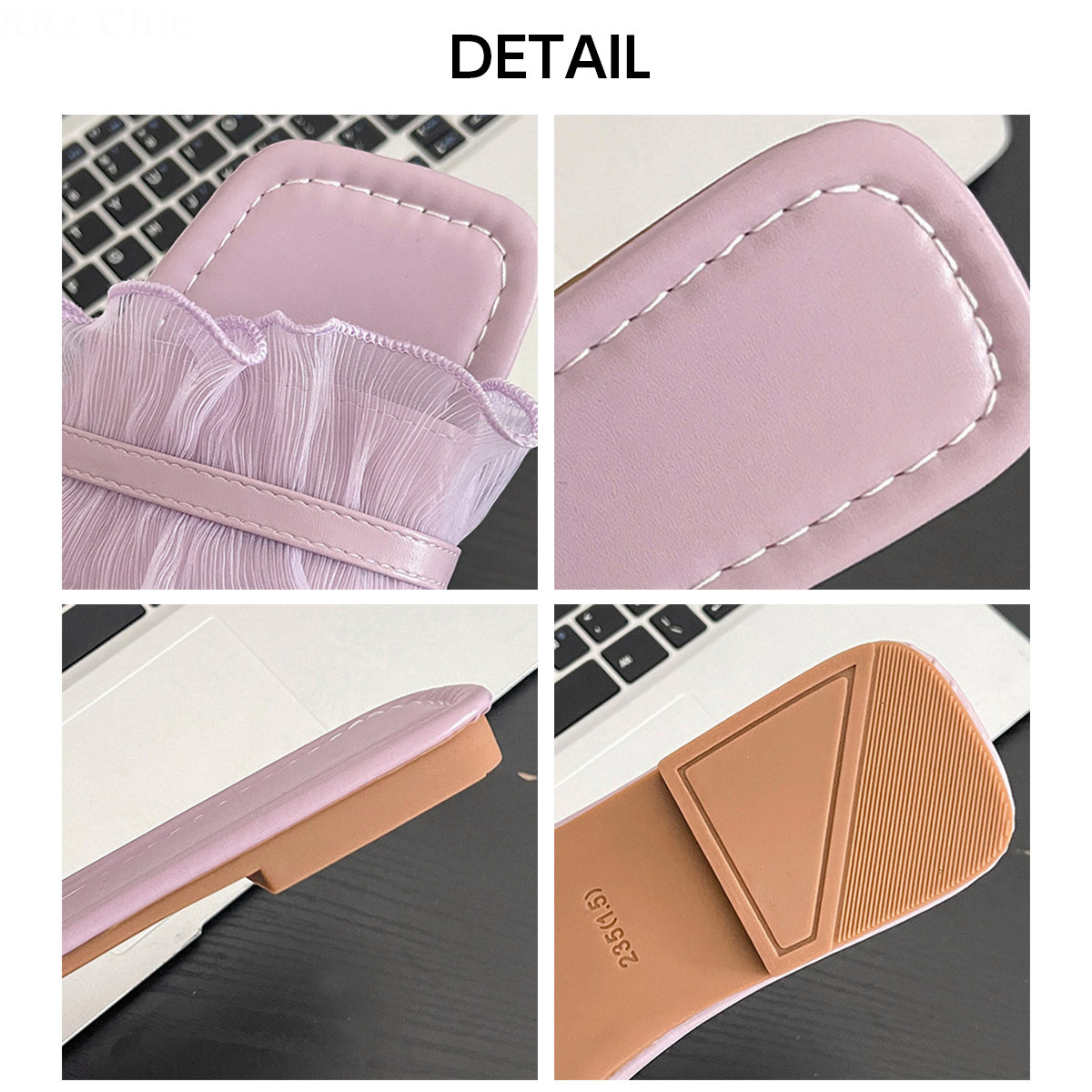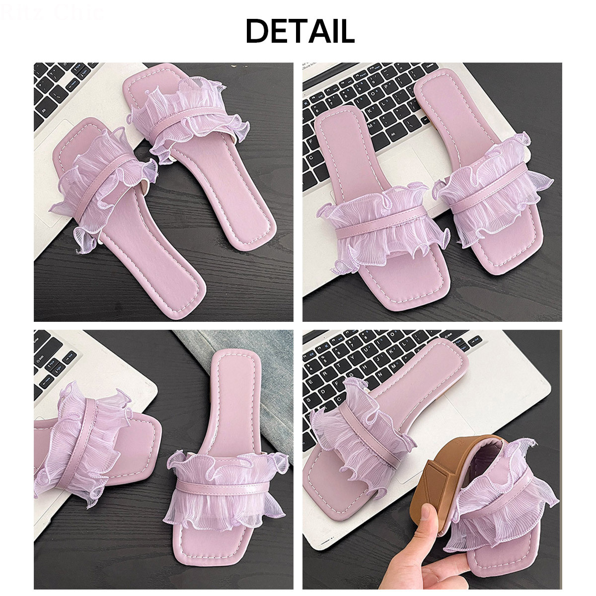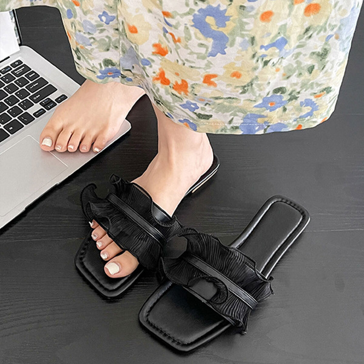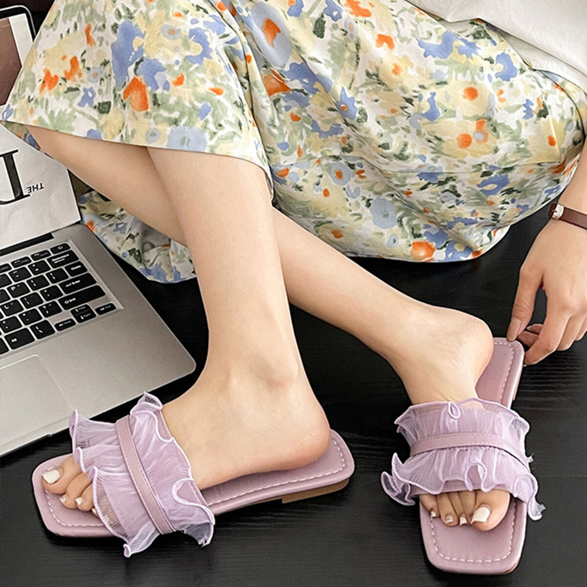 シアーフリル サンダル スクエアトゥ レディース 春夏 フラットサンダル おしゃれ きれいめ 大人 かわいい フェミニン 軽量 歩きやすい 疲れにくい ぺたんこ ミュールサンダル 大人可愛い 大人女子
