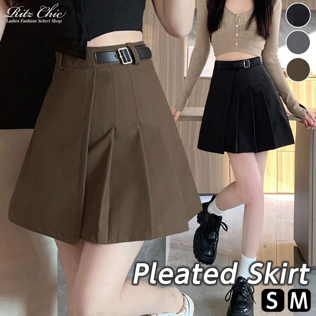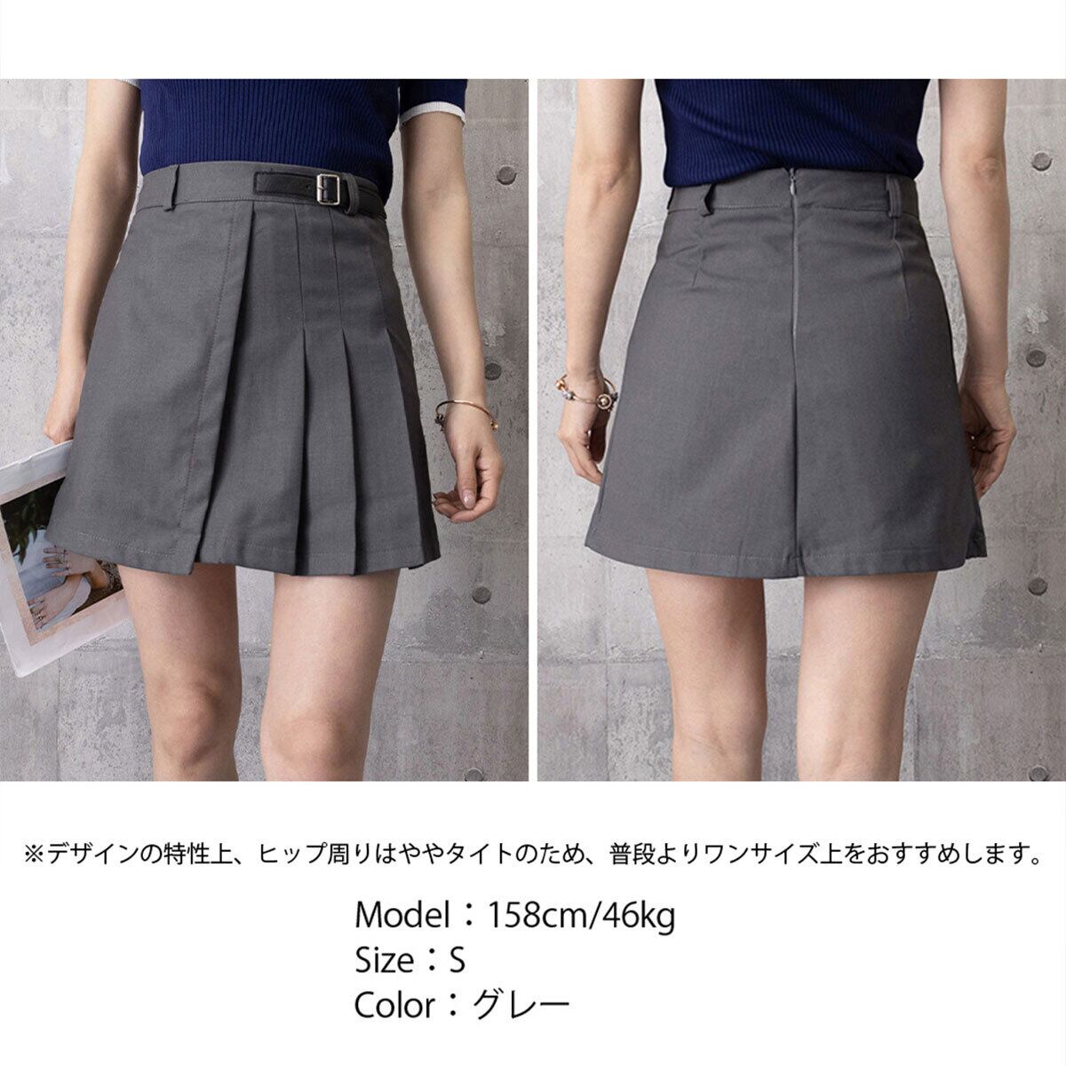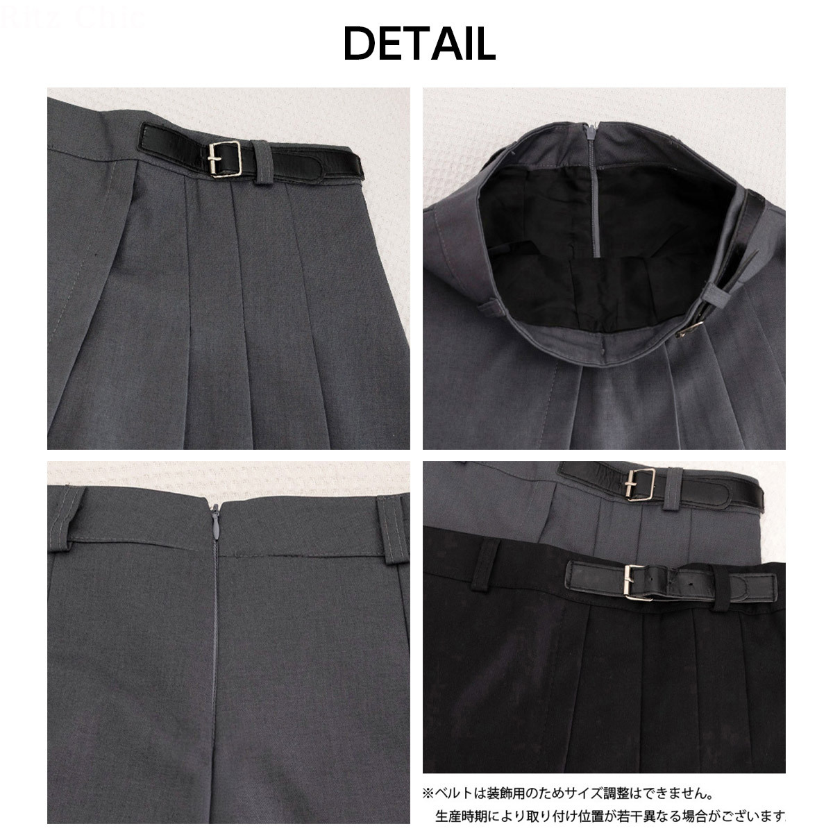 飾りベルトがカジュアルなアクセントになり、フェミニンなスタイルからきれいめなスタイルまで、大人っぽいお洒落を楽しめるミニ丈のプリーツスカートです。