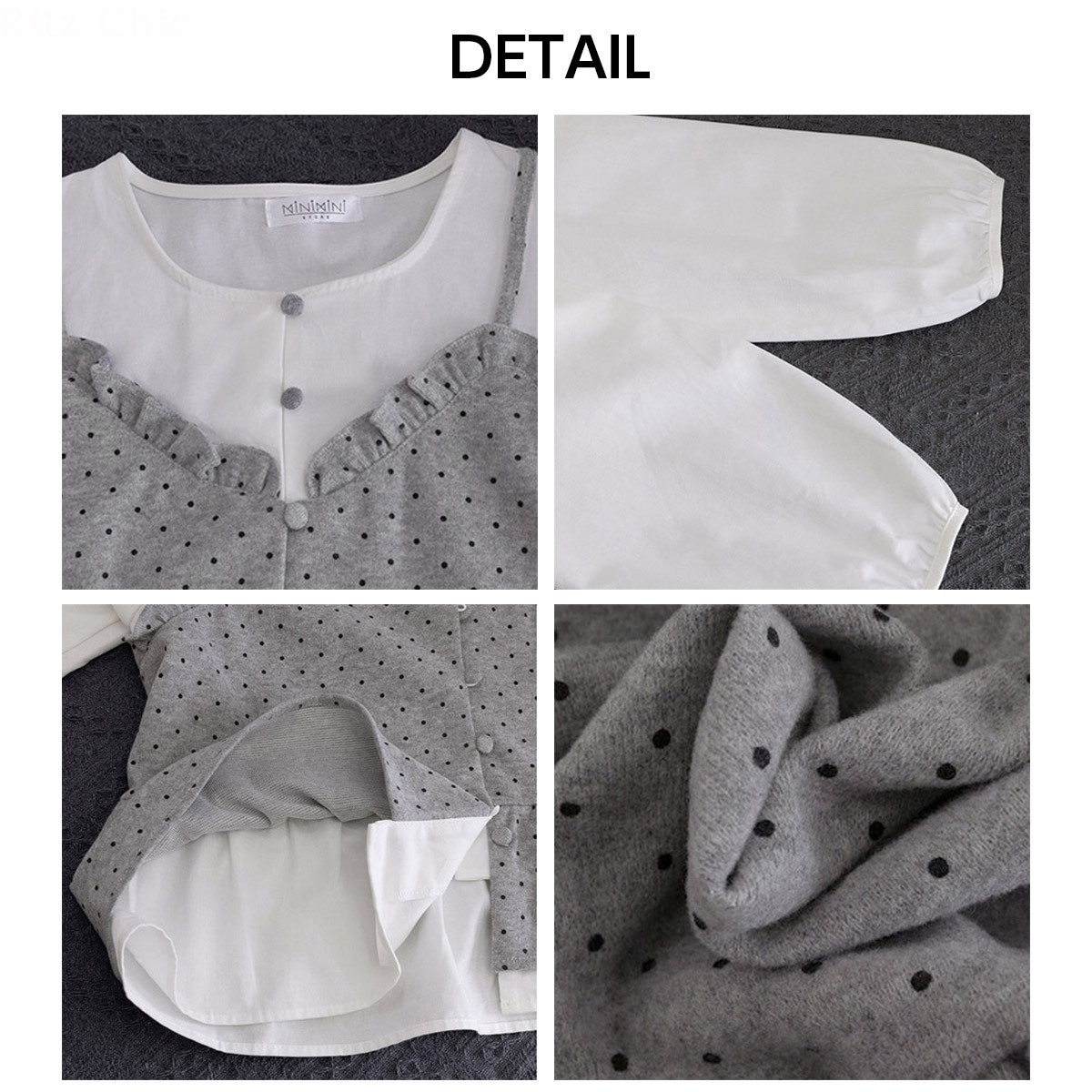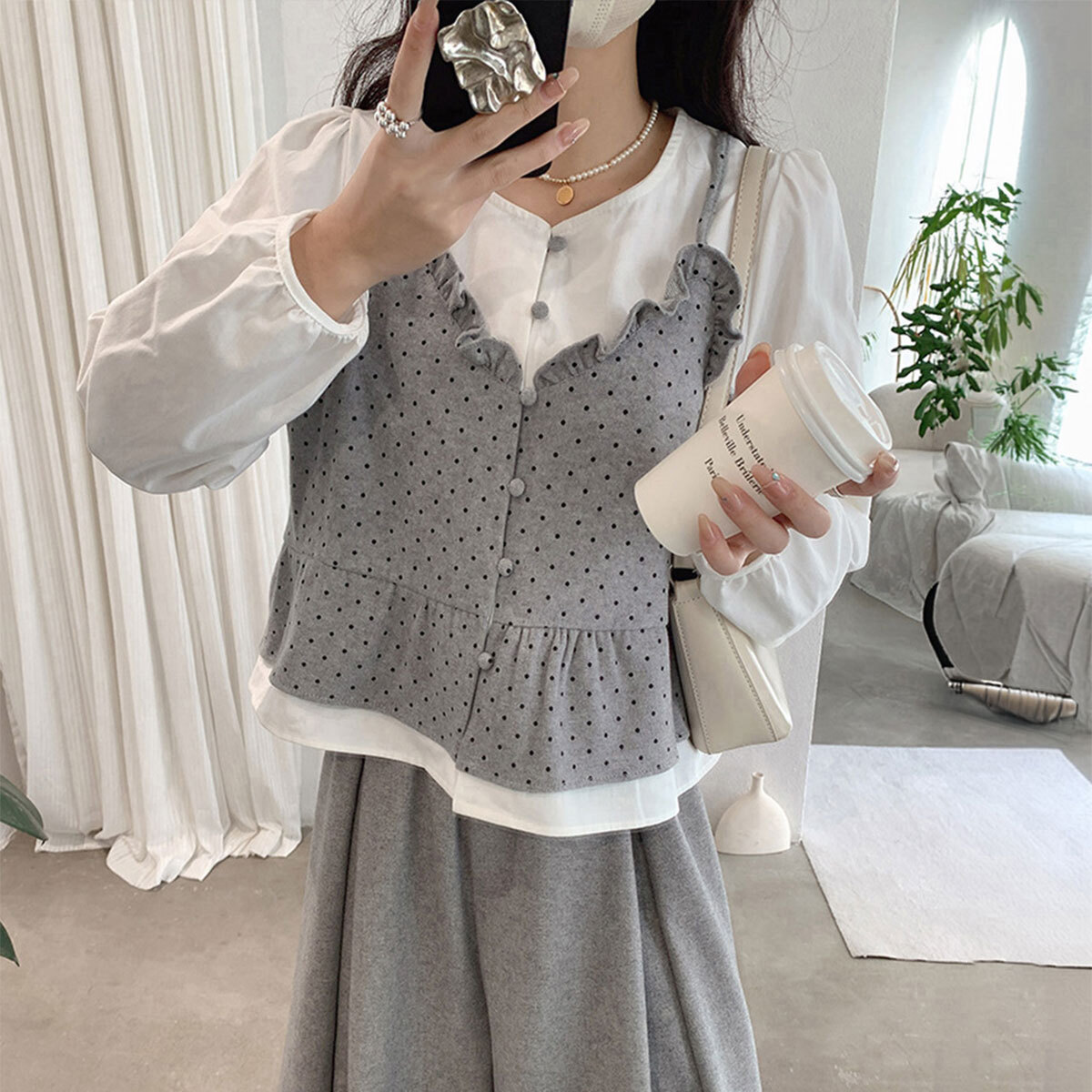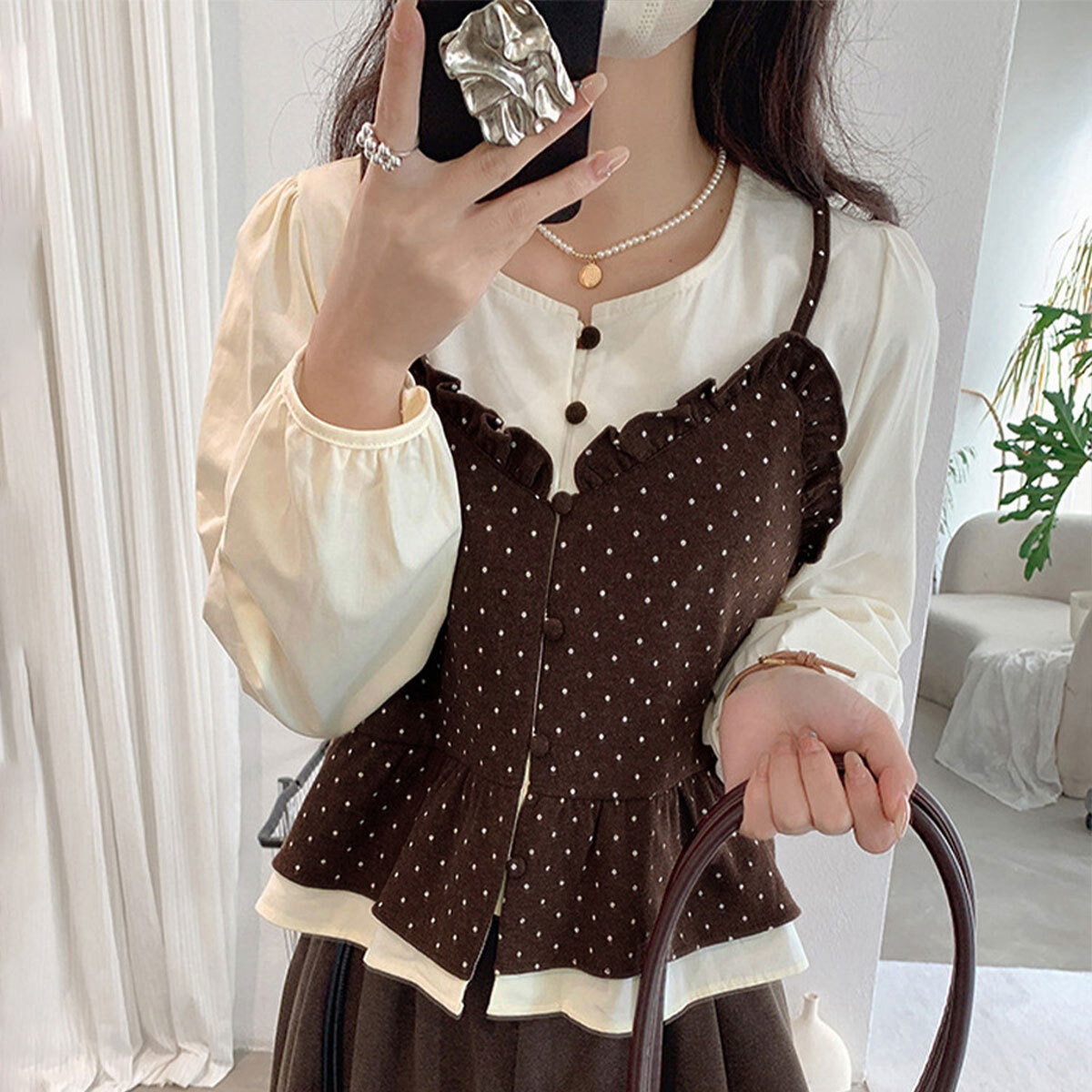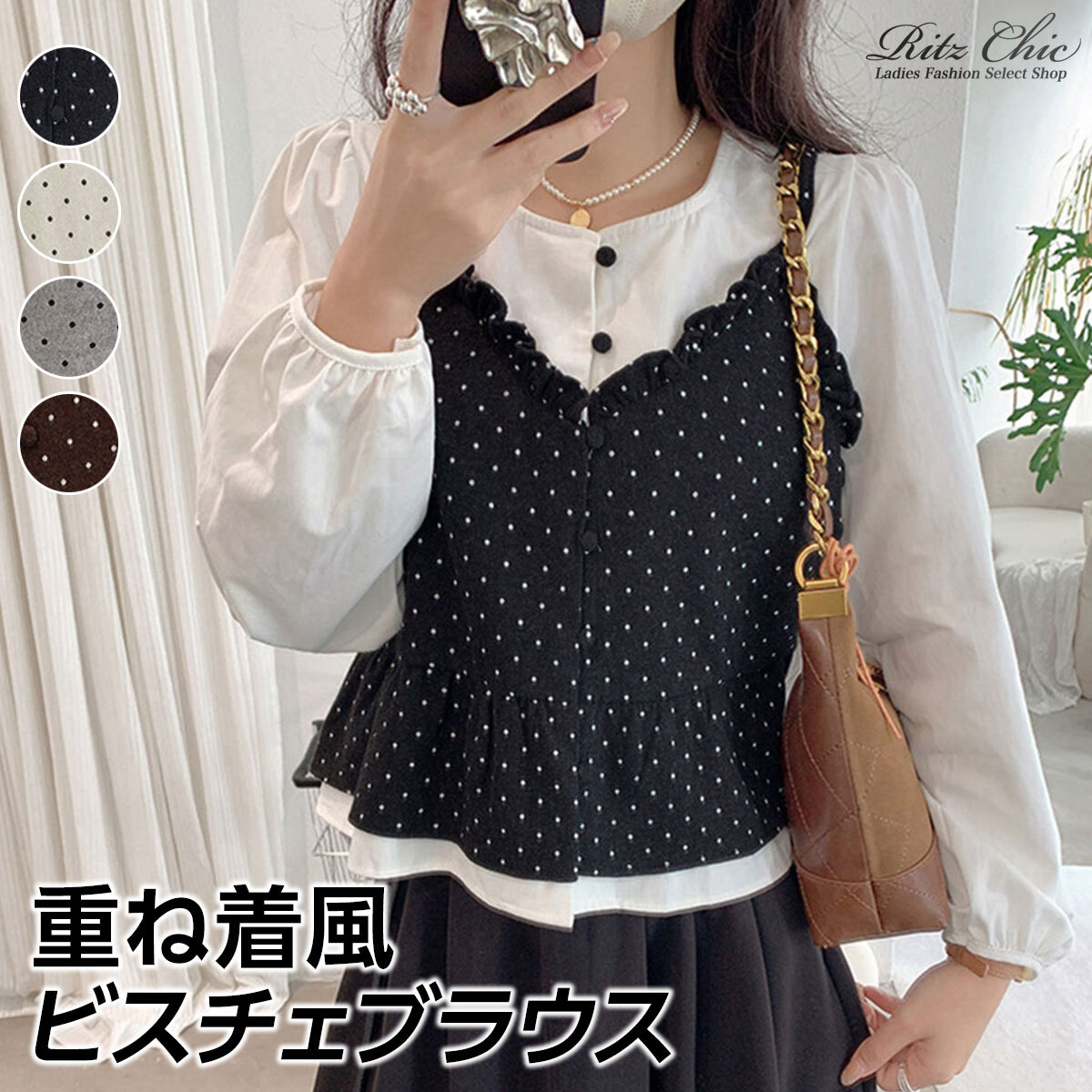 ぽわん袖の長袖シャツに、ドット柄のビスチェを重ね着したような、レイヤード風の長袖シャツブラウスです。