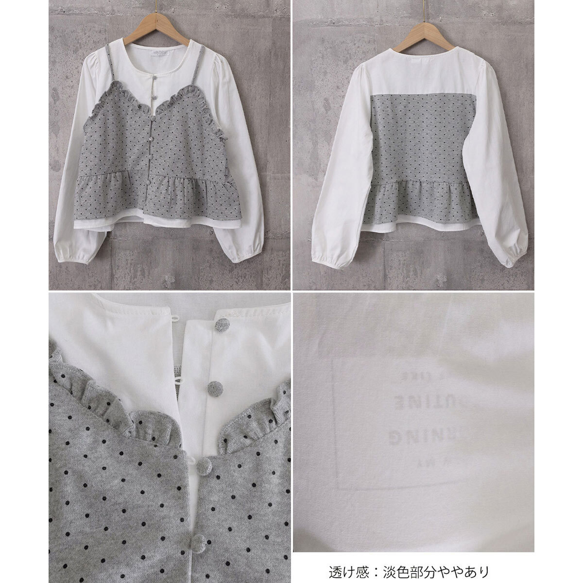◇ドット柄ビスチェを重ね着したような長袖シャツ。