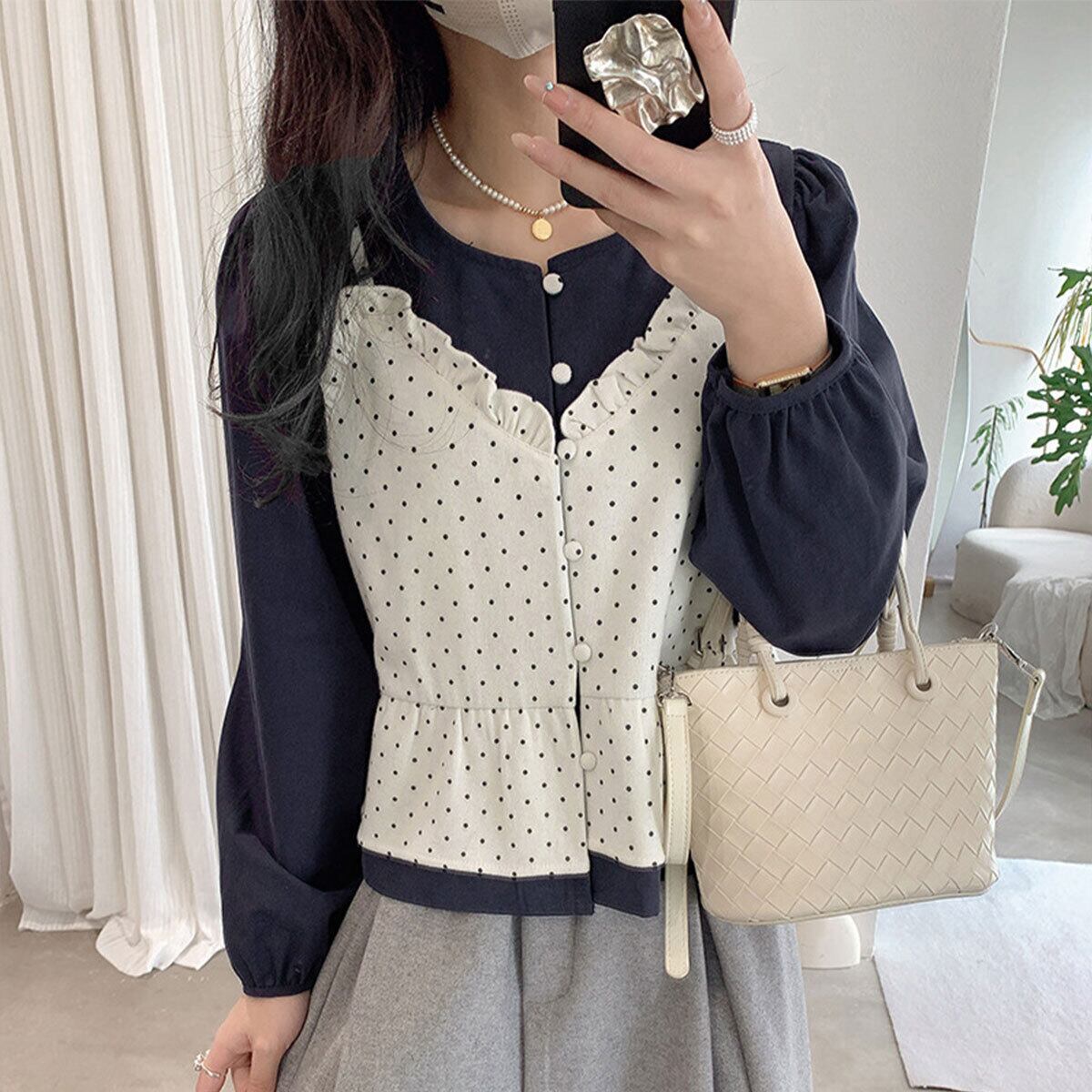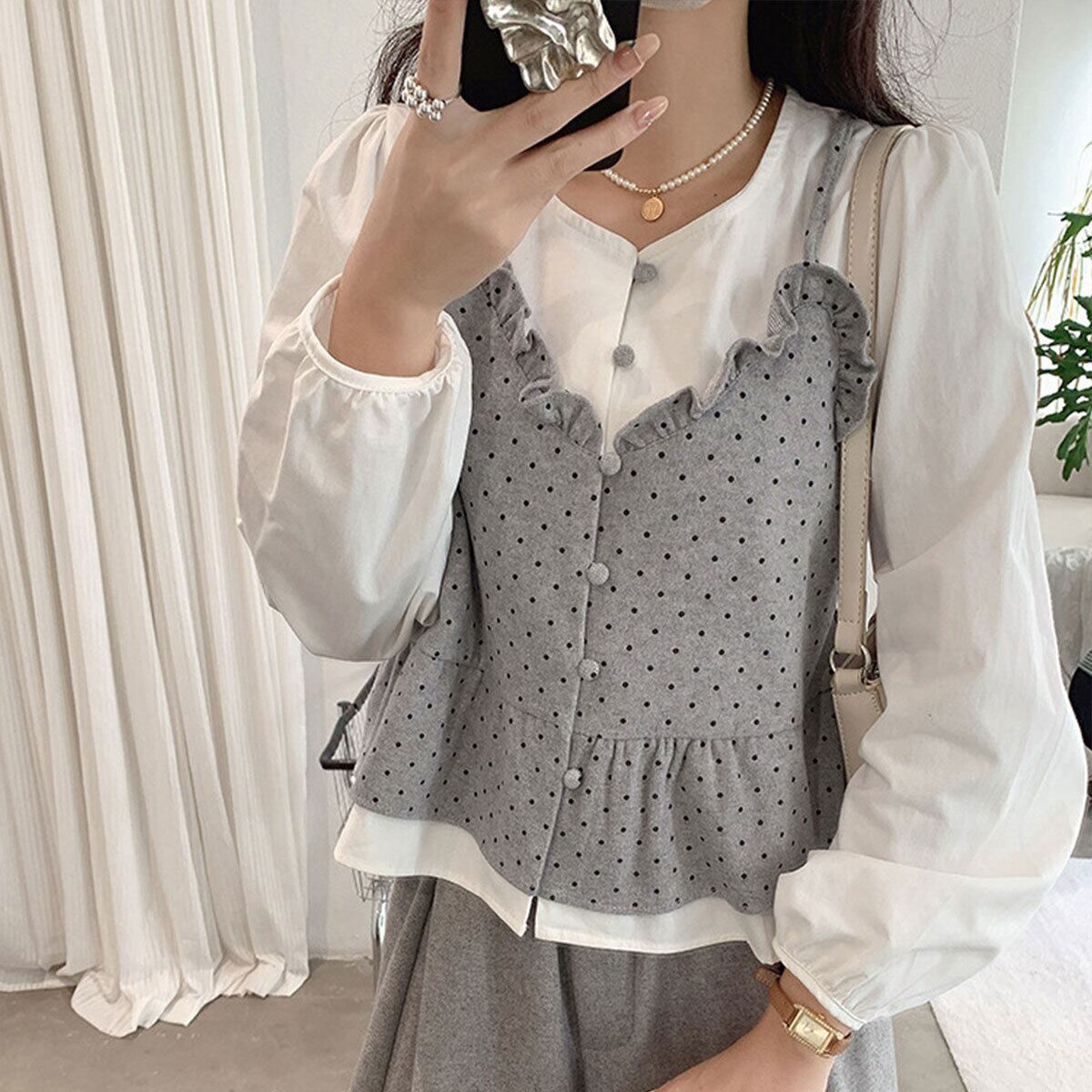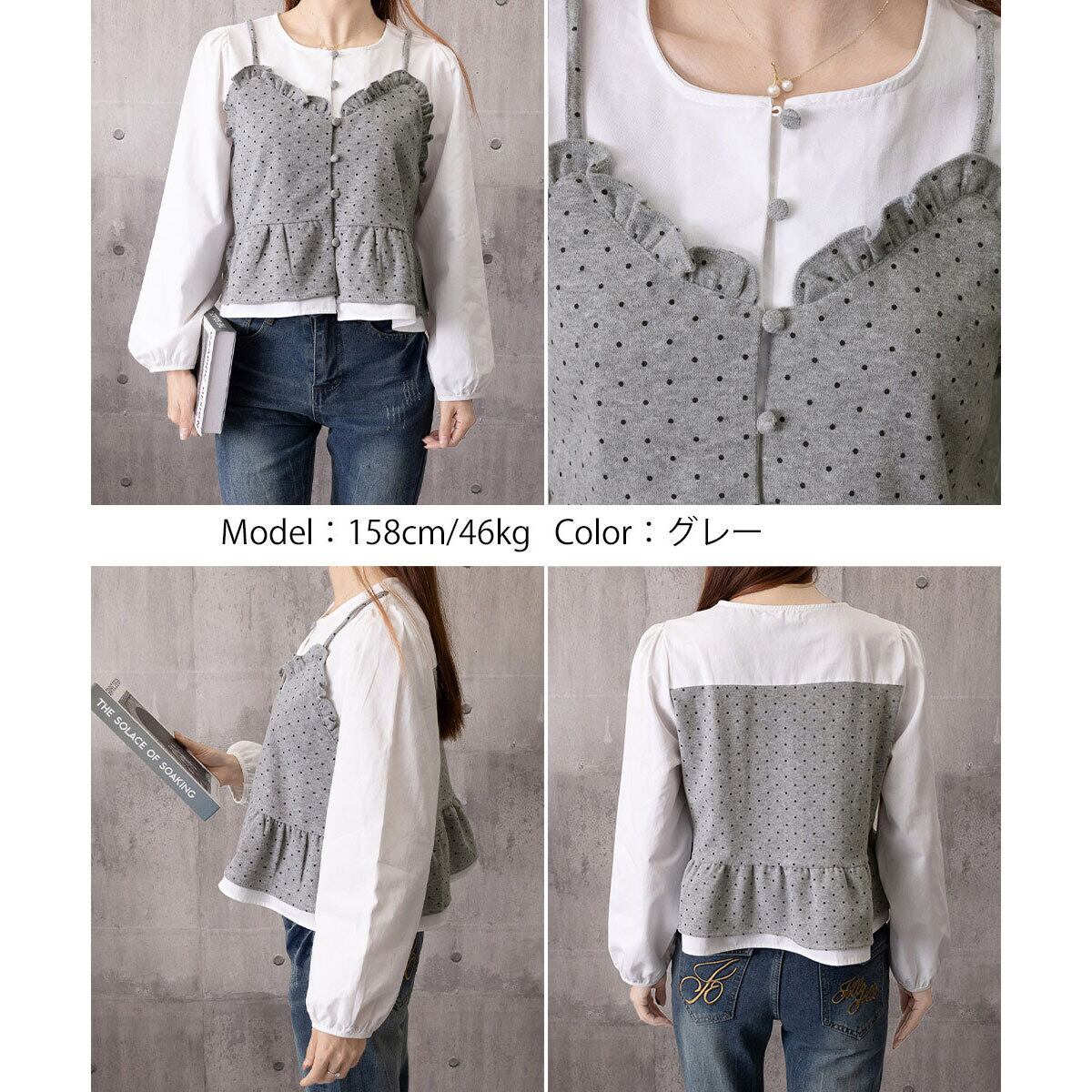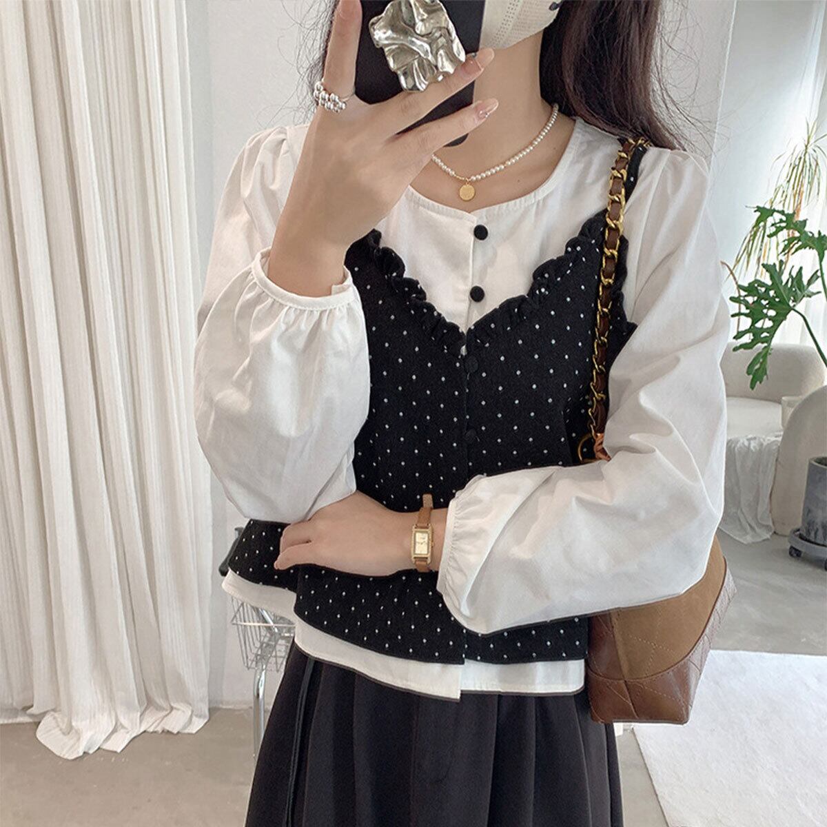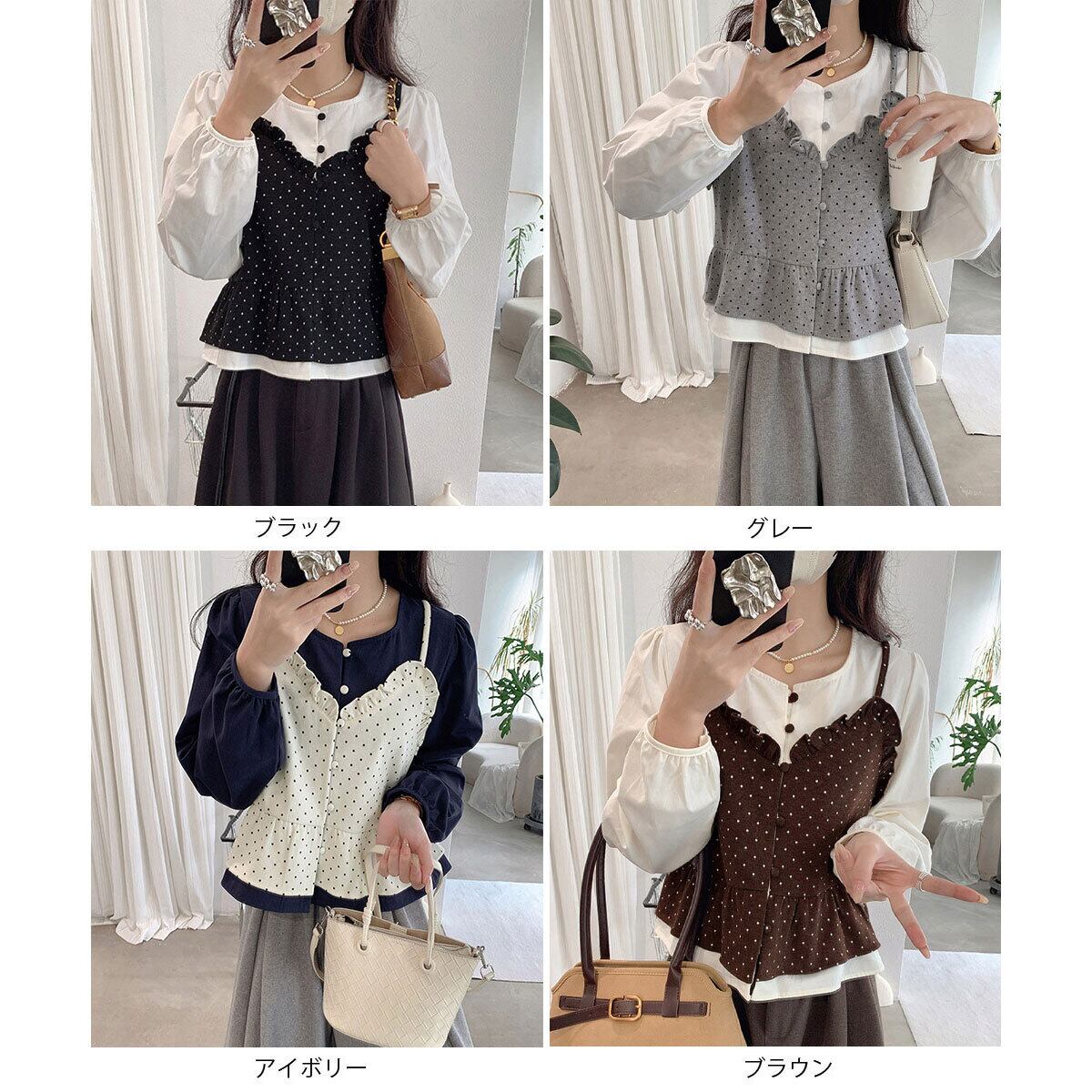 重ね着風 ビスチェ ブラウス 長袖 レディース 春秋 韓国 レイヤード きれいめ 大人 かわいい カジュアル ドット柄 シャツ シャツブラウス 大人可愛い 大人女子