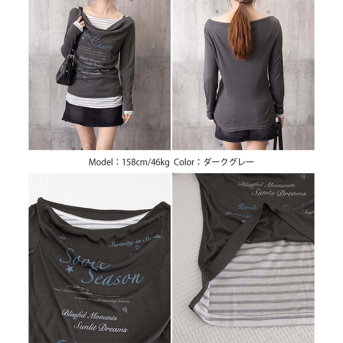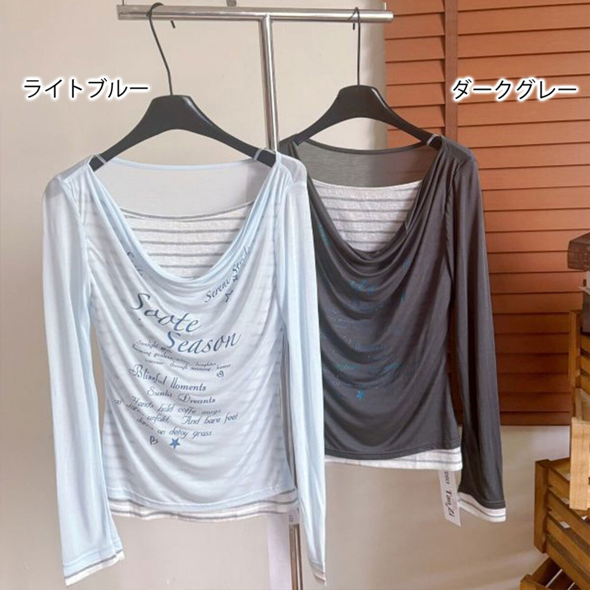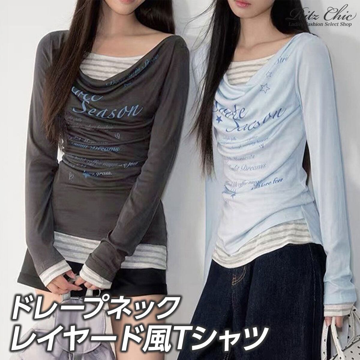 ドレープネック レイヤード風 Tシャツ 長袖 レディース 春秋 韓国 大人 カジュアル ストリート 原宿系 おしゃれ ロングTシャツ シアーTシャツ 薄手 大人可愛い 大人女子