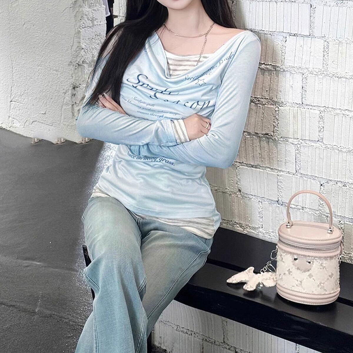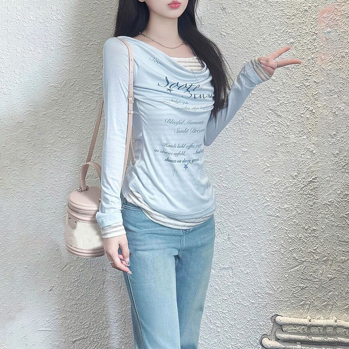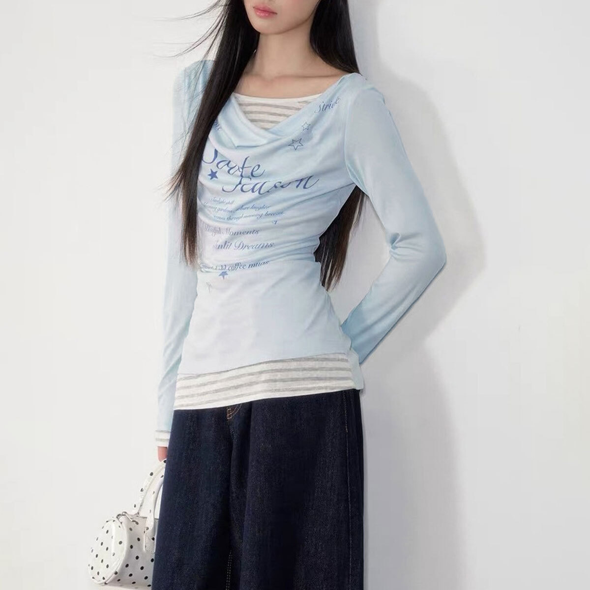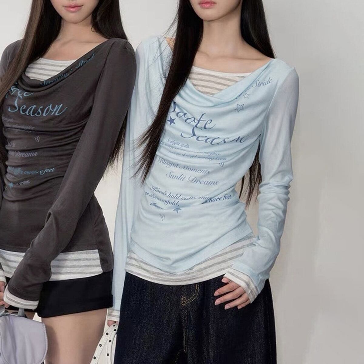 ドレープネック レイヤード風 Tシャツ 長袖 レディース 春秋 韓国 大人 カジュアル ストリート 原宿系 おしゃれ ロングTシャツ シアーTシャツ 薄手 大人可愛い 大人女子