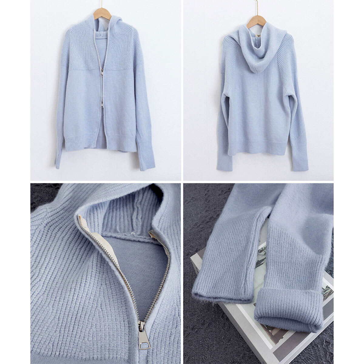 上品な編地切り替えと軽い着心地と、柔らかな風合いが魅力のポイントになった、フード付きのニットカーディガンです。
