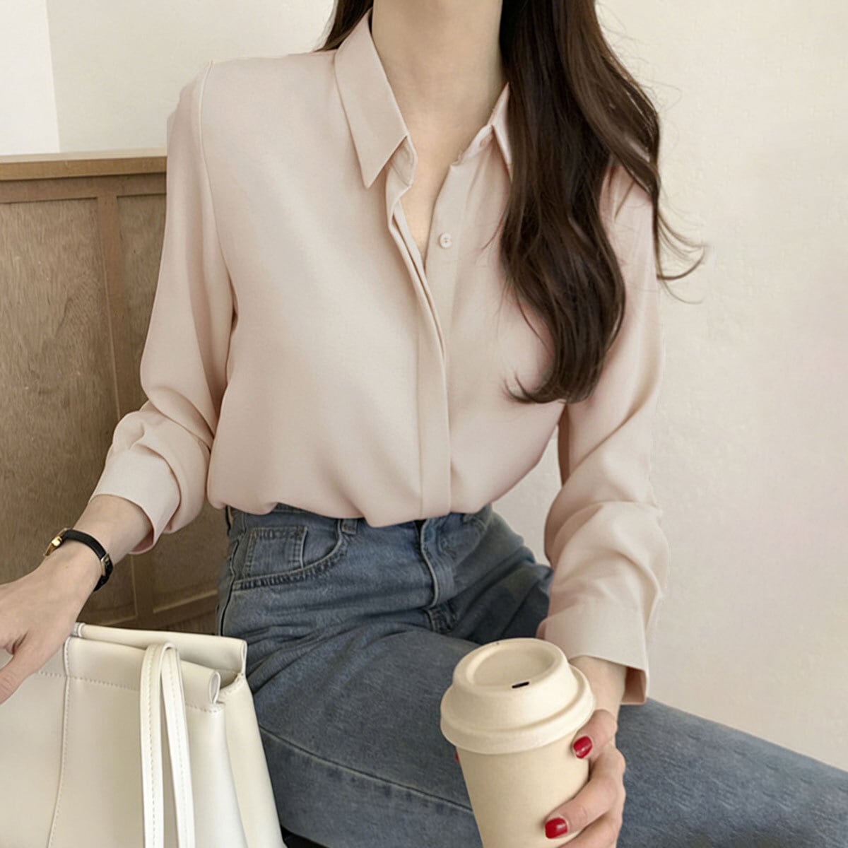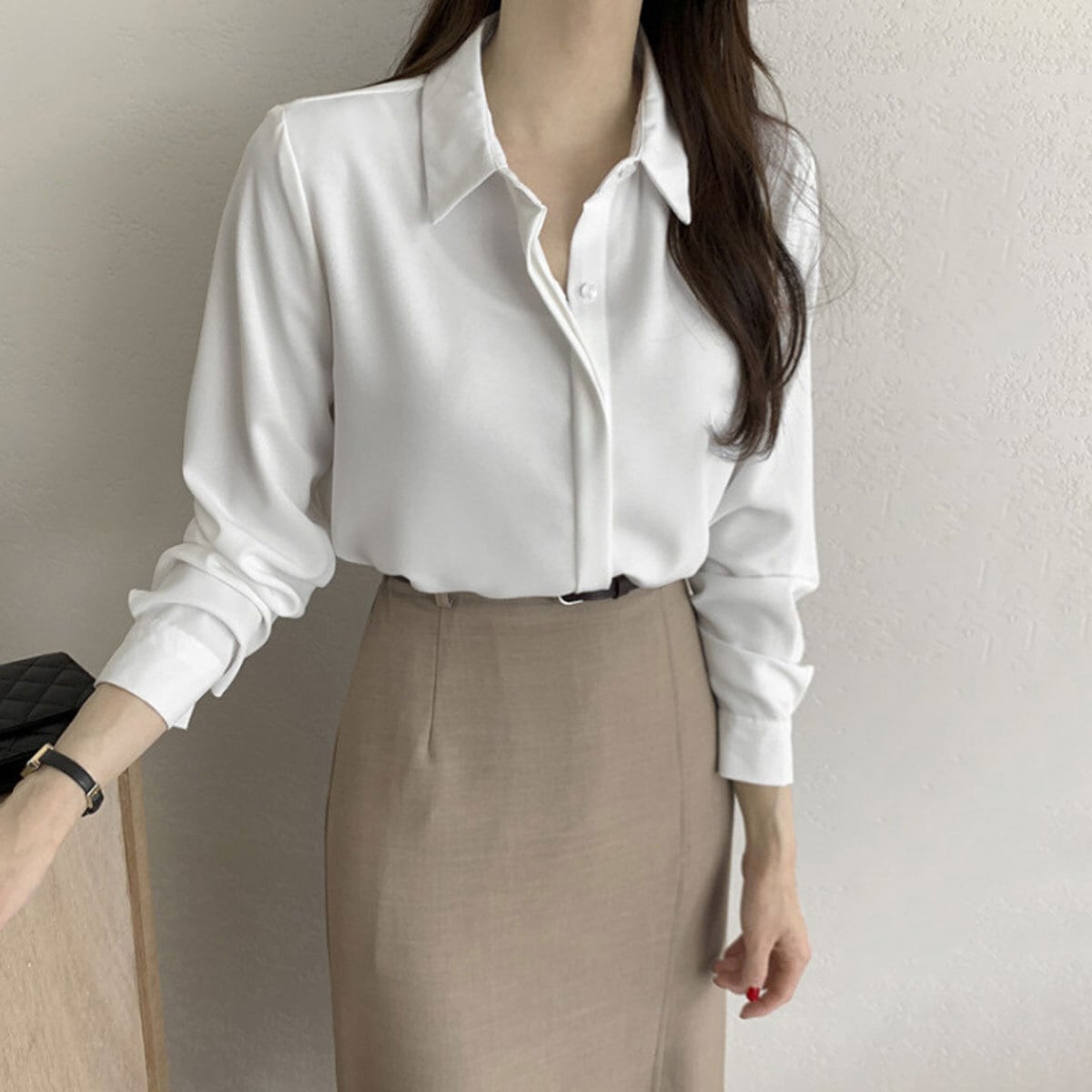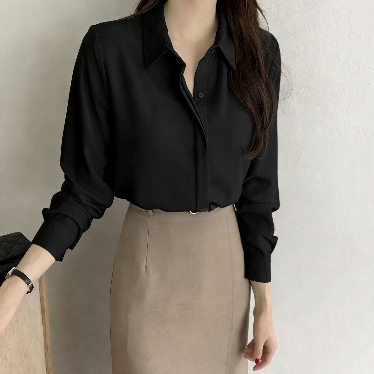 とろみのある素材が女性らしい落ち感を演出し、シンプルな襟付きデザインできれいめな大人女子の魅力を引き立ててくれる長袖のシャツブラウスです。