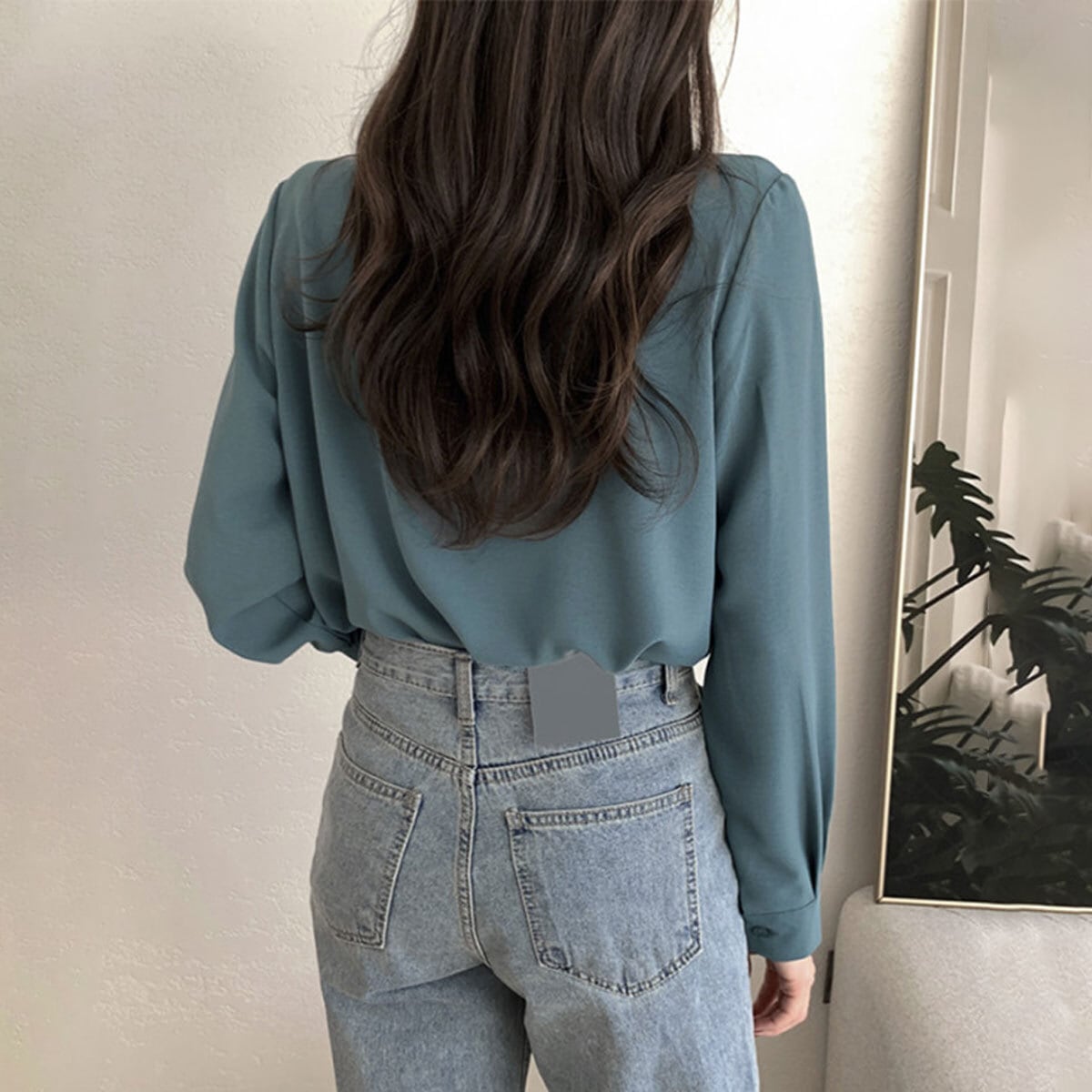 ◇前立てのボタンが隠れた長袖シャツブラウス。