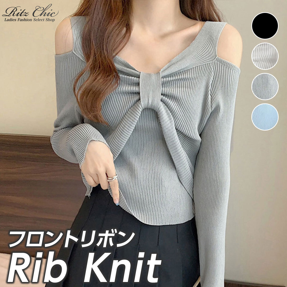 フロントのリボンデザインとデコルテを美しく見せるカッティングデザインが、程よい甘さと抜け感をプラスしてくれるリブニットのオフショルダートップスです。