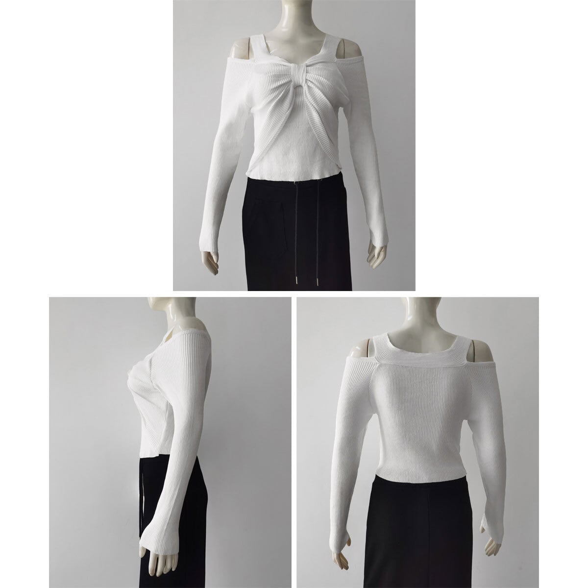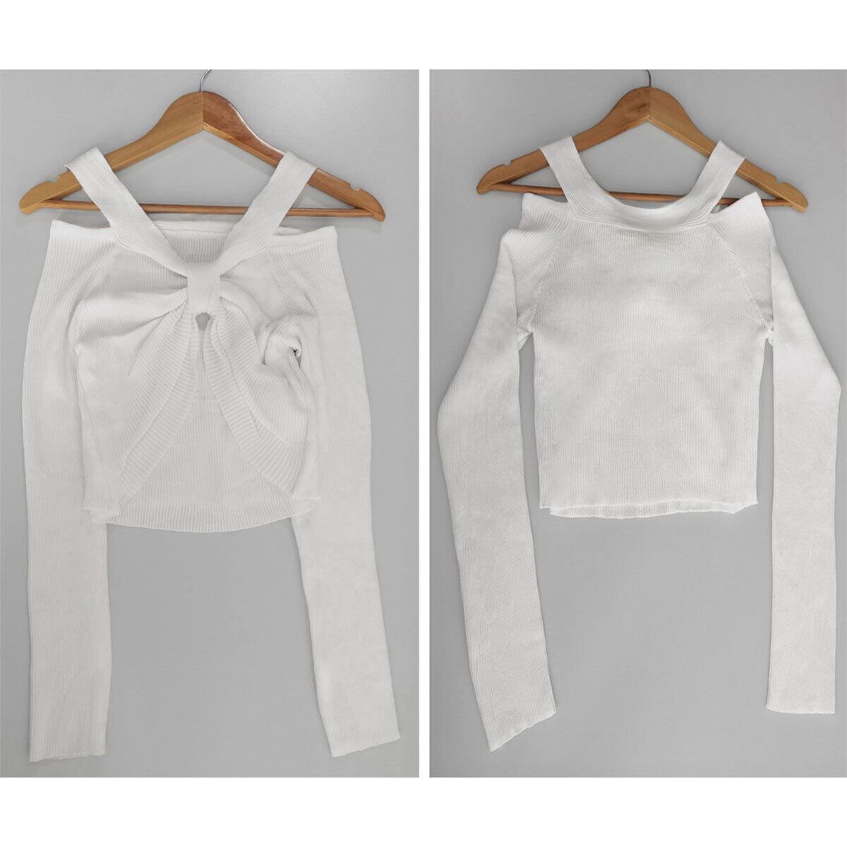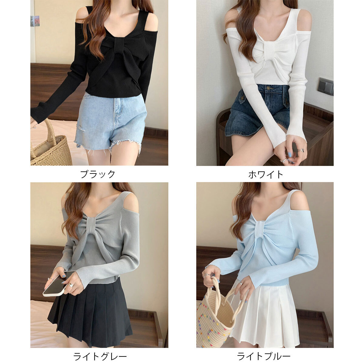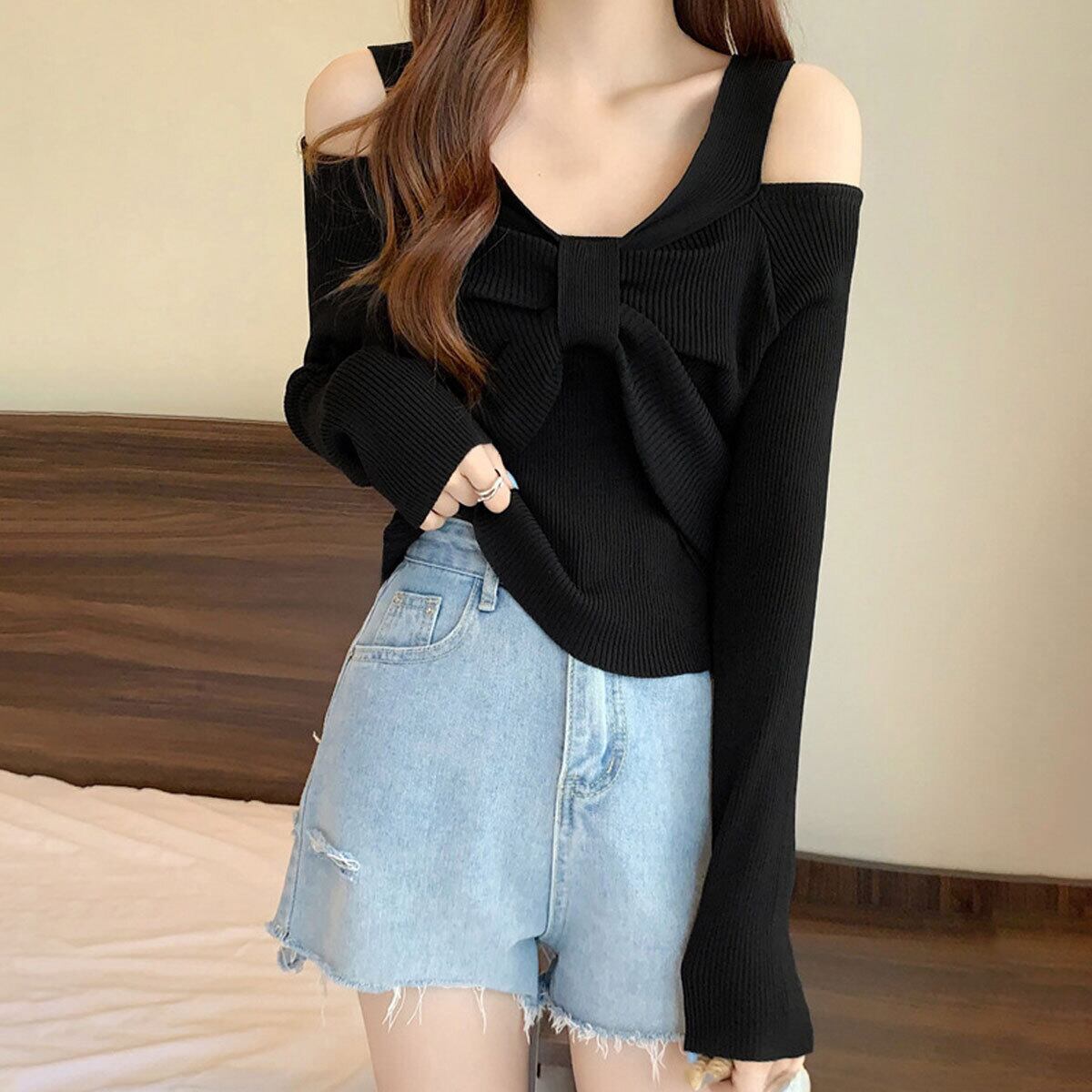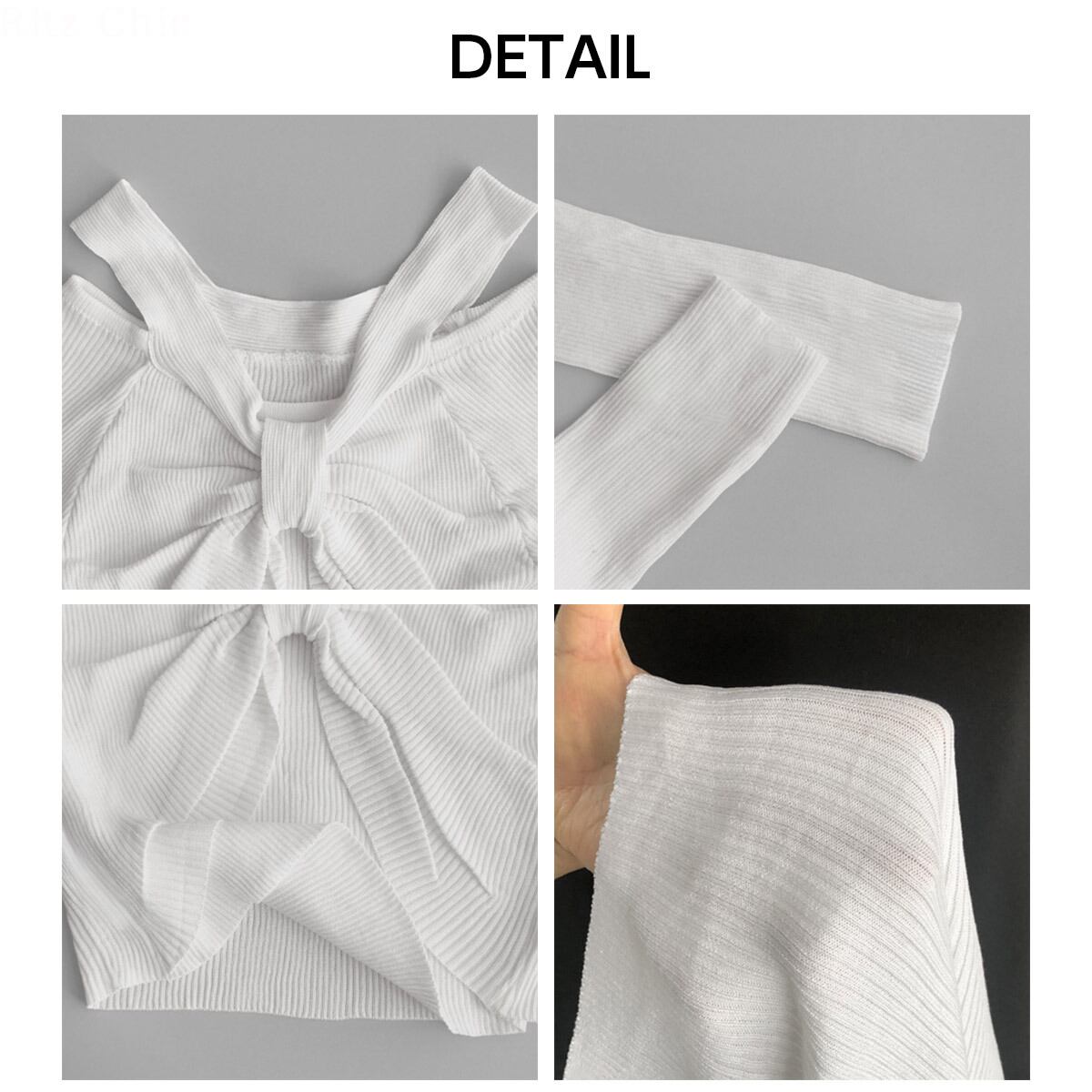 リブニット フロントリボン ニット レディース 春秋 韓国 肩出し トップス 大人 かわいい きれいめ 薄手 カジュアル セーター ショート丈 おしゃれ 長袖 大人可愛い 大人女子