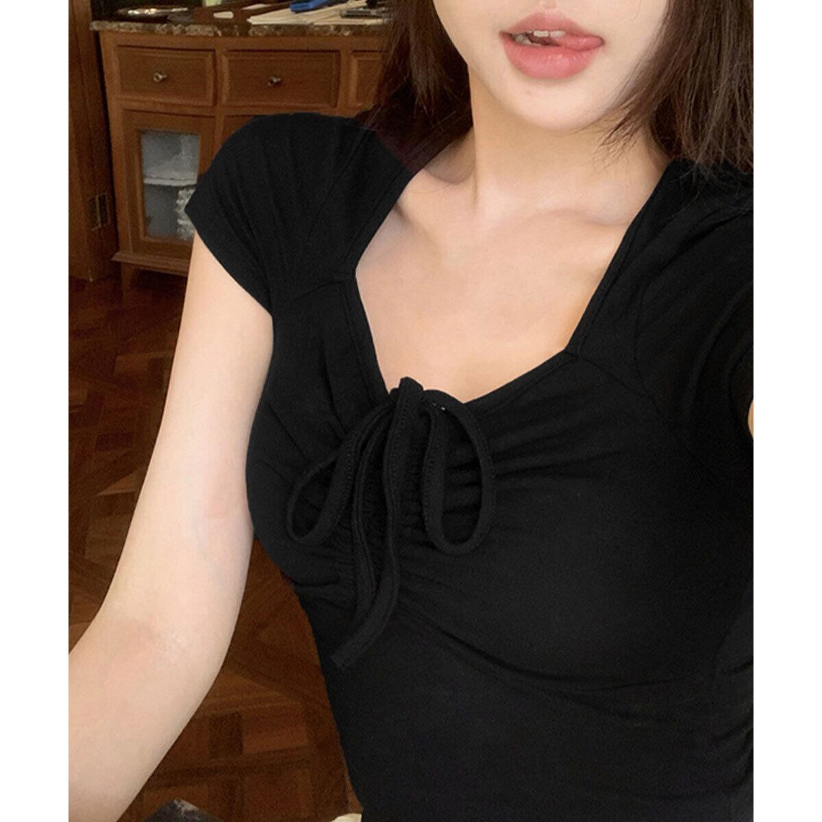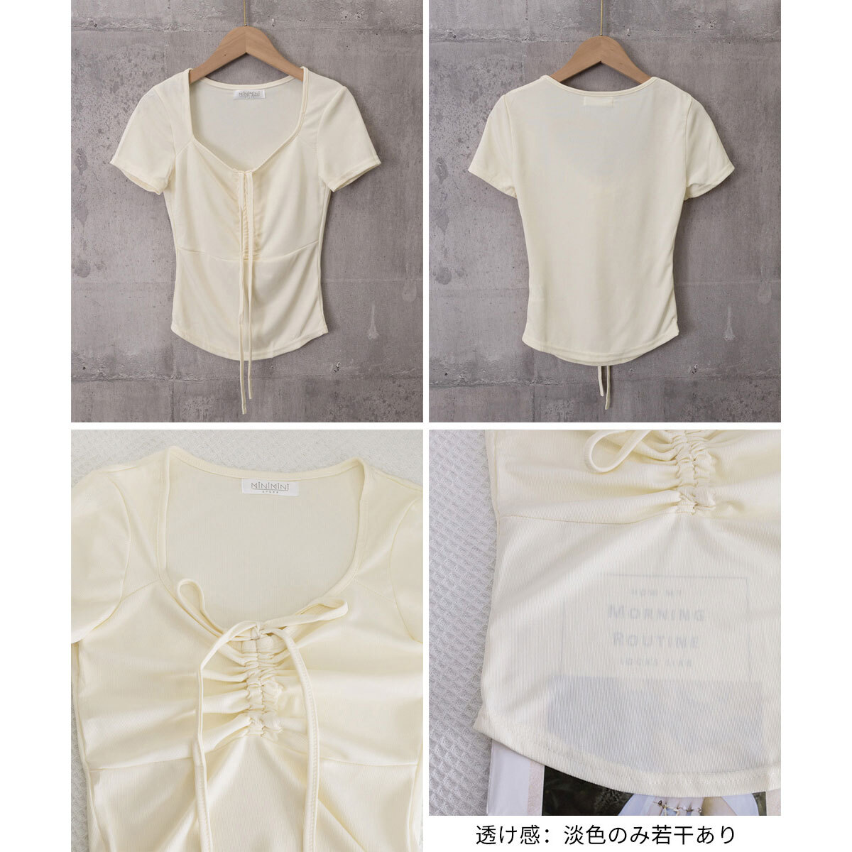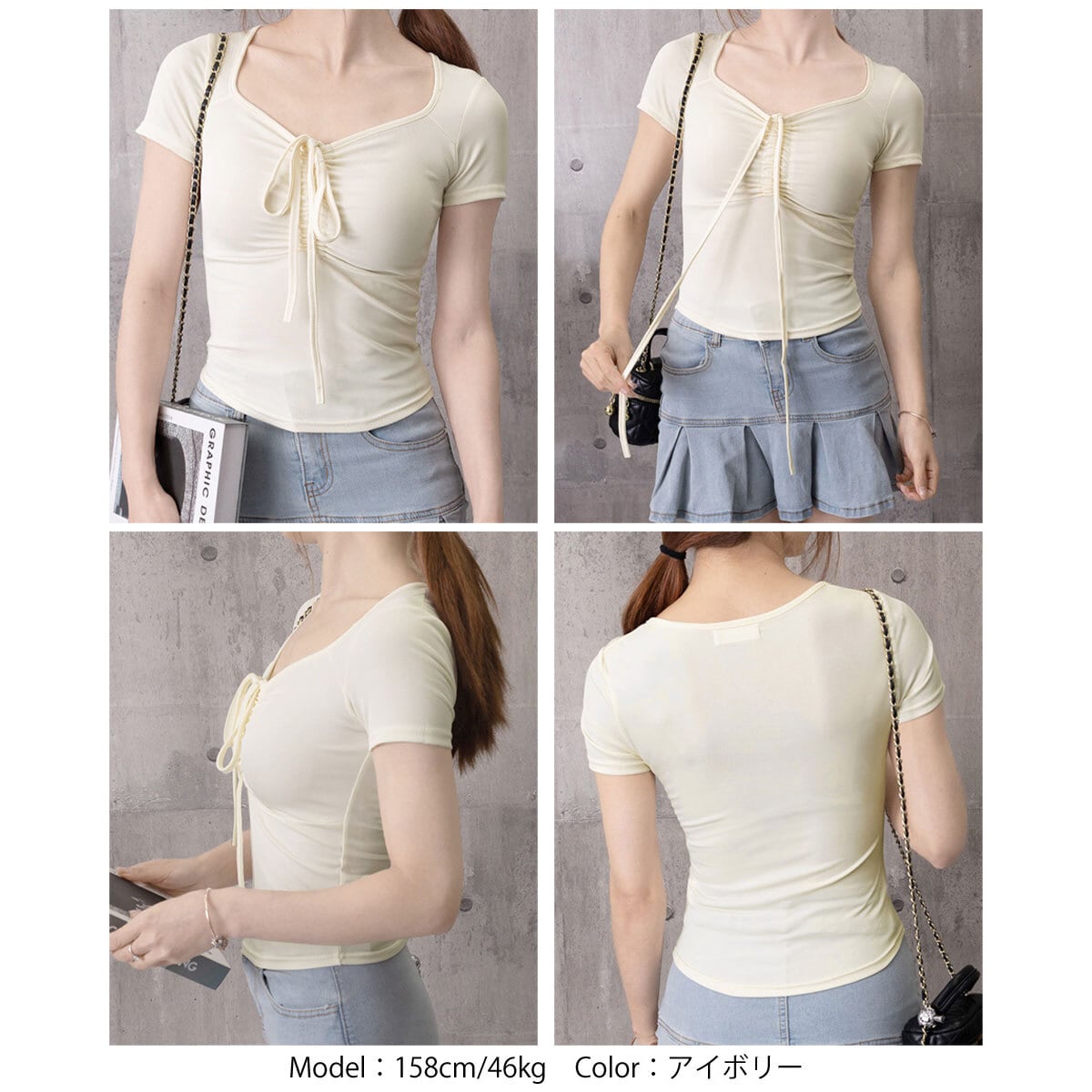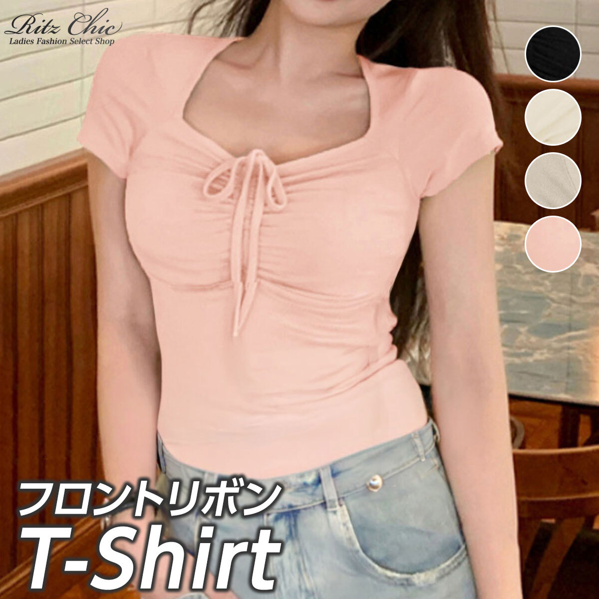 フロントリボン ギャザー Tシャツ 半袖 レディース 春夏 韓国 きれいめ 大人 かわいい タイト 細見え ペンタゴンネック おしゃれ カジュアル フェミニン 大人可愛い 大人女子