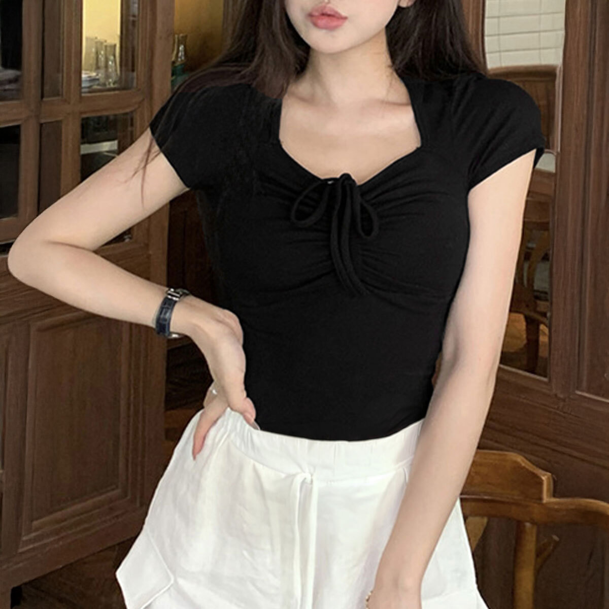 大きく開いたペンタゴンネックとドローストリングのリボンが、女性らしさを引き立ててくれる魅力的な半袖Tシャツです。