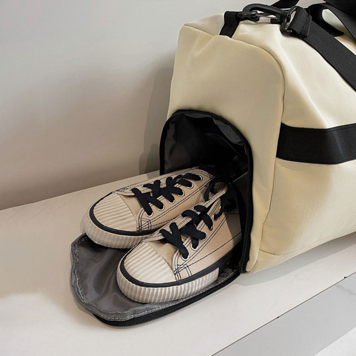 シューズ収納用のスペースや、濡れ物を入れられる乾湿分離ポケットも付いているので、仕分けや収納が容易で持ち運びにも便利です。