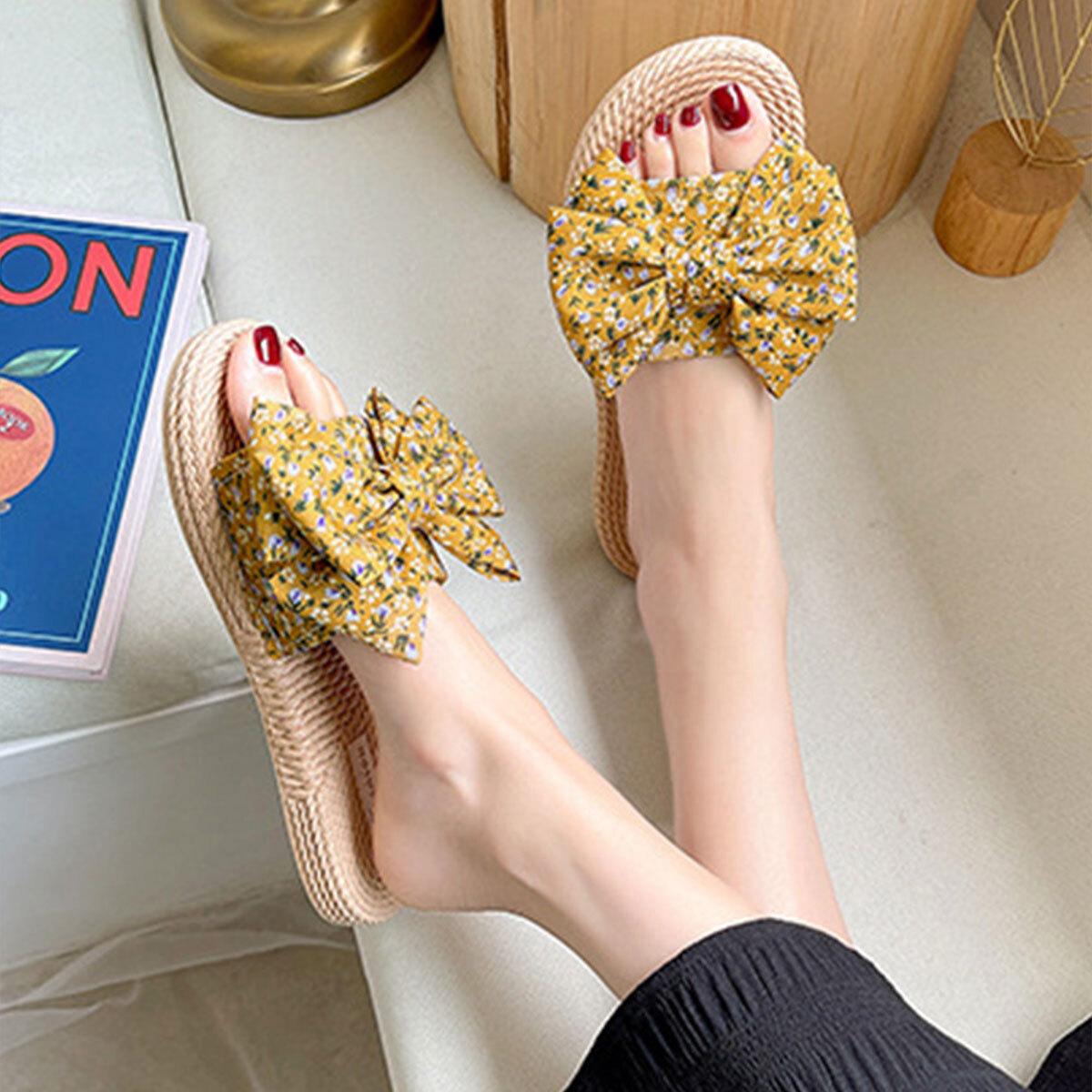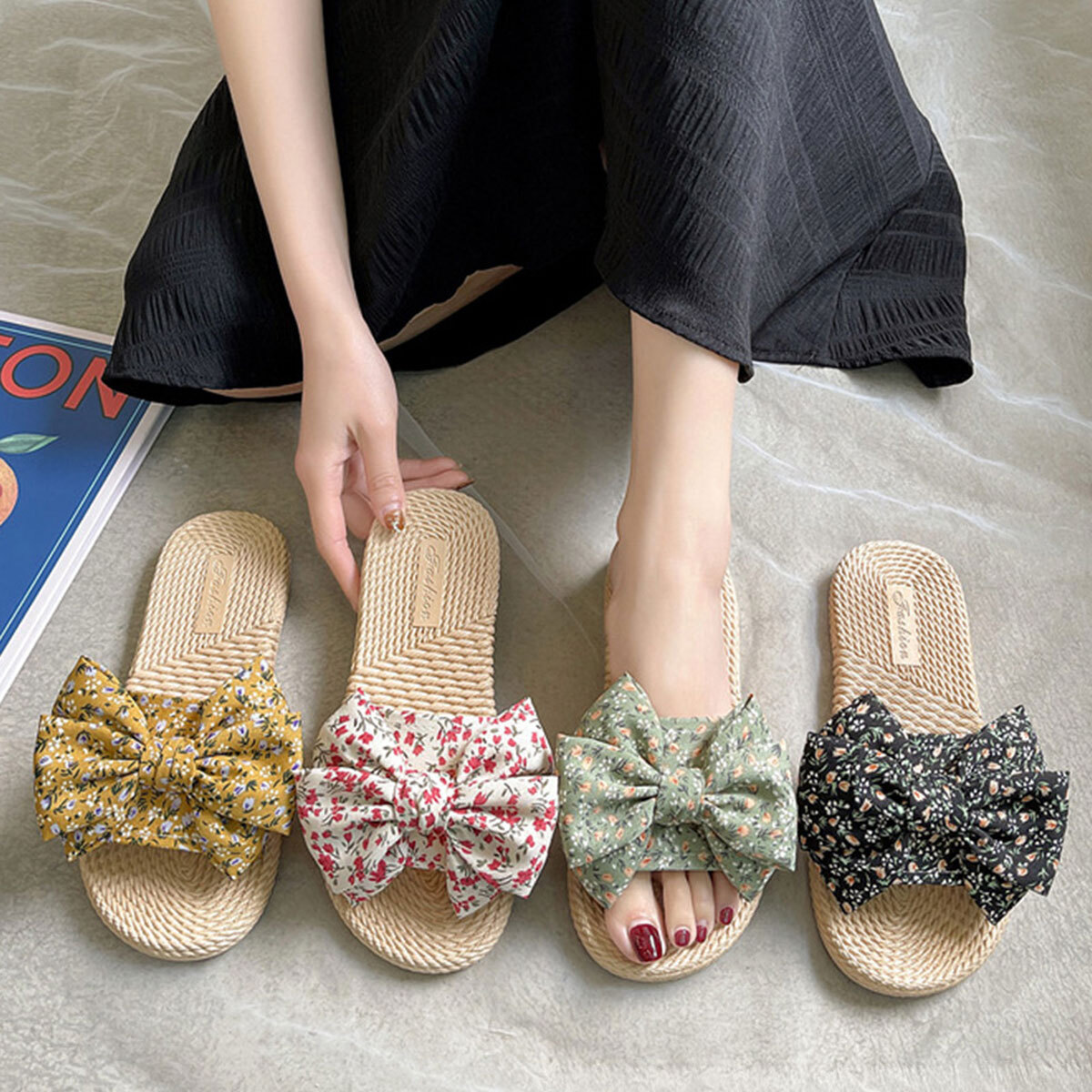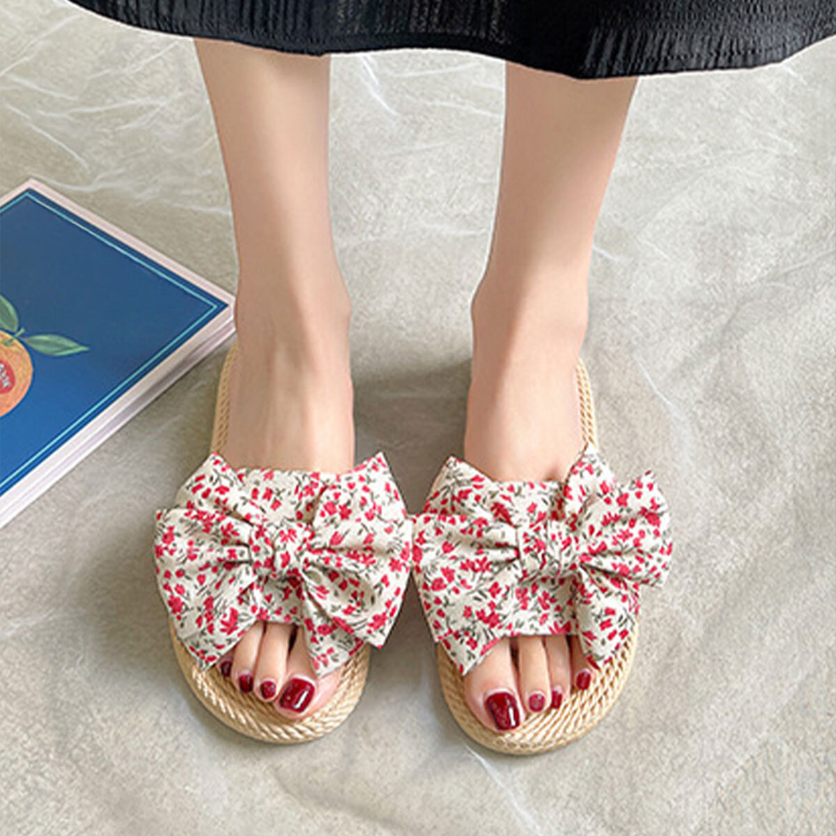 ◇小花柄の大きめリボンが目を引くフラットサンダル。