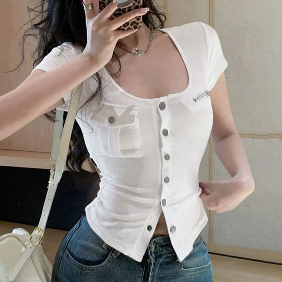 アウトポケット Tシャツ 半袖 レディース 春夏 韓国 トップス 大人 カジュアル ストリート 原宿系 アメカジ おしゃれ タイト 華奢見え Uネック 伸縮性 大人可愛い 大人女子