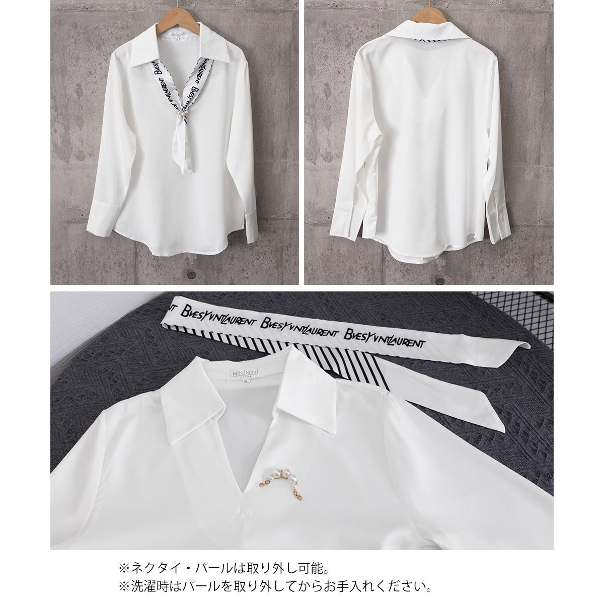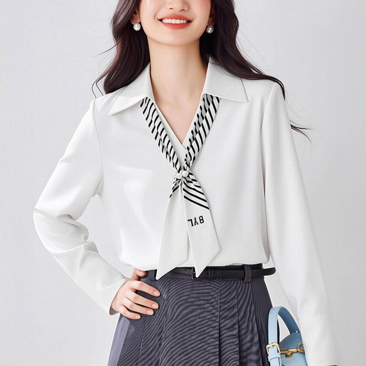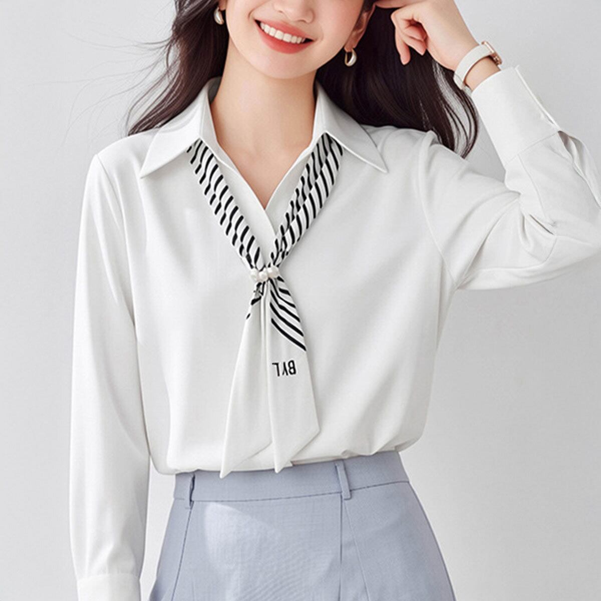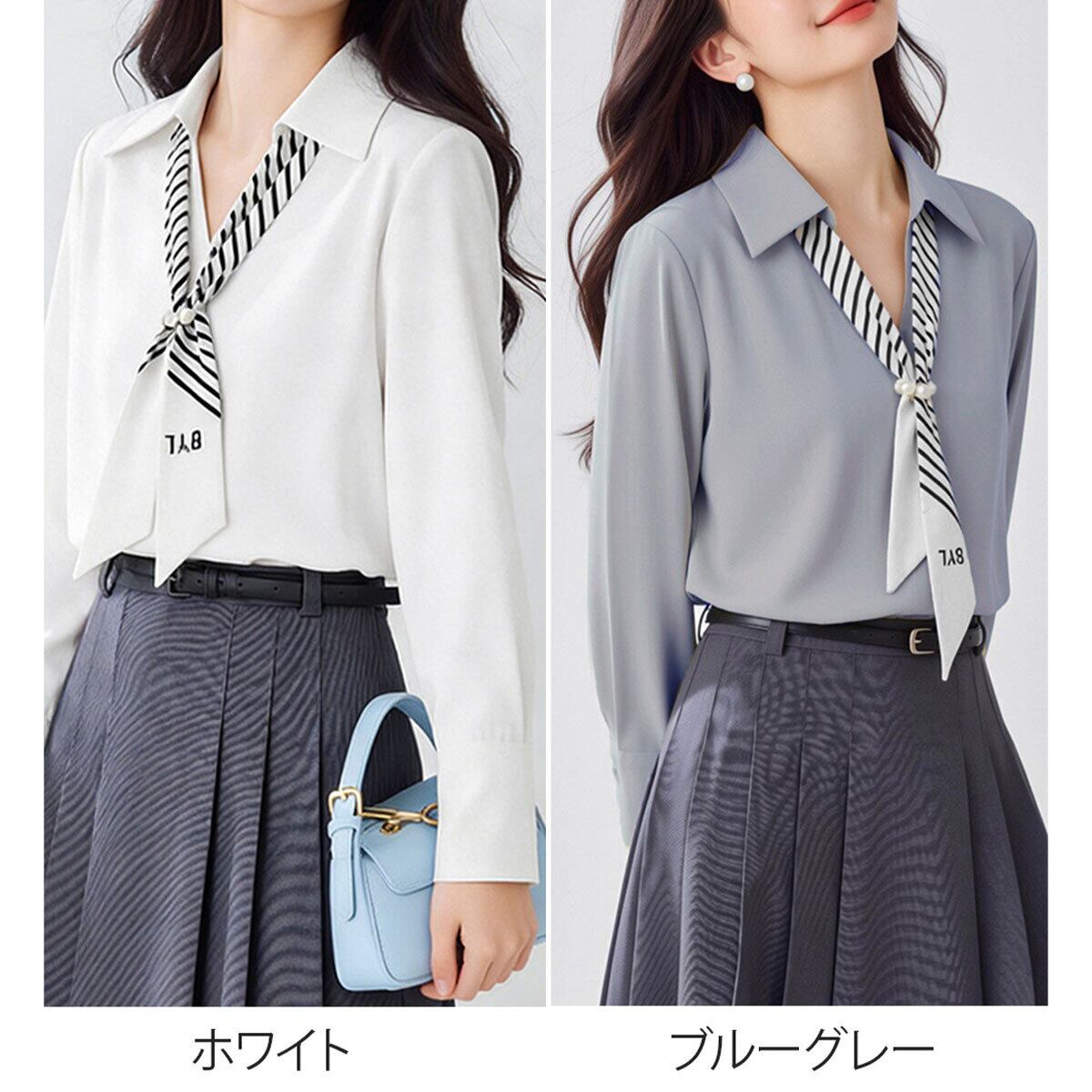 シャツブラウス 長袖 ブラウス パール付きスカーフ レディース 春秋 韓国 きれいめ 大人 上品 シンプル ビジネス オフィス フォーマル 入学式 入園式 卒業式 卒園式 参観日 通勤 大人可愛い 大人女子