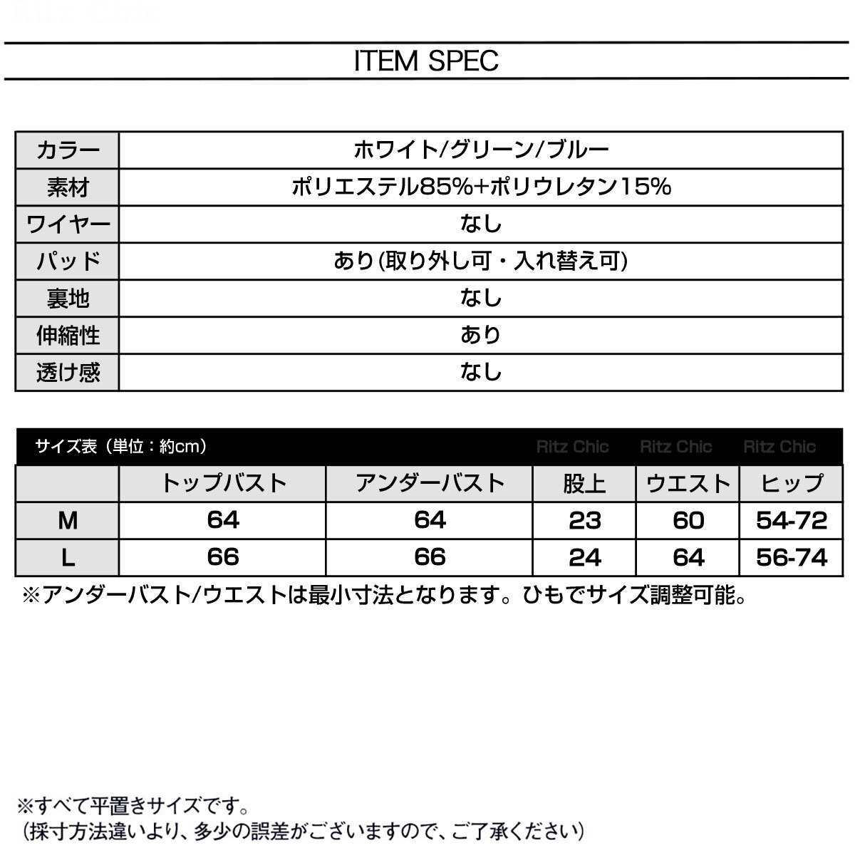 ※アンダーバスト/ウエストは最小寸法となります。ひもでサイズ調整可能。
