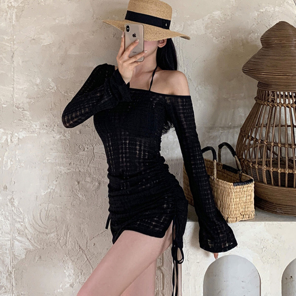 ビキニ水着とシアートップスを重ね着することで、トレンド感のあるスタイルが完成します。