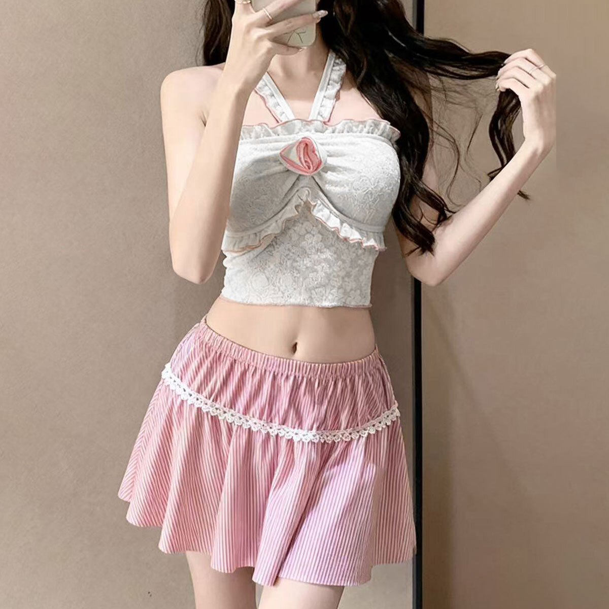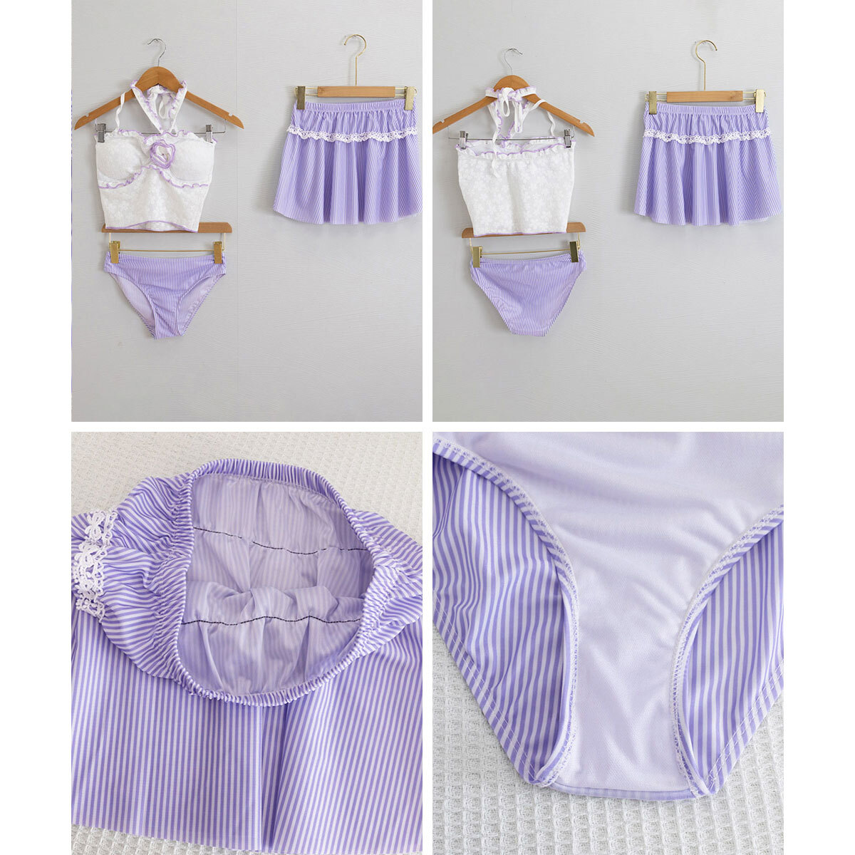 ホルターネックのトップスとビキニショーツ、ストライプ柄のミニスカートがセットになった大人可愛いアイテムです。