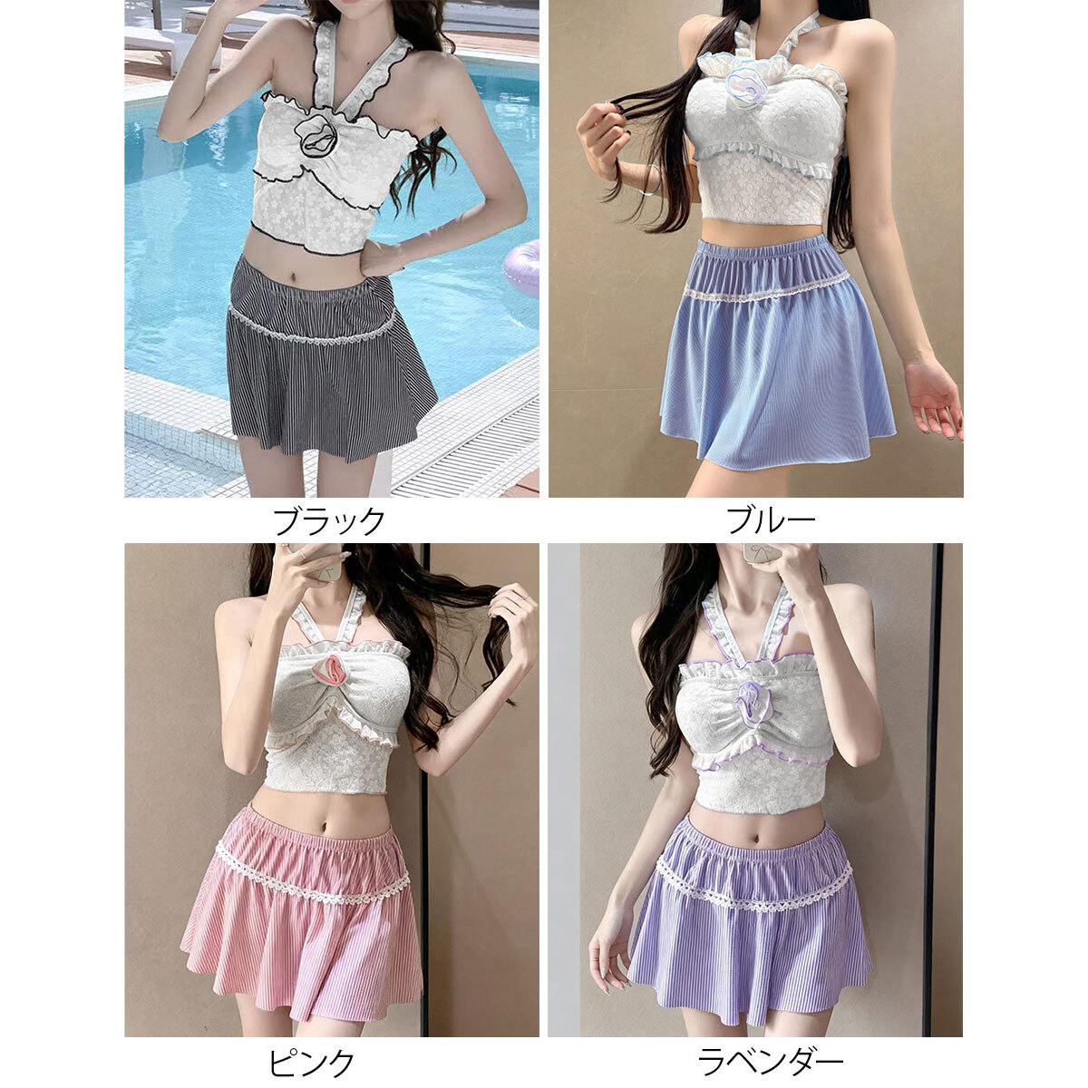 スカート付き 水着 ビキニ 3点セット レディース 夏 韓国 ホルターネック ビーチ 海水浴 プール レジャー 大人 かわいい きれいめ ビーチウェア 露出控えめ フラワー フリル フェミニン 大人可愛い 大人女子