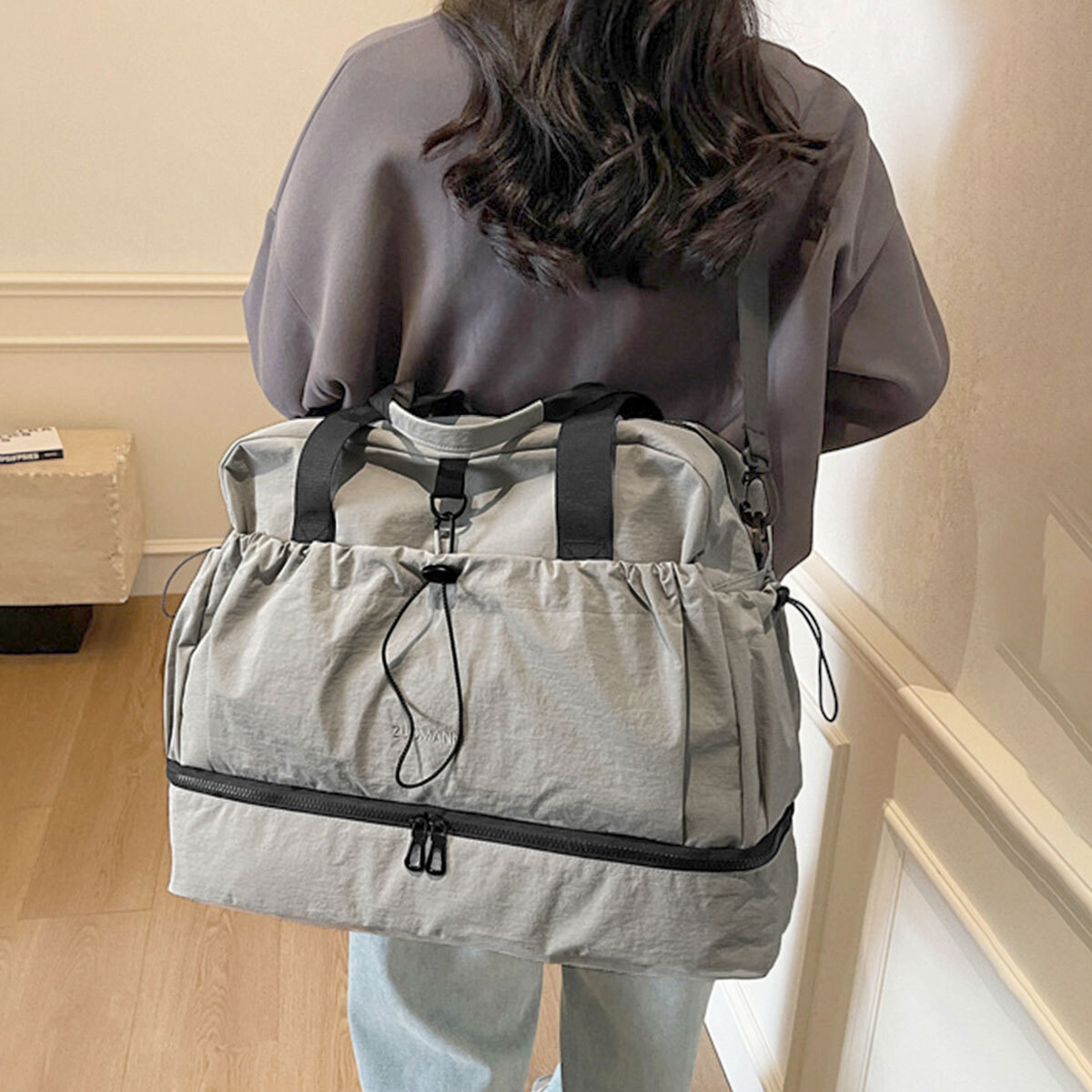 ドライウェット分離機能付きで整理しやすく、下部にはシューズ収納スペースも備え、荷物をすっきり収納していただける男女兼用のアイテムです。