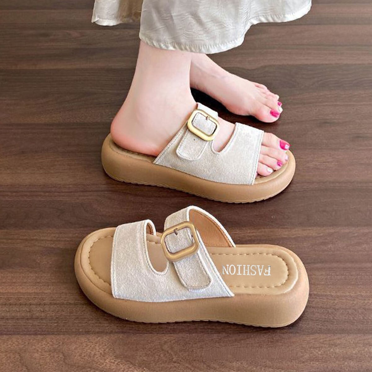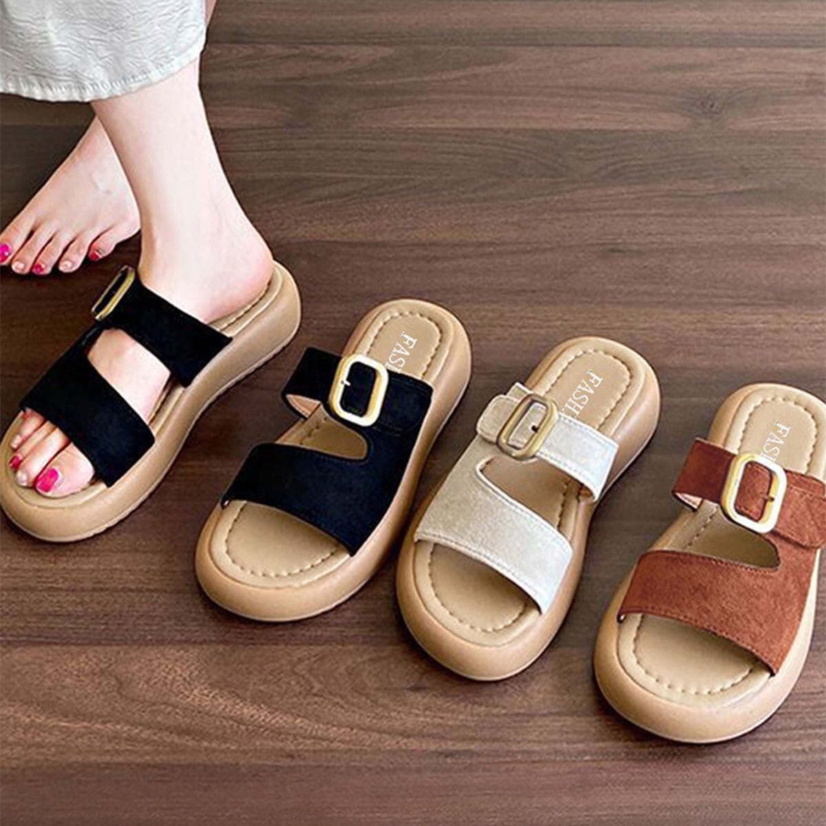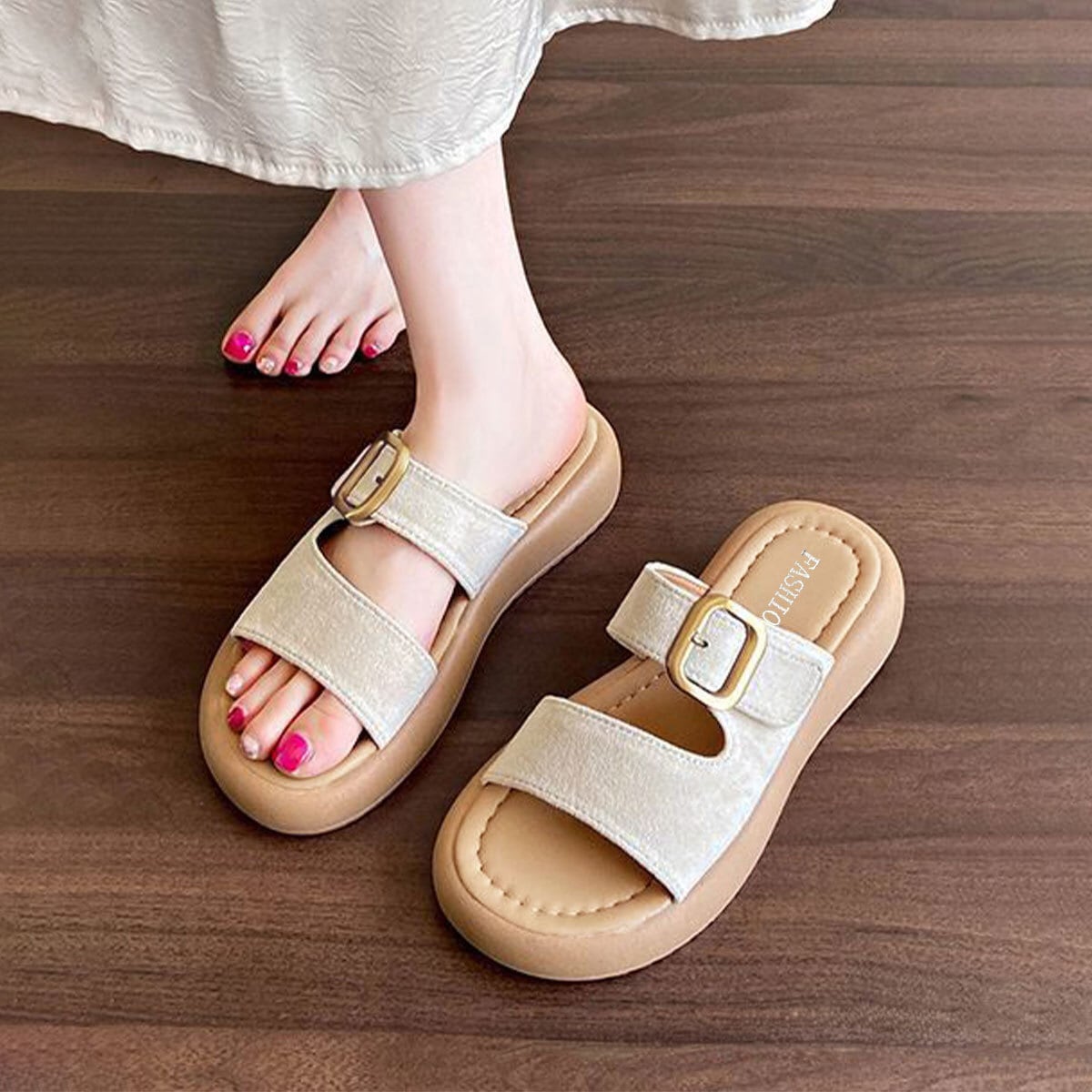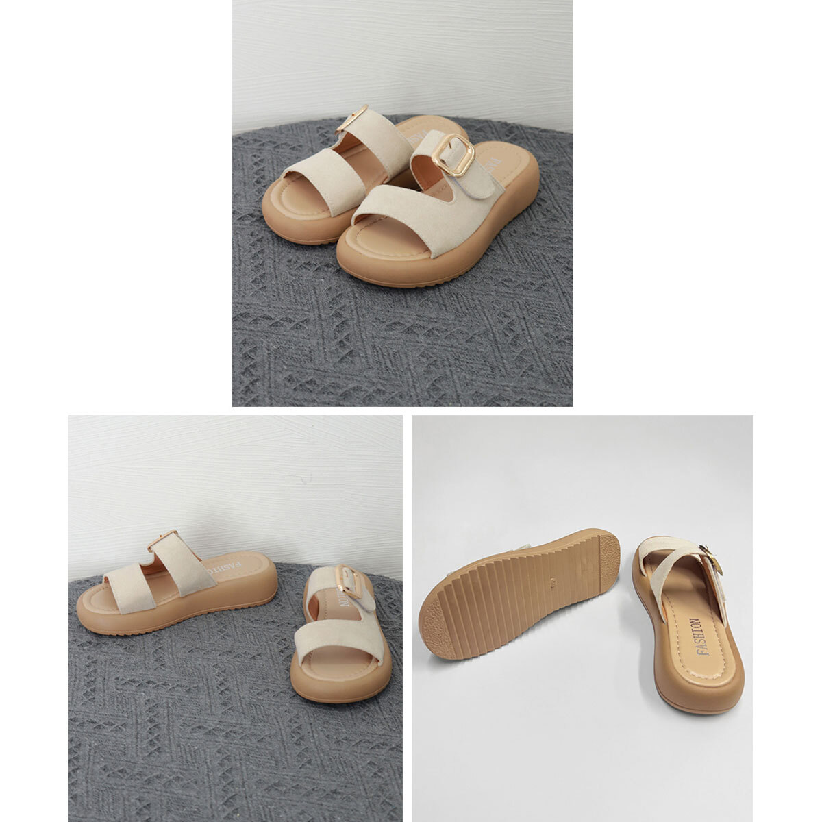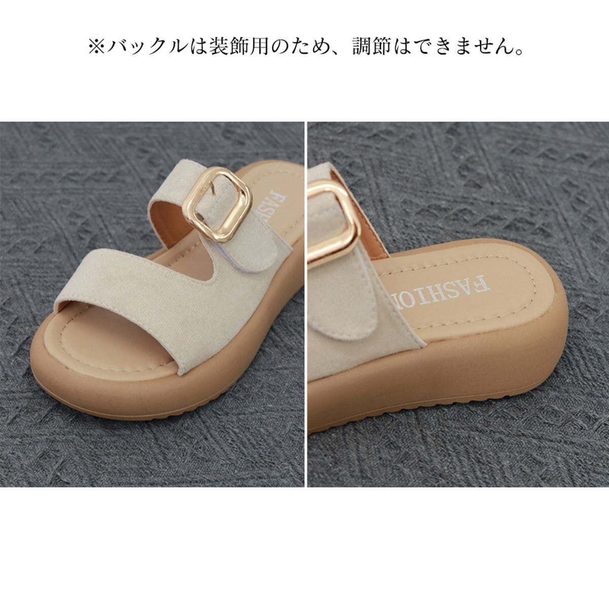ゴールドバックルがアクセントになり、ビーチやプール、海水浴、旅行など多様なシーンで足元をお洒落に演出してくれます。