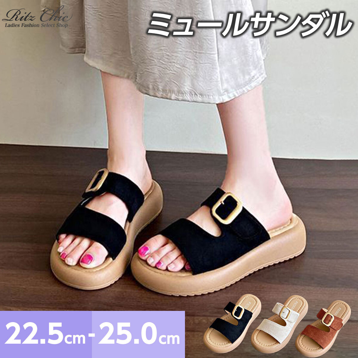 安定感のあるボリュームソールで歩きやすく、春夏の季節にぴったりな大人カジュアルなデザインが特徴的なミュールサンダルです。