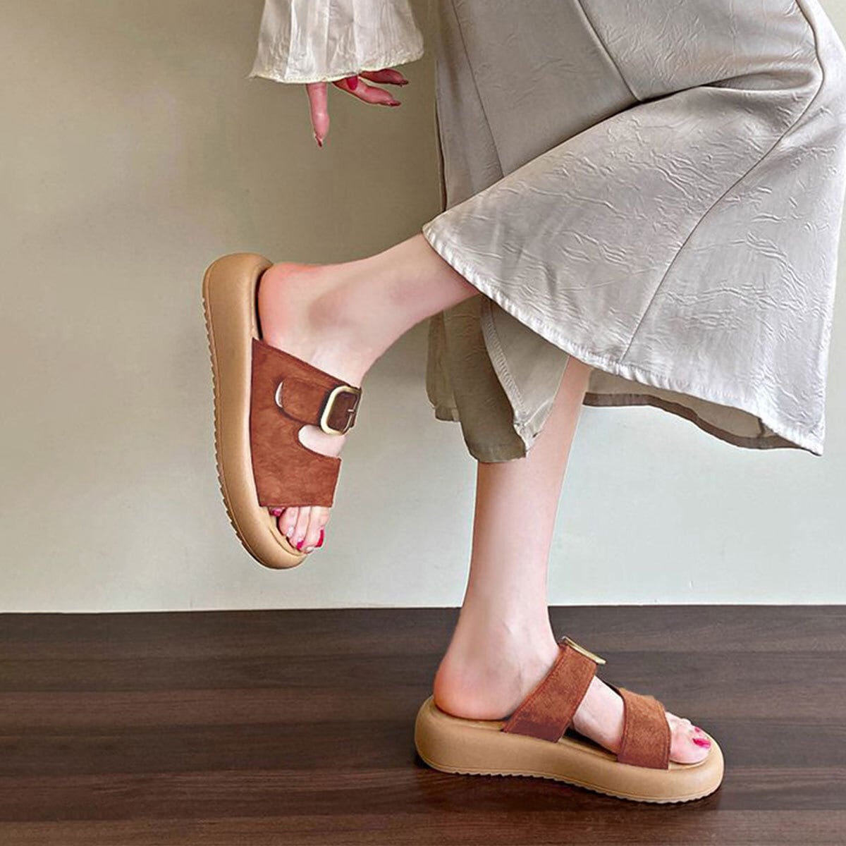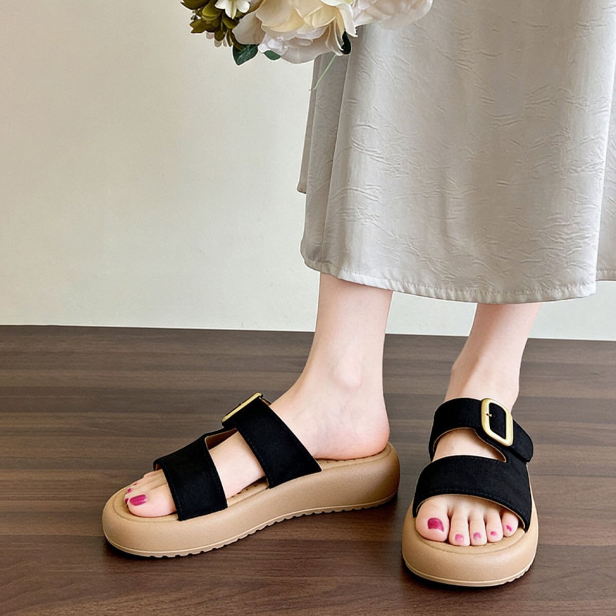 厚底のデザインがスタイルアップをもたらし、女性らしさを引き立たせてくれます。