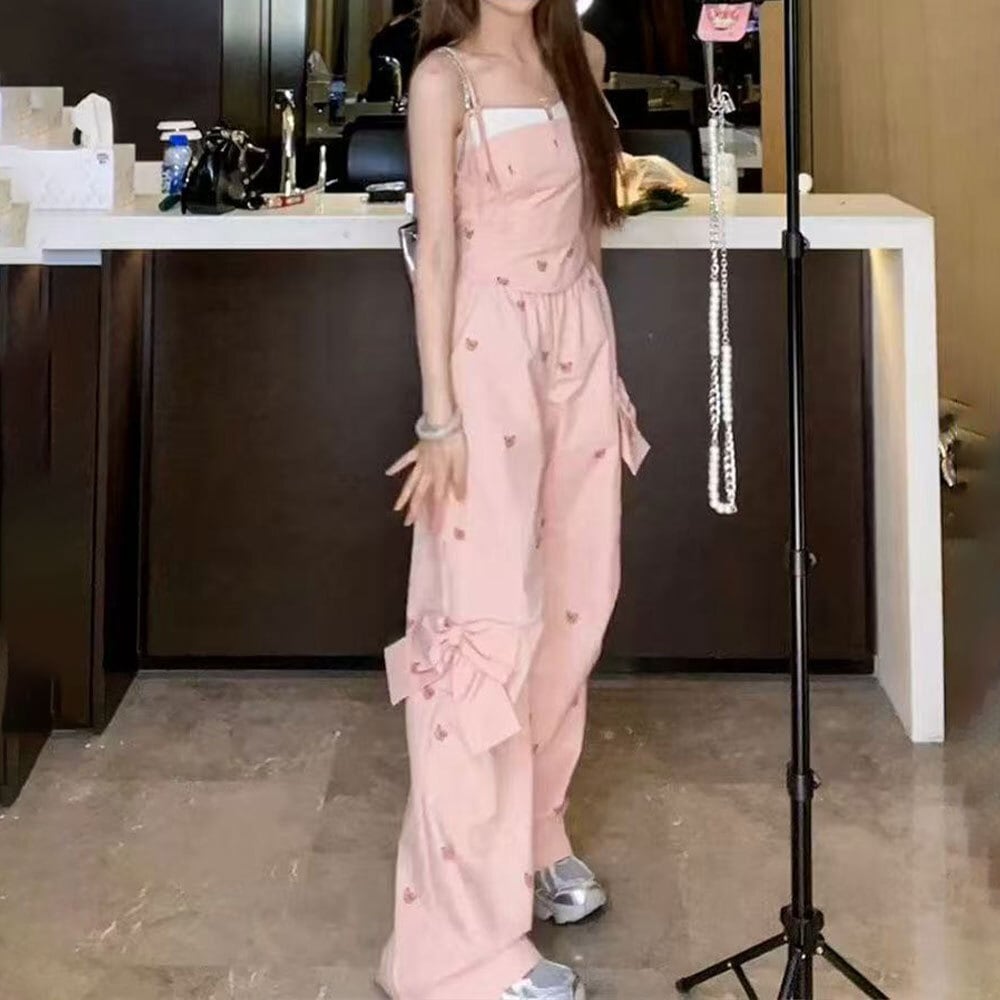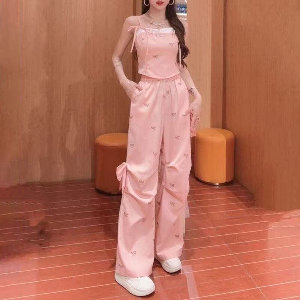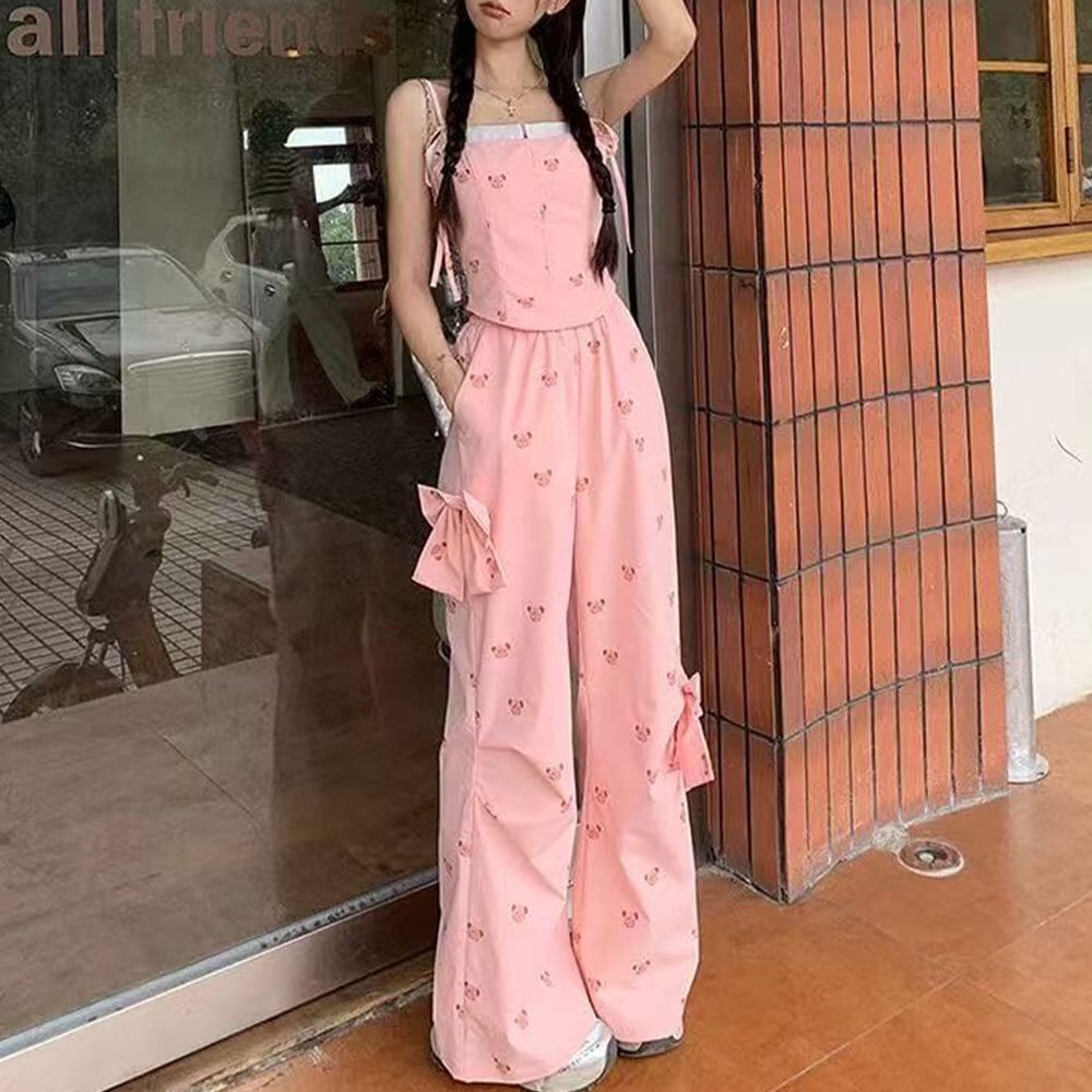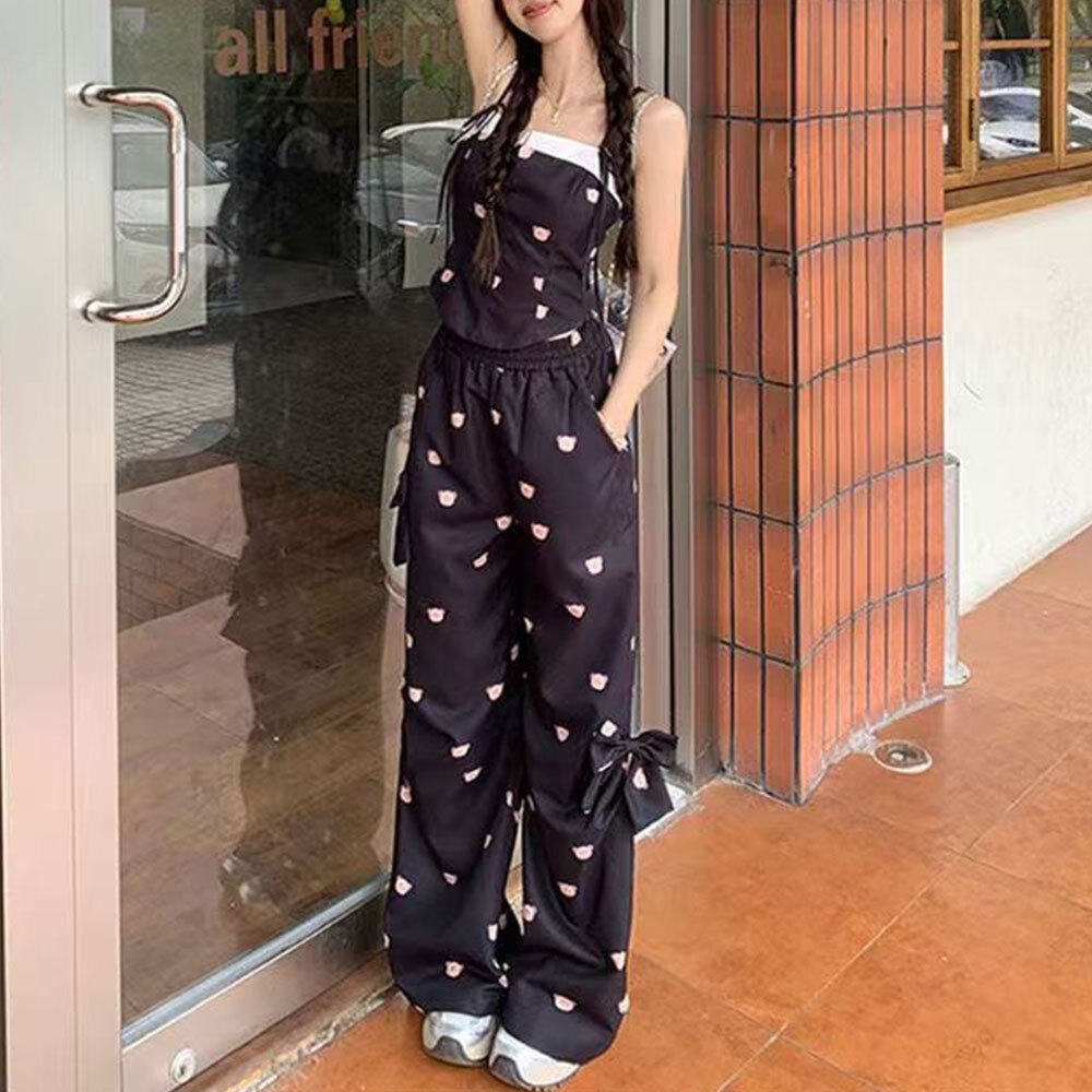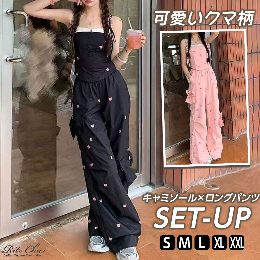 【送料無料】 キャミソール パンツ セットアップ クマ柄 レディース 春夏 韓国 上下セット 大人 かわいい フェミニン ガーリー きれいめ おしゃれ ゆったり 部屋着 ルームウェア リボン 大人可愛い 大人女子