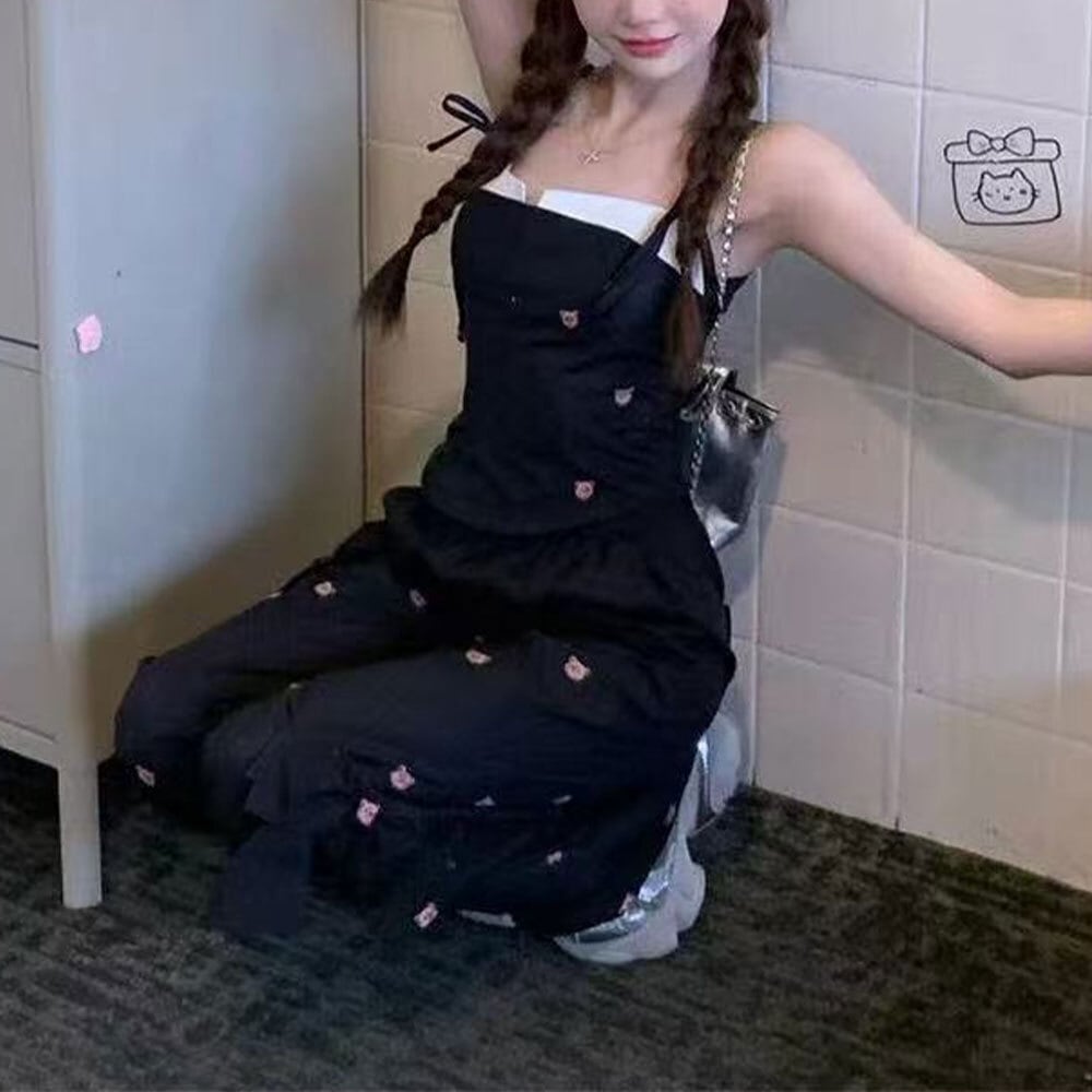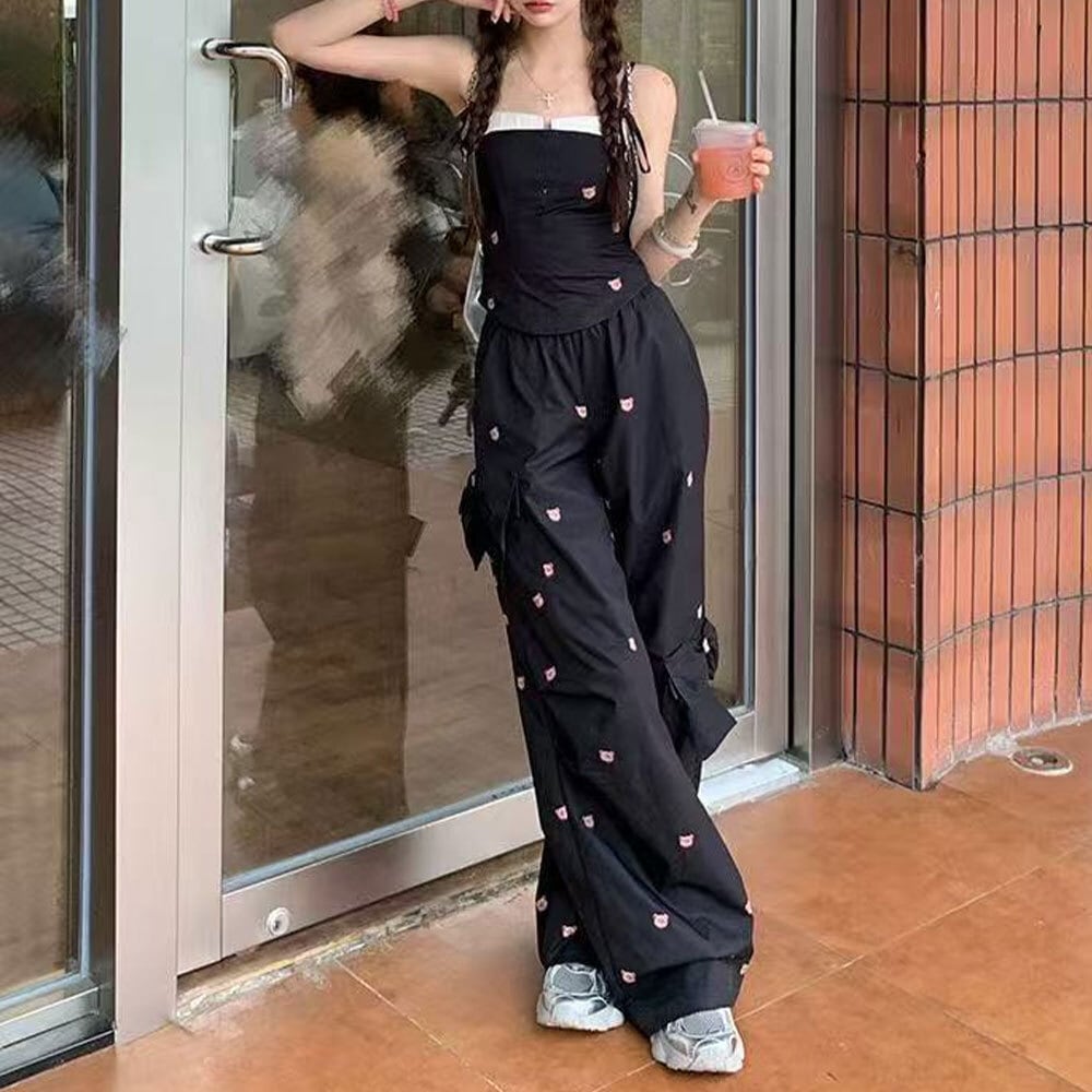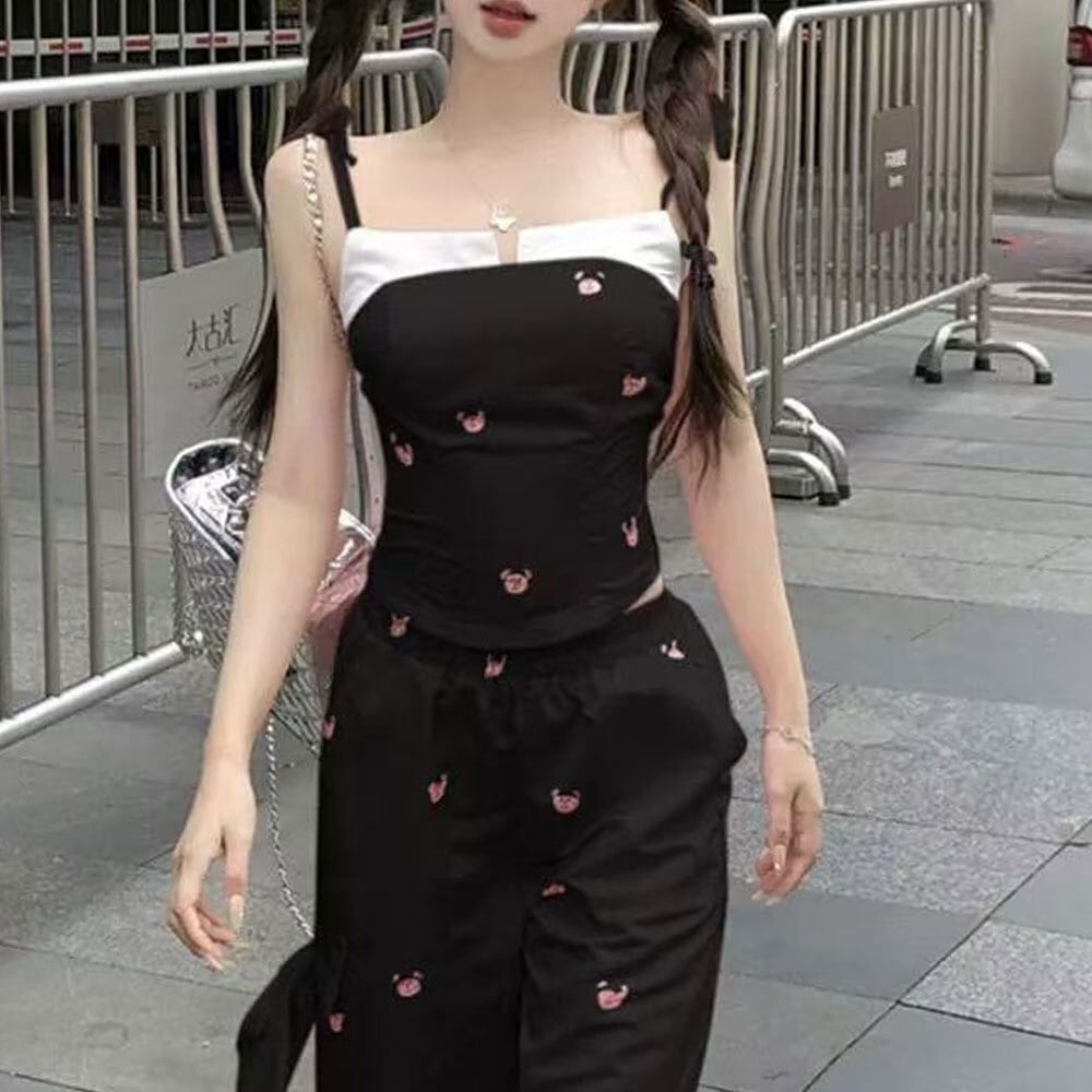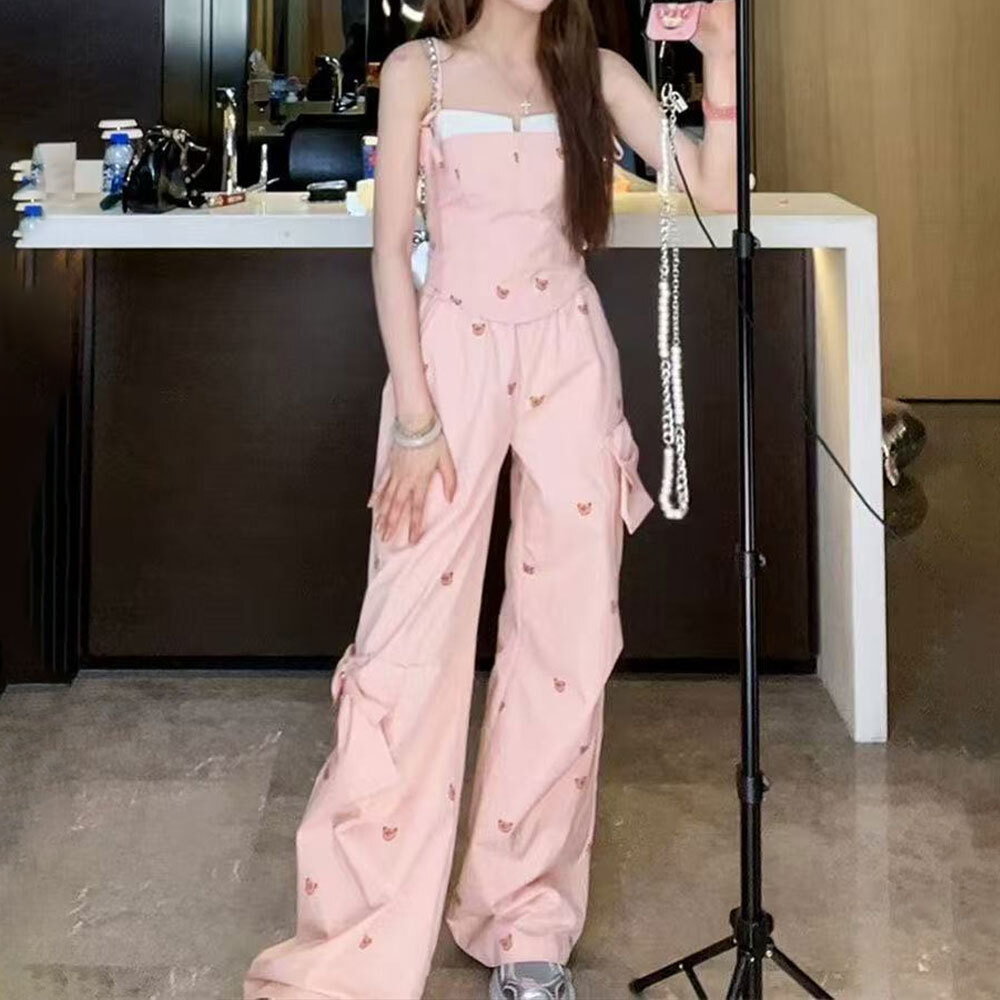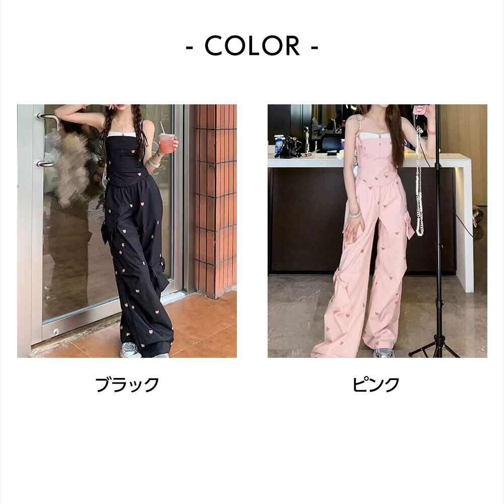 可愛らしいクマ柄のデザインがガーリーな印象を演出してくれる、キャミソールとロングパンツの上下セットアップです。