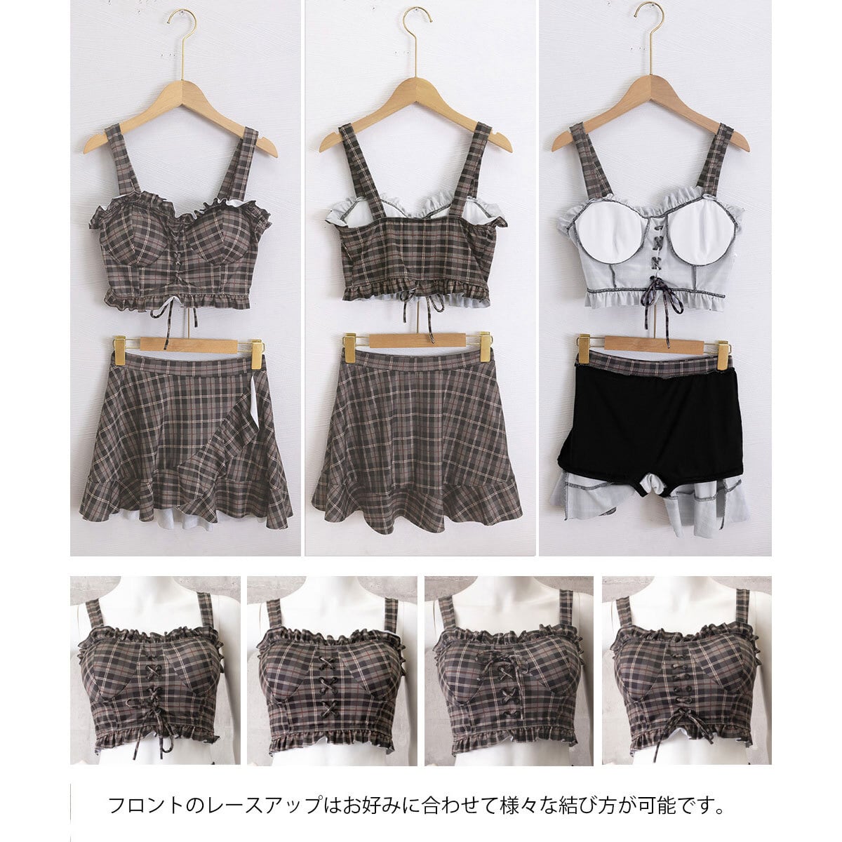 ◇ギンガムチェック柄のビスチェ水着上下セット。