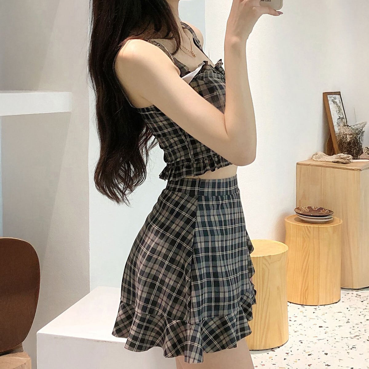 ハイウエストのミニスカートが、気になるお腹周りやヒップを自然にカバーし、女性らしさを引き立てつつ、露出は控えめながらセクシーさも演出してくれます。