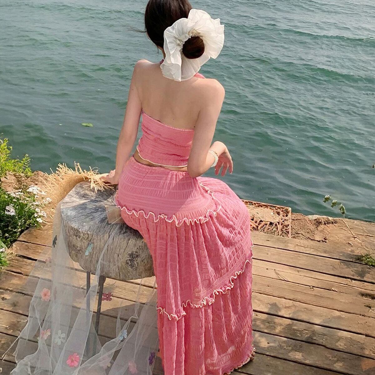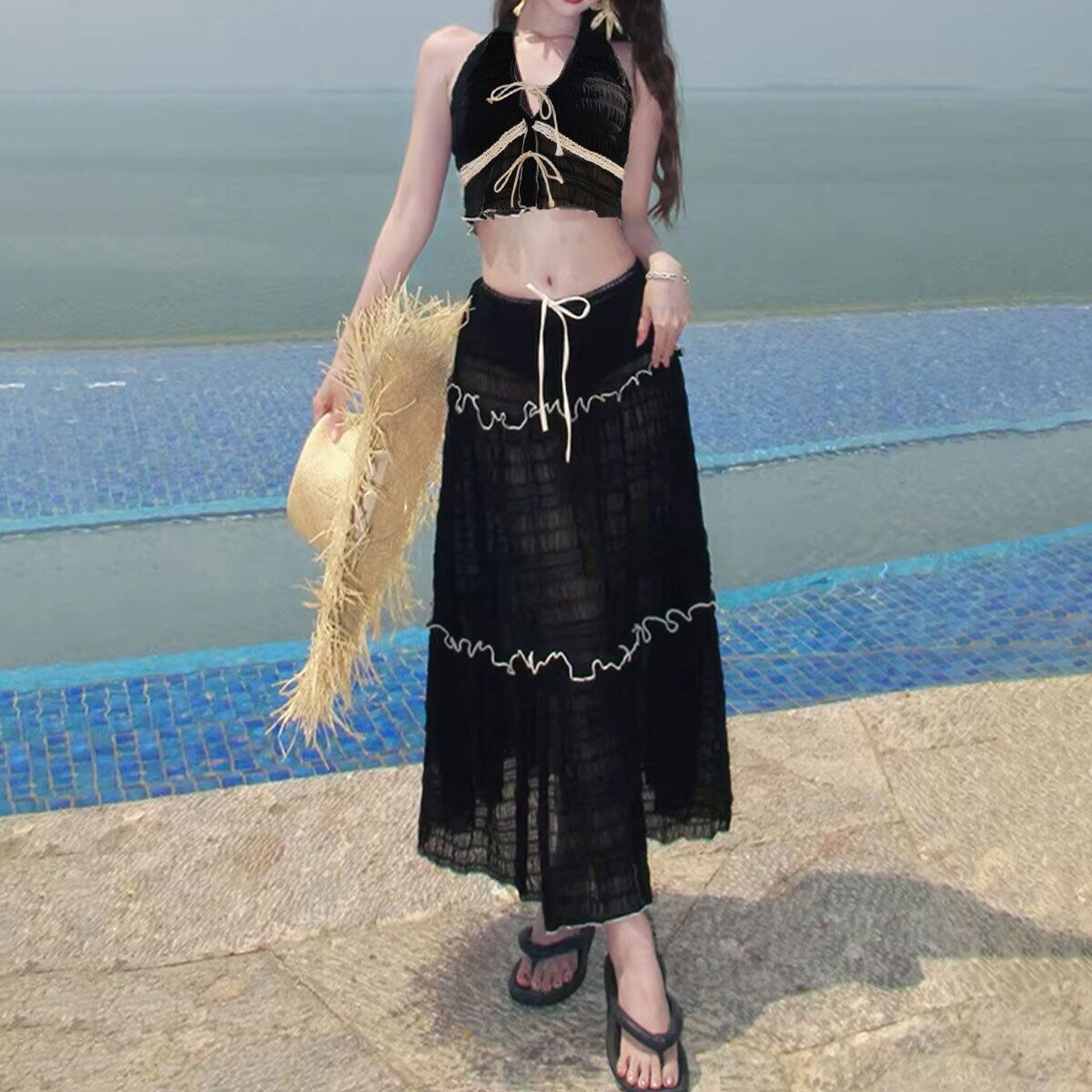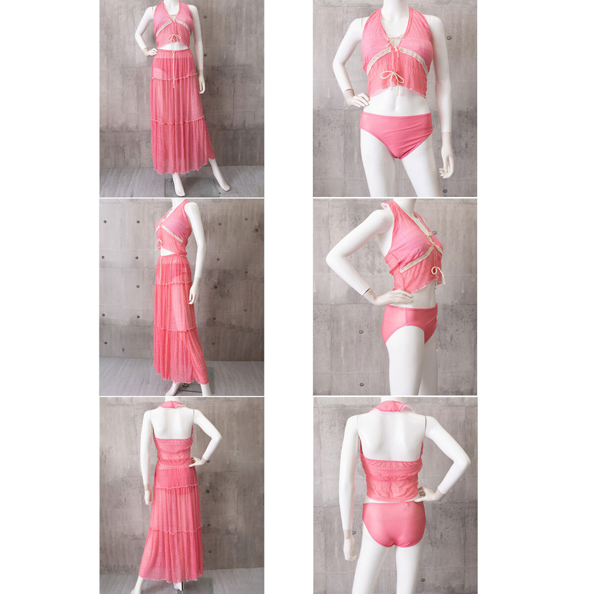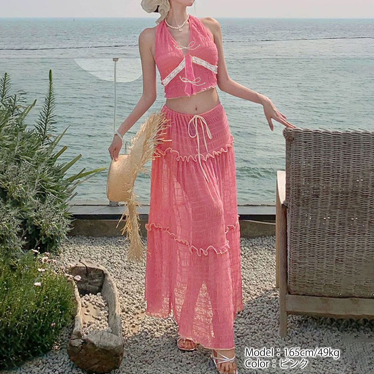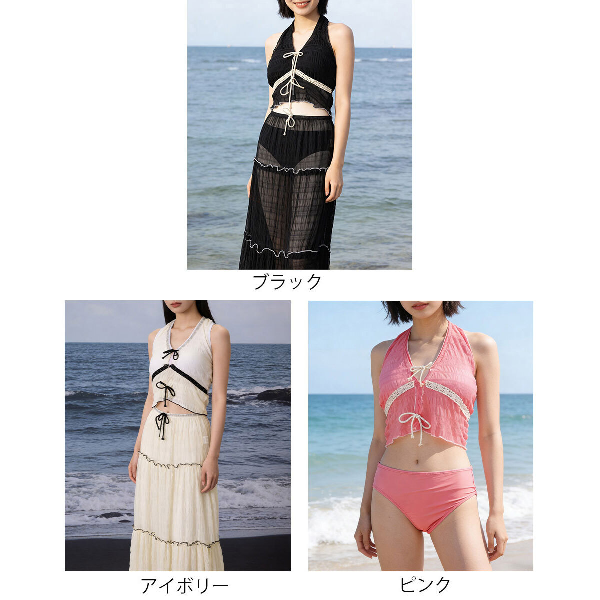 ホルターネックのトップブラと、ビキニパンツ、ロング丈のティアードスカートの3点がセットになった大人可愛いアイテムです。