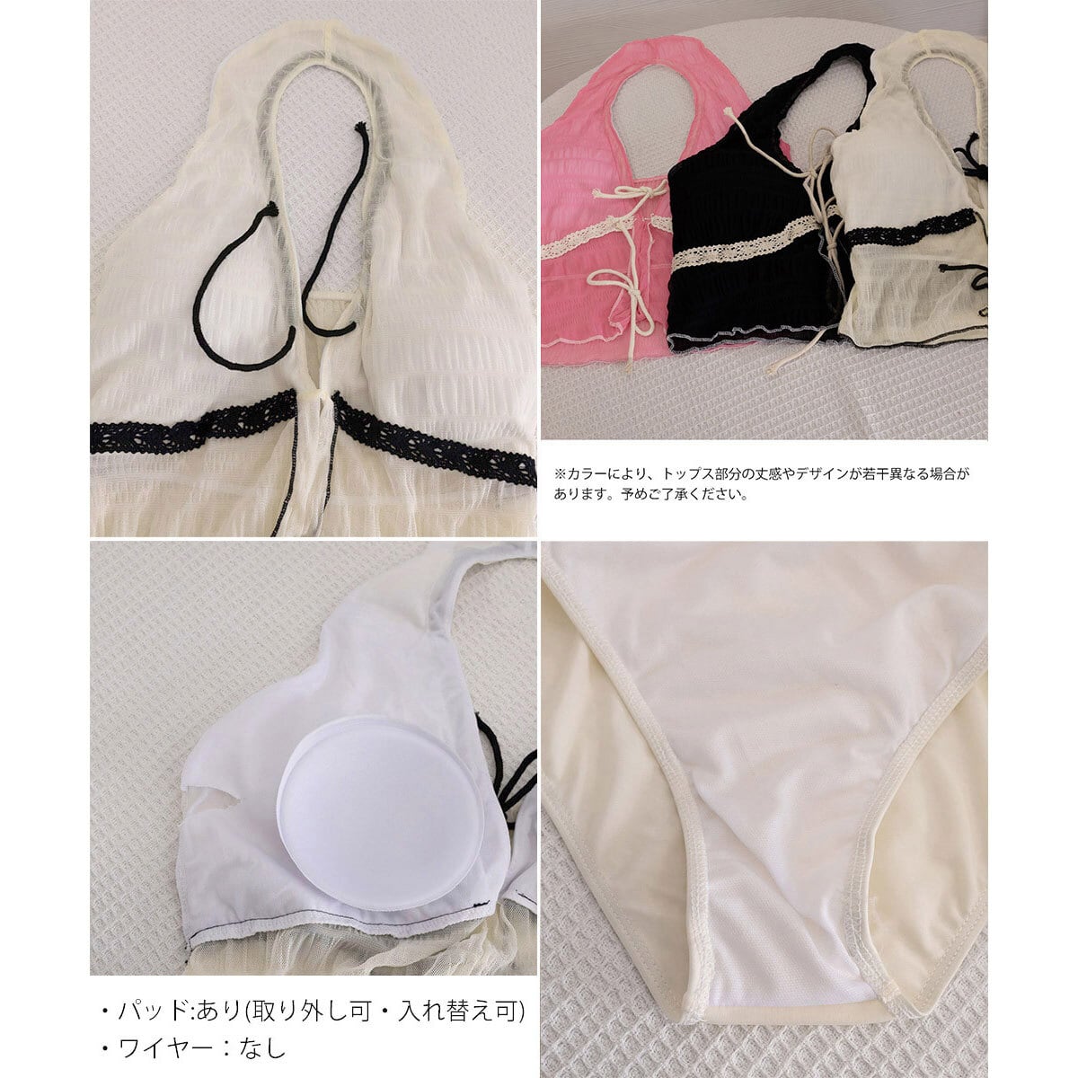 ホルターネックとリボンのデザインで、デコルテを綺麗に見えつつ、女性らしいフェミニンな印象を引き立ててくれるビキニ水着の3点セットです。