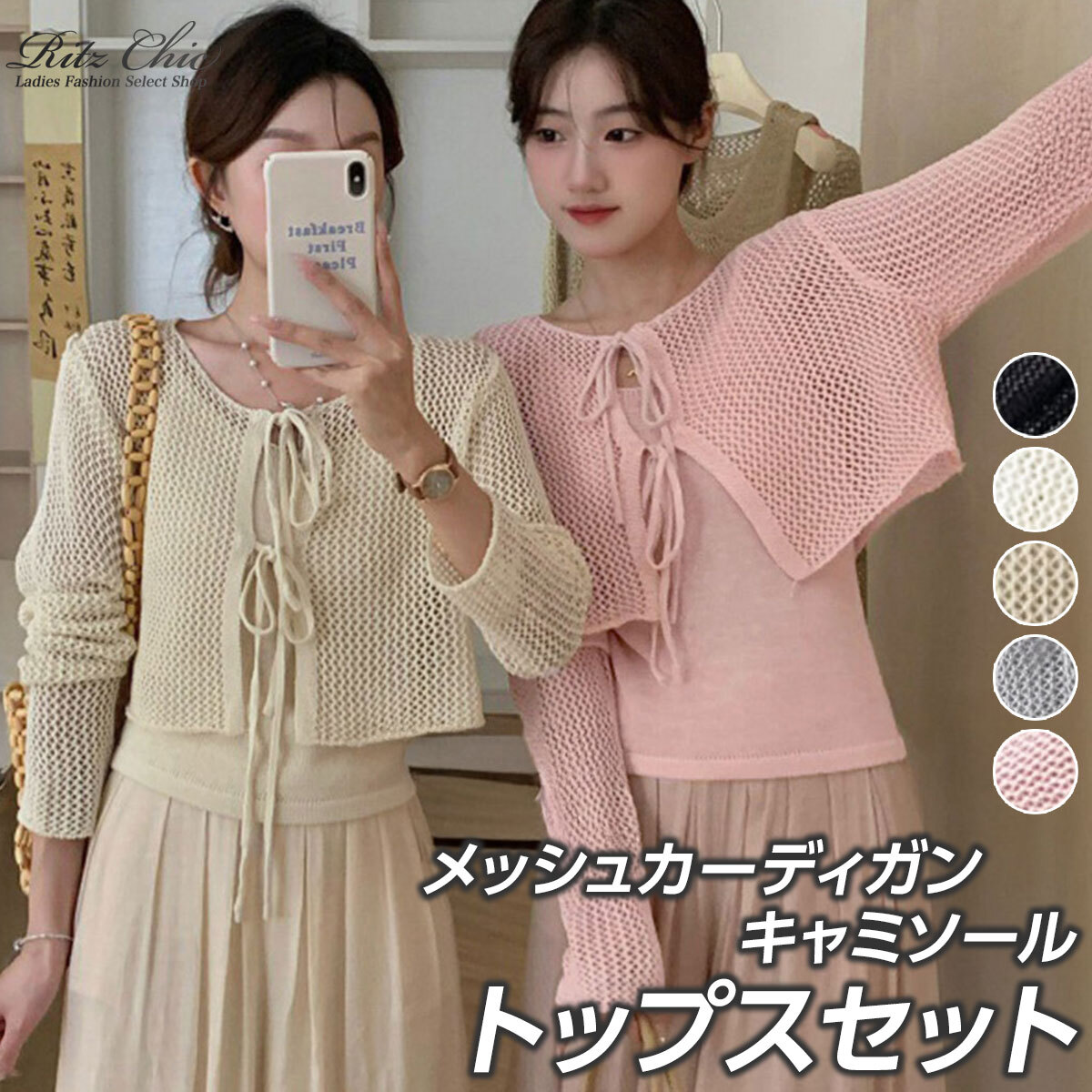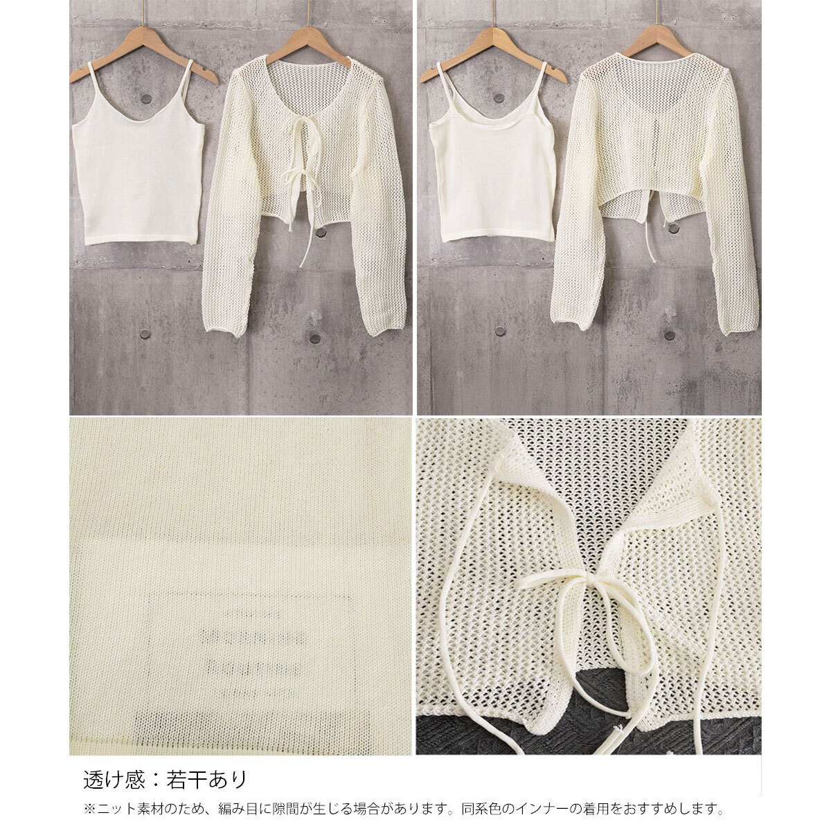 軽やかなメッシュ素材のカーディガンと、シンプルな無地デザインのキャミソールがセットになった、レディーストップスの2点セットです。