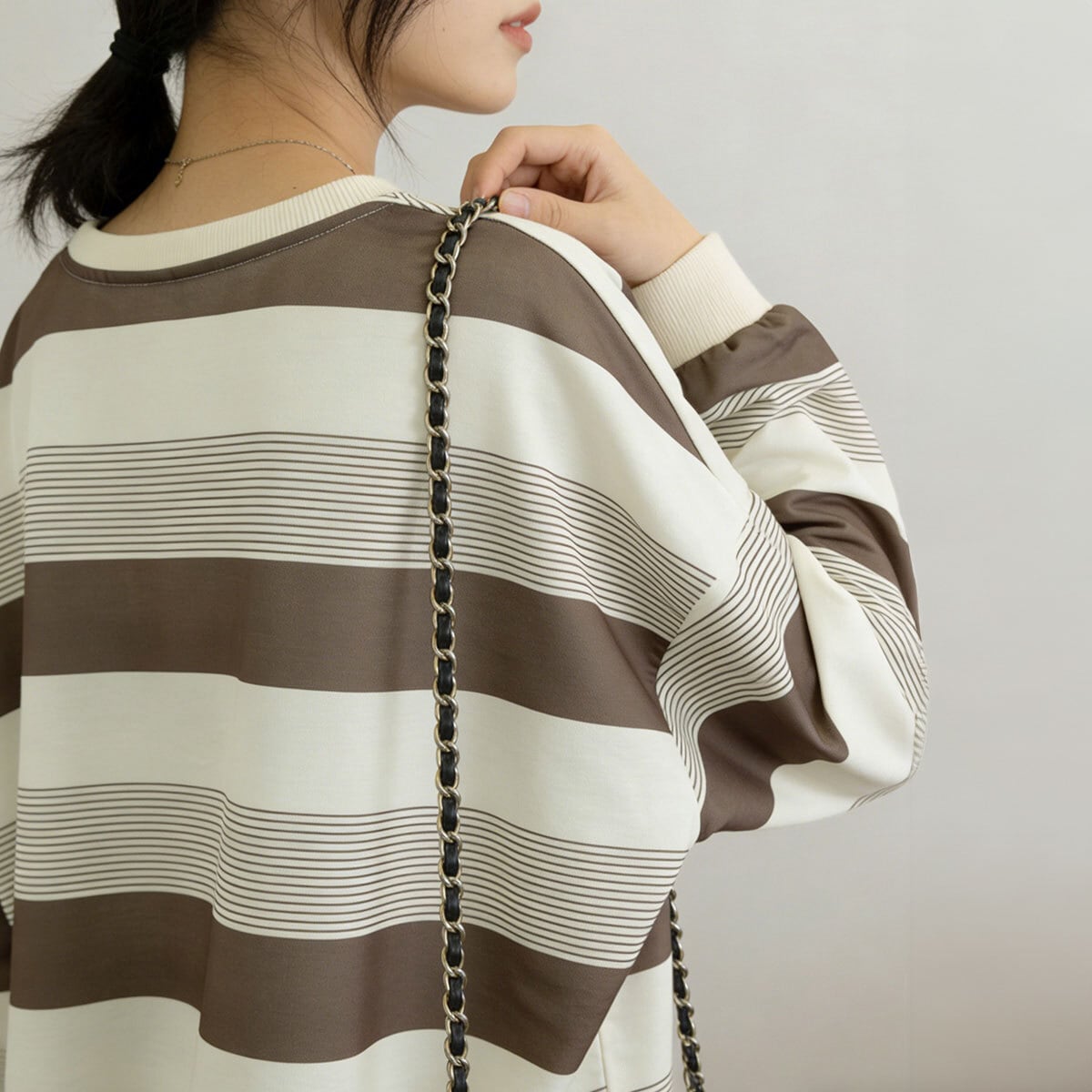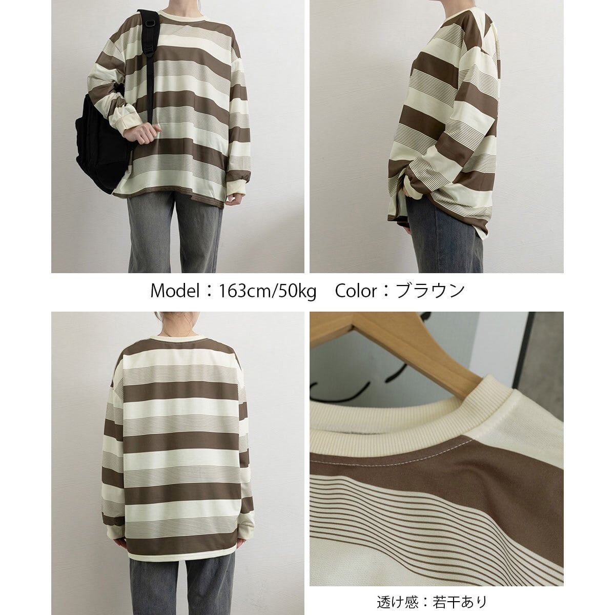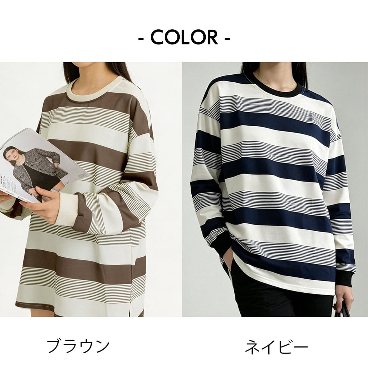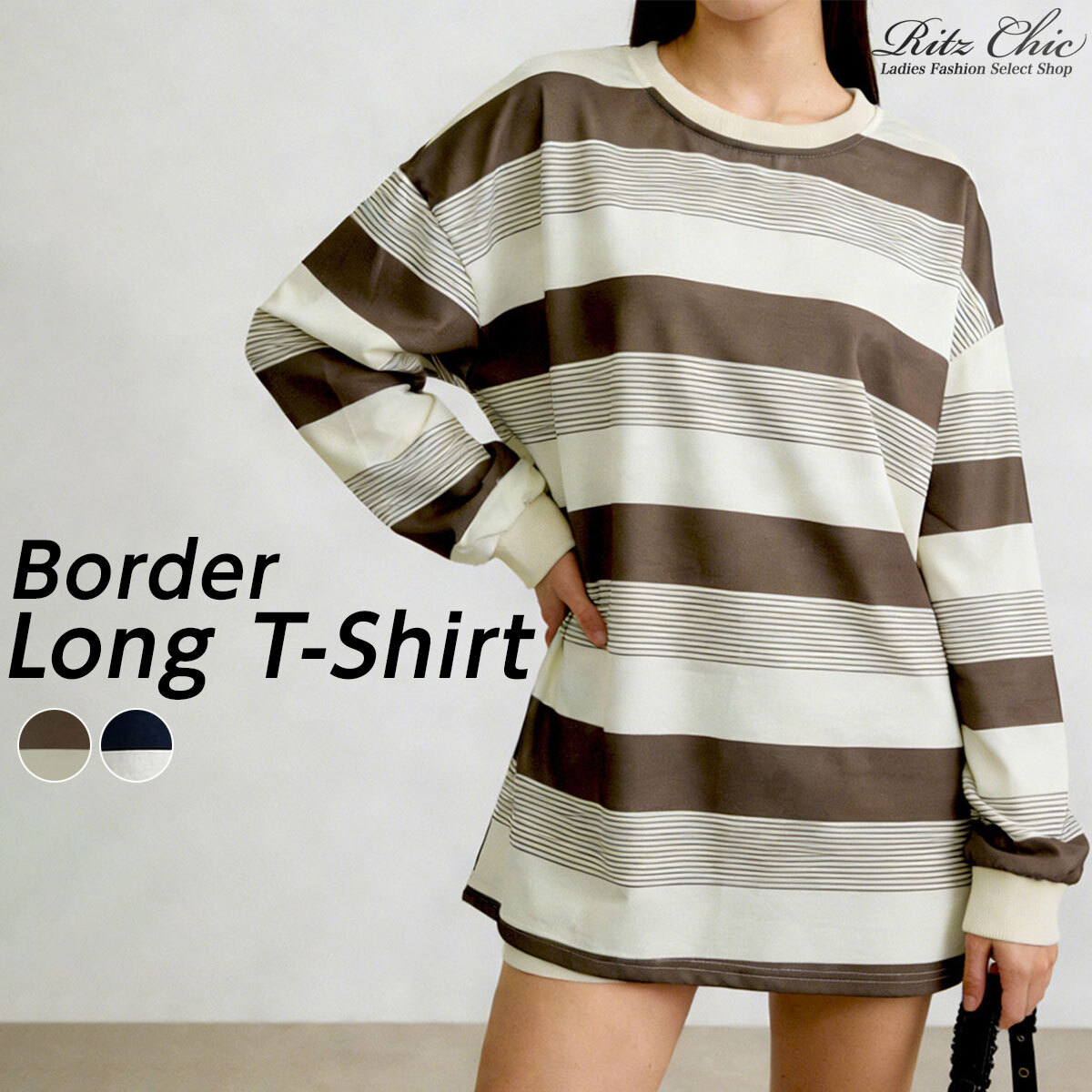 ゆったりとしたシルエットに、ボーダー柄のデザインで、カジュアルでありながらも大人女子らしいこなれ感を演出してくれる長袖のロングTシャツです。