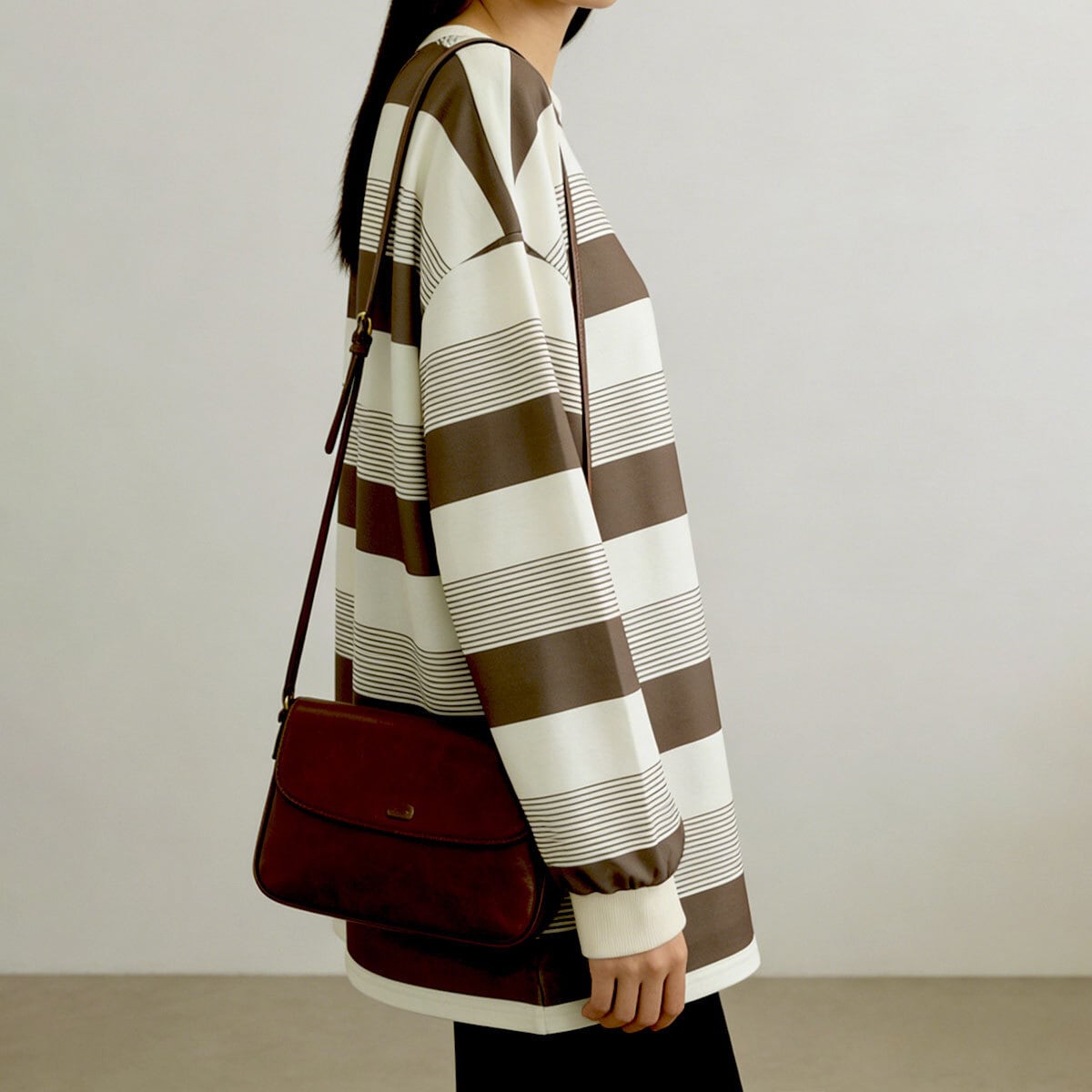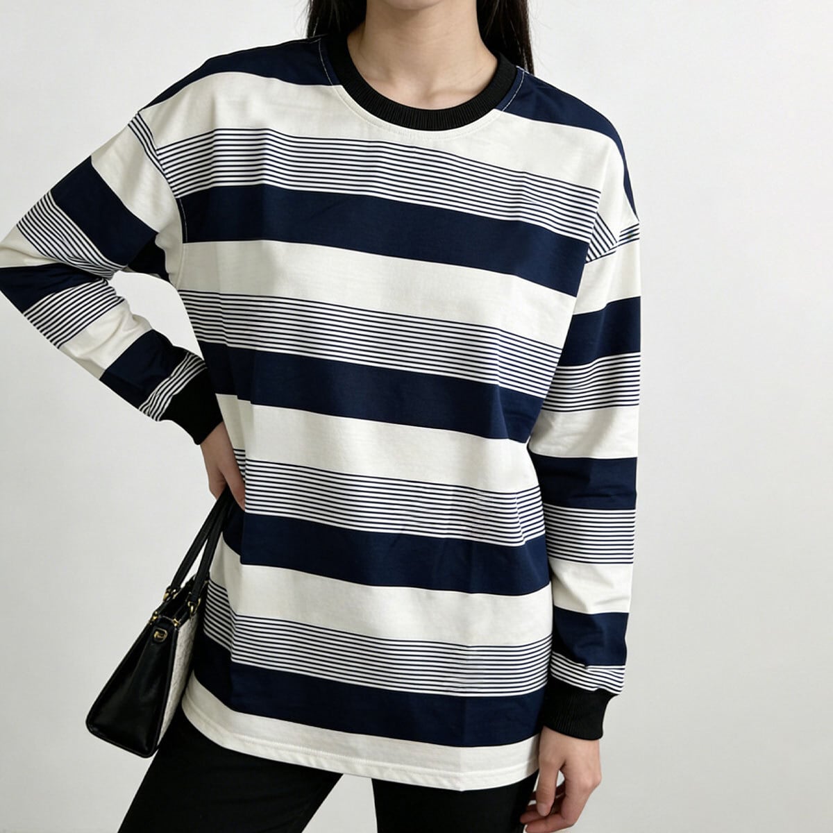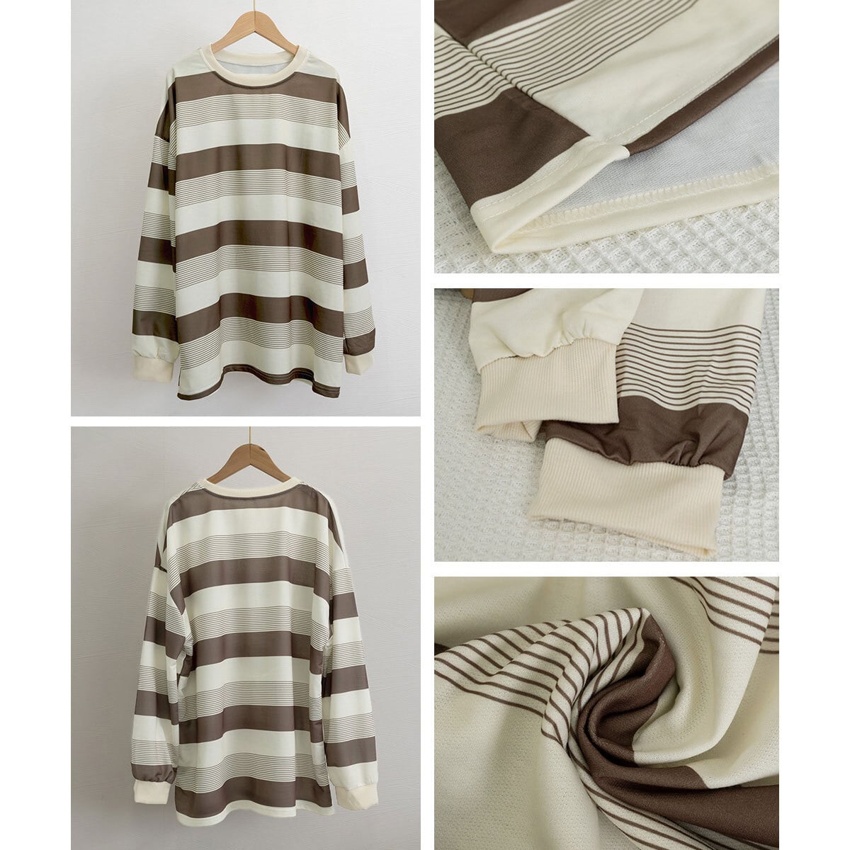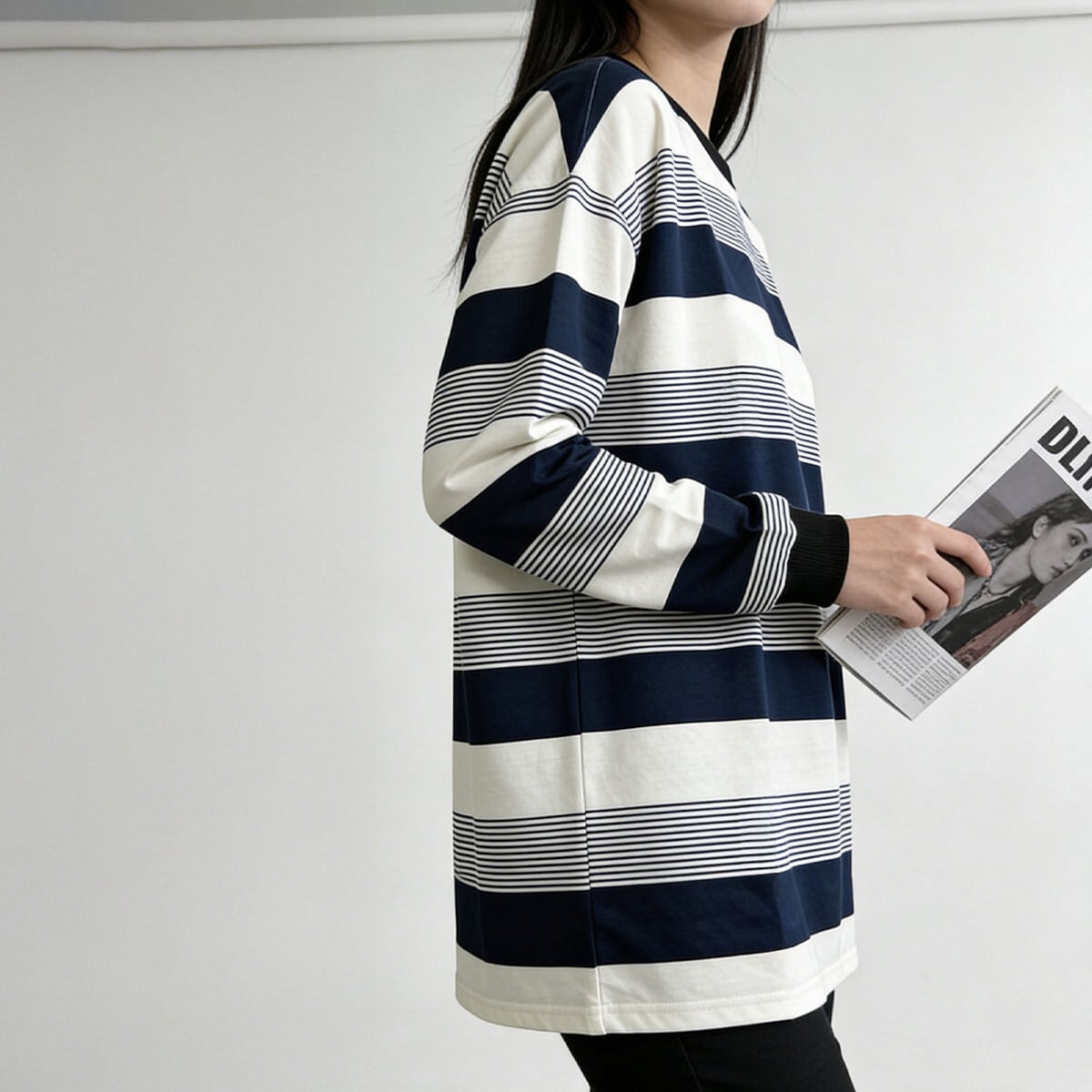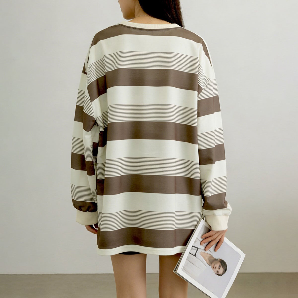 ゆったりとしたシルエットに、ボーダー柄のデザインで、カジュアルでありながらも大人女子らしいこなれ感を演出してくれる長袖のロングTシャツです。
