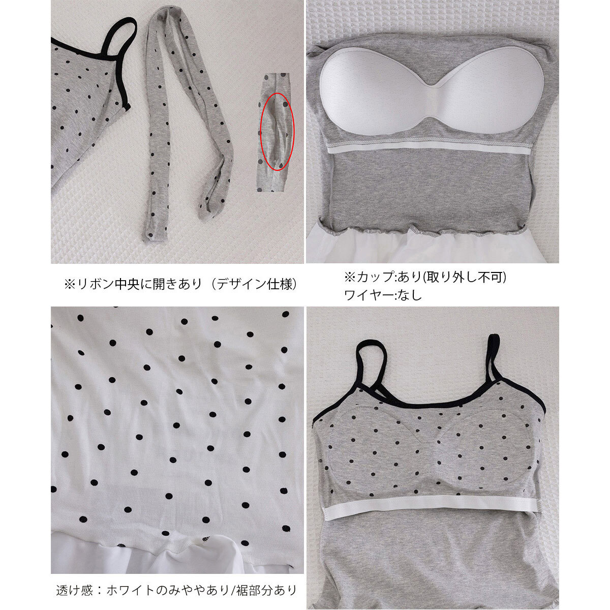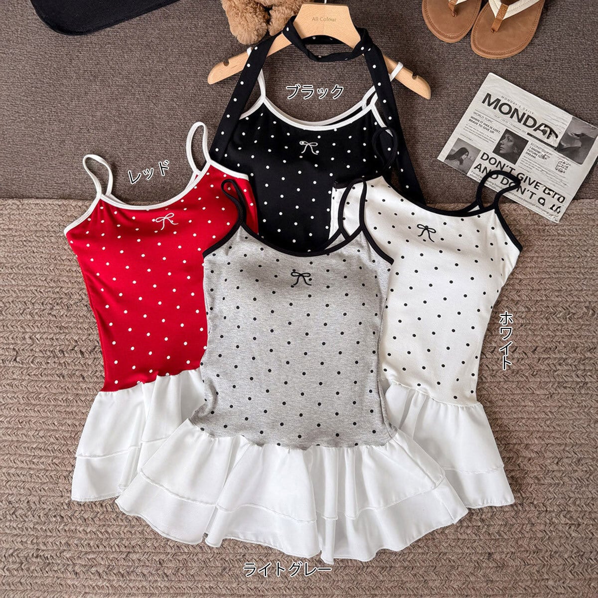 ドット柄のデザインにフリルティアードが、女性らしさをフェミニンな印象を演出してくれるカップ付きのキャミソールです。