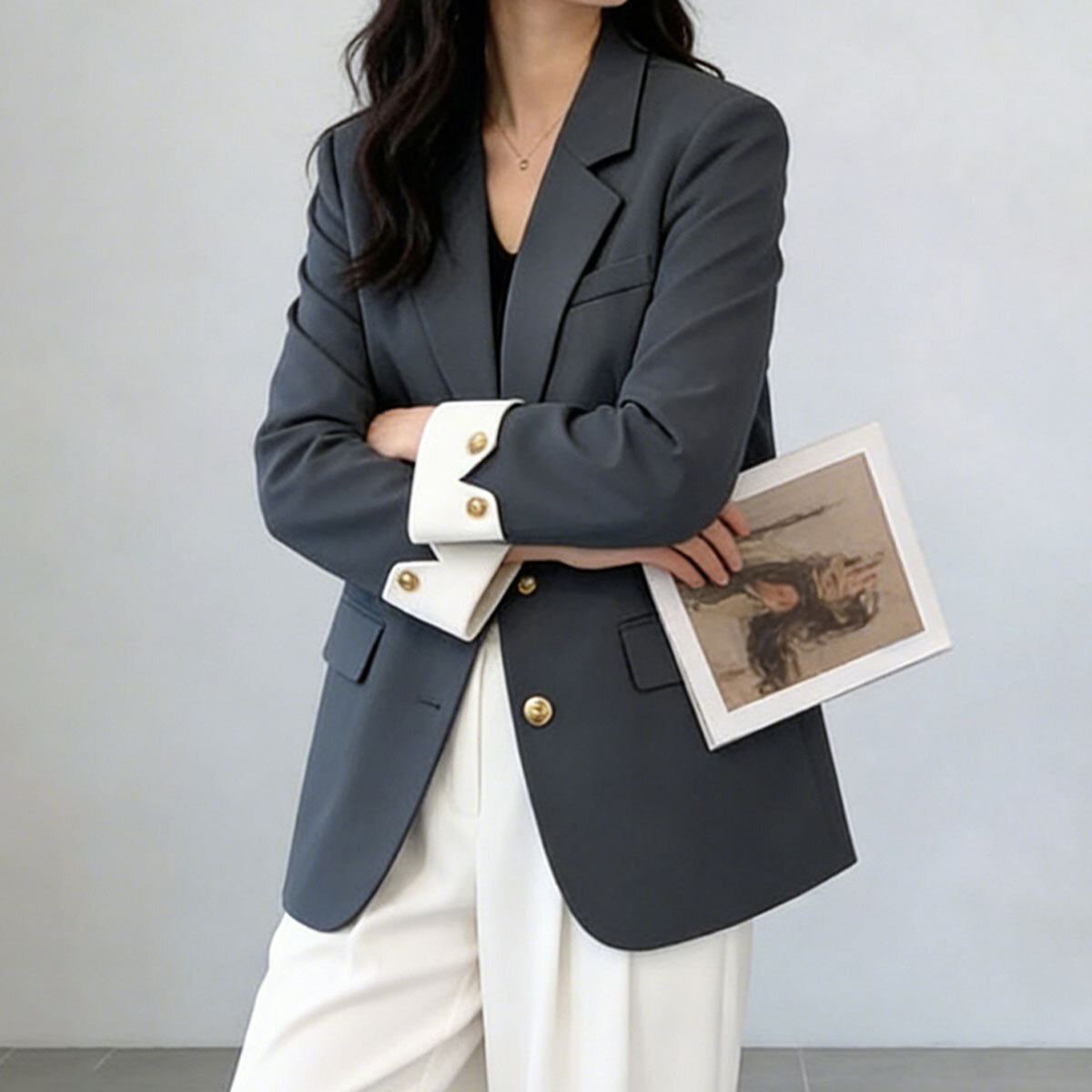 上品な金ボタンがアクセントになった、きれいめで洗練されたデザインのテーラードジャケットです。