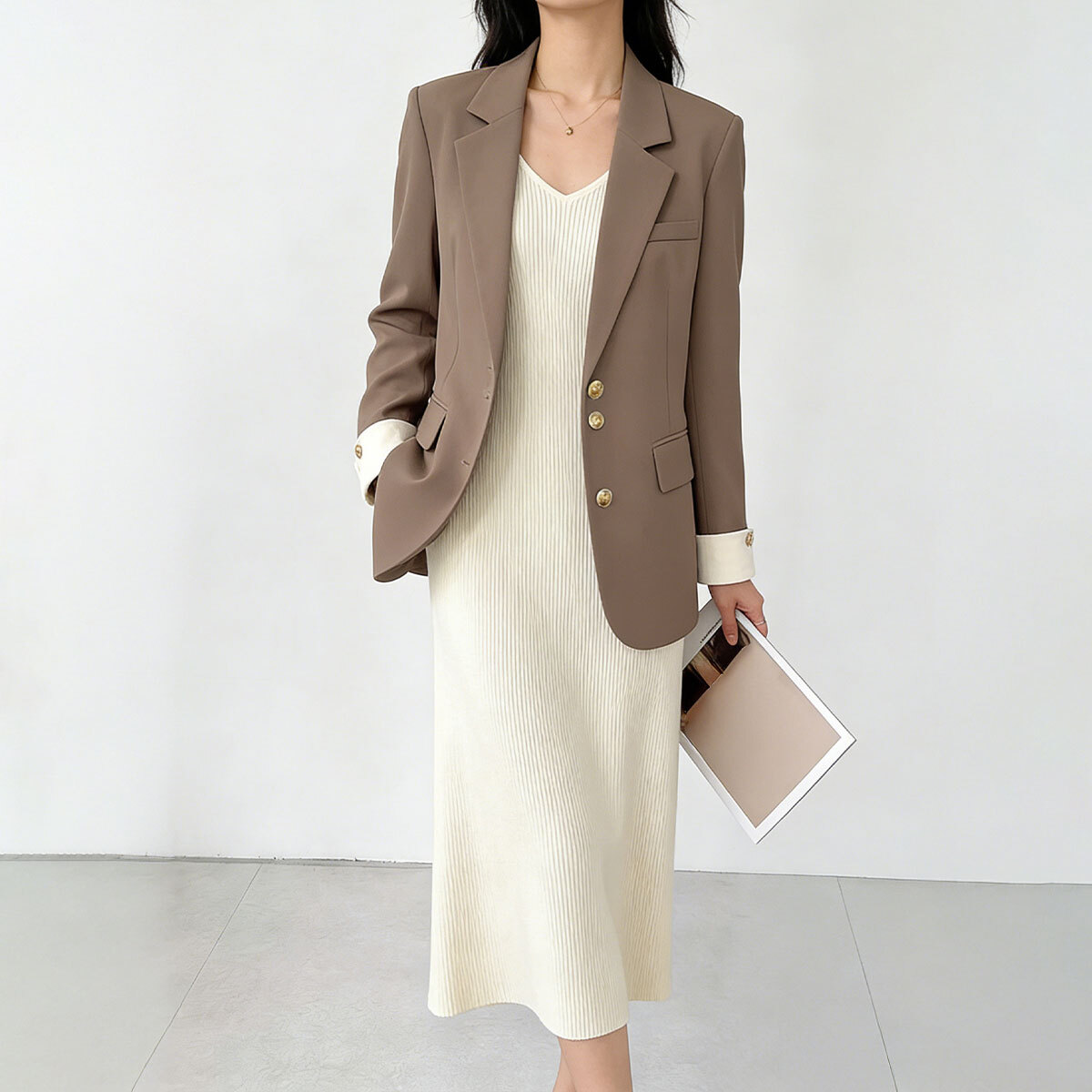 薄い肩パッドが入っているので自然に肩ラインを整え、スタイルを美しく綺麗に見せてくれます。